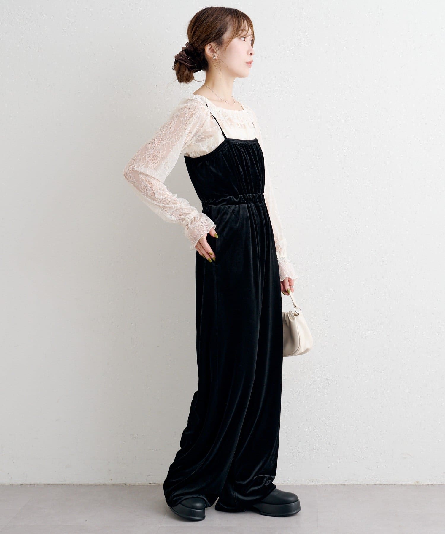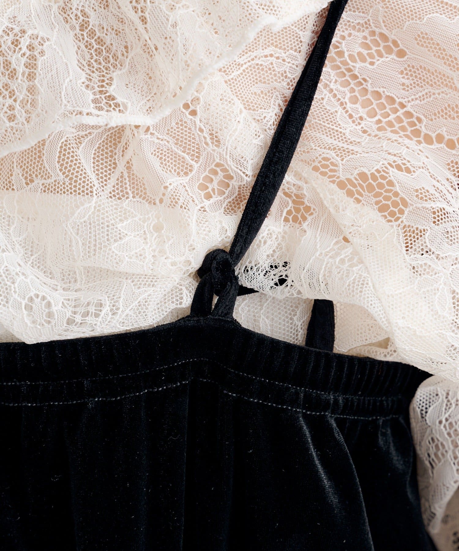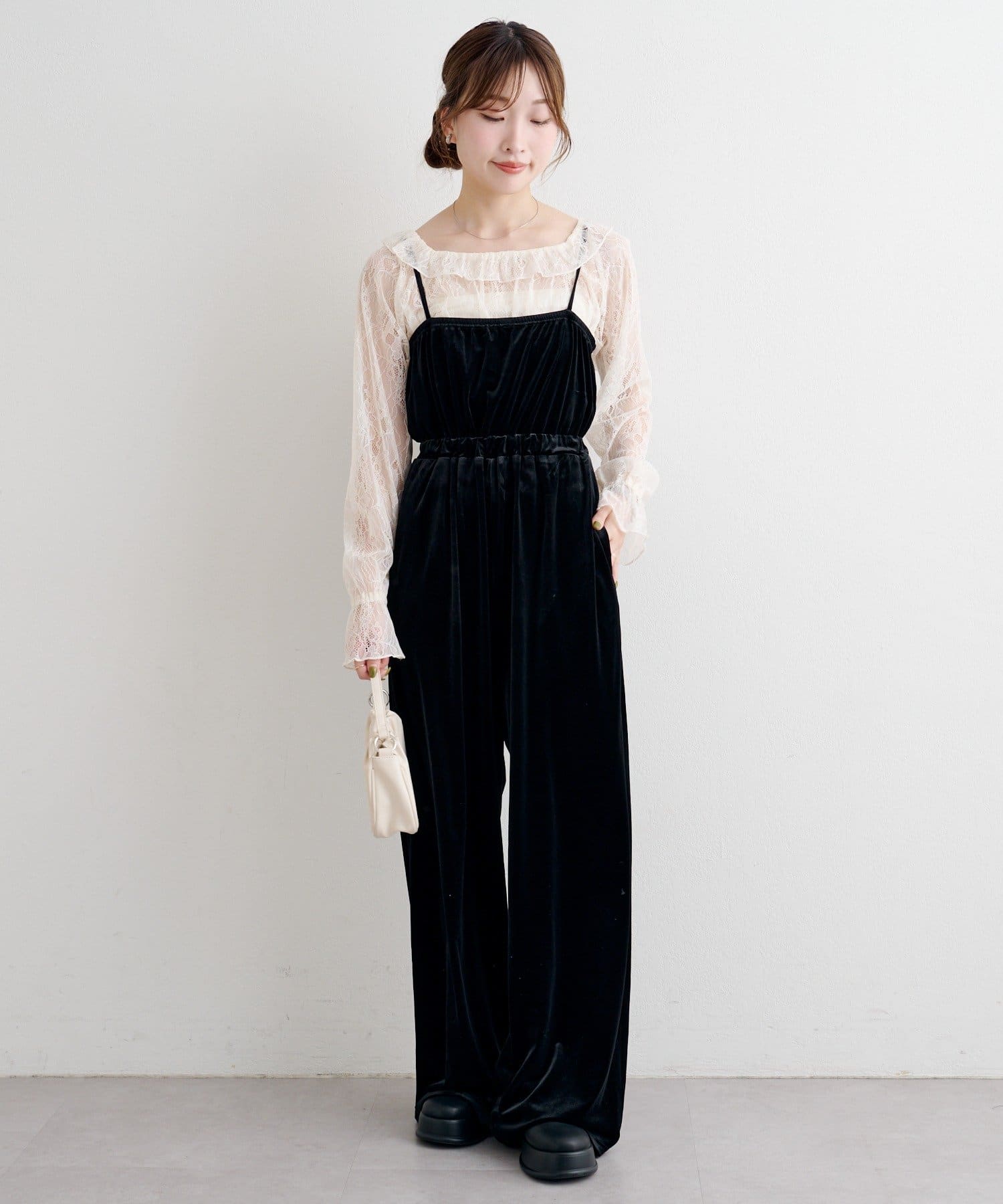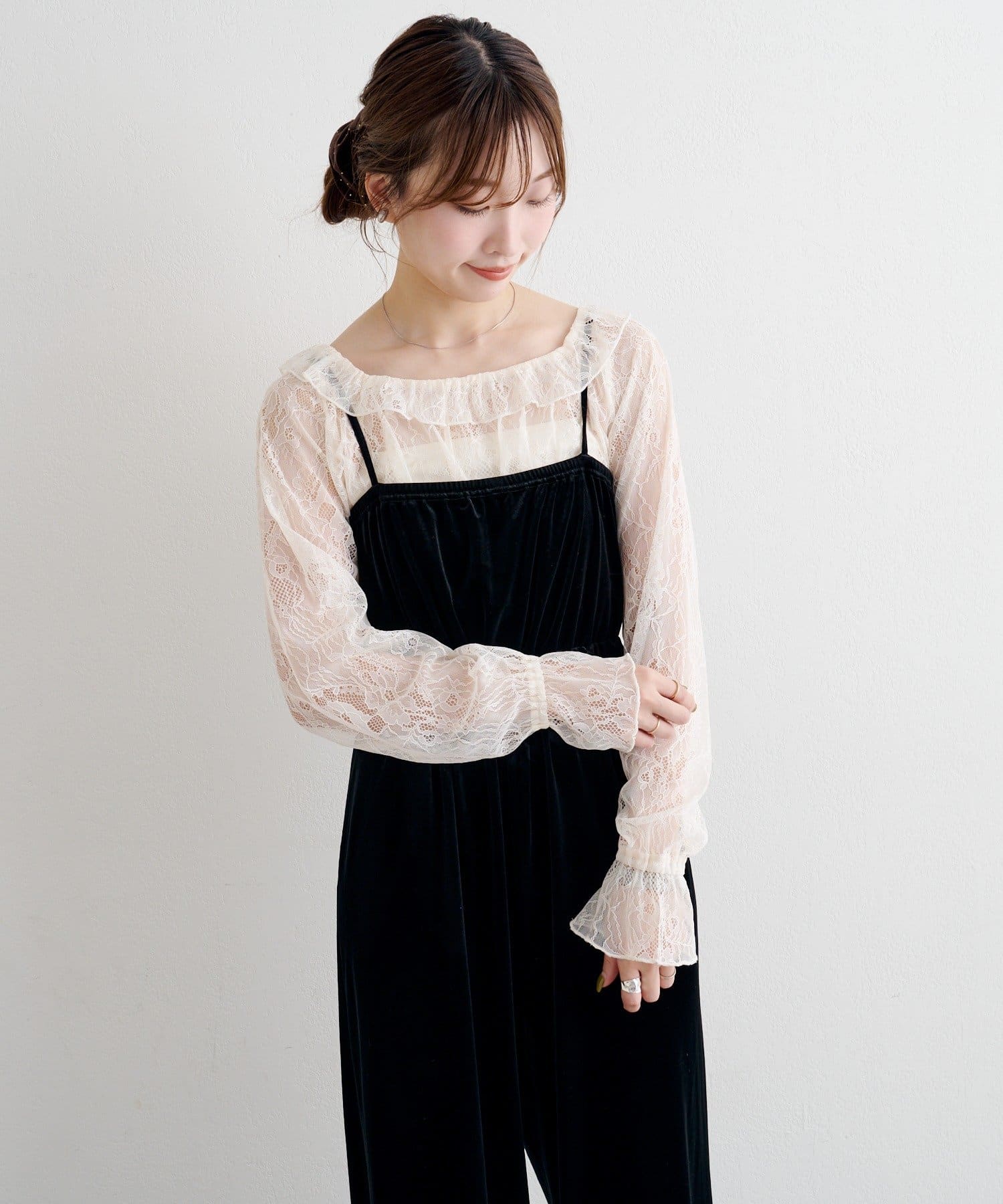 レーストップスとベロアコンビネゾンがセットになった、華やかさと上品さを兼ね備えたアイテム。