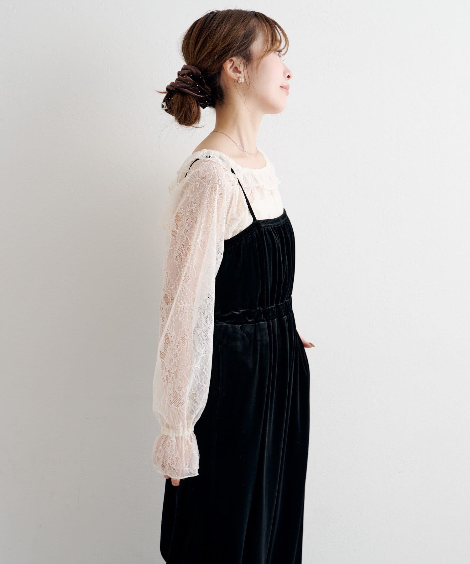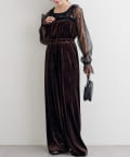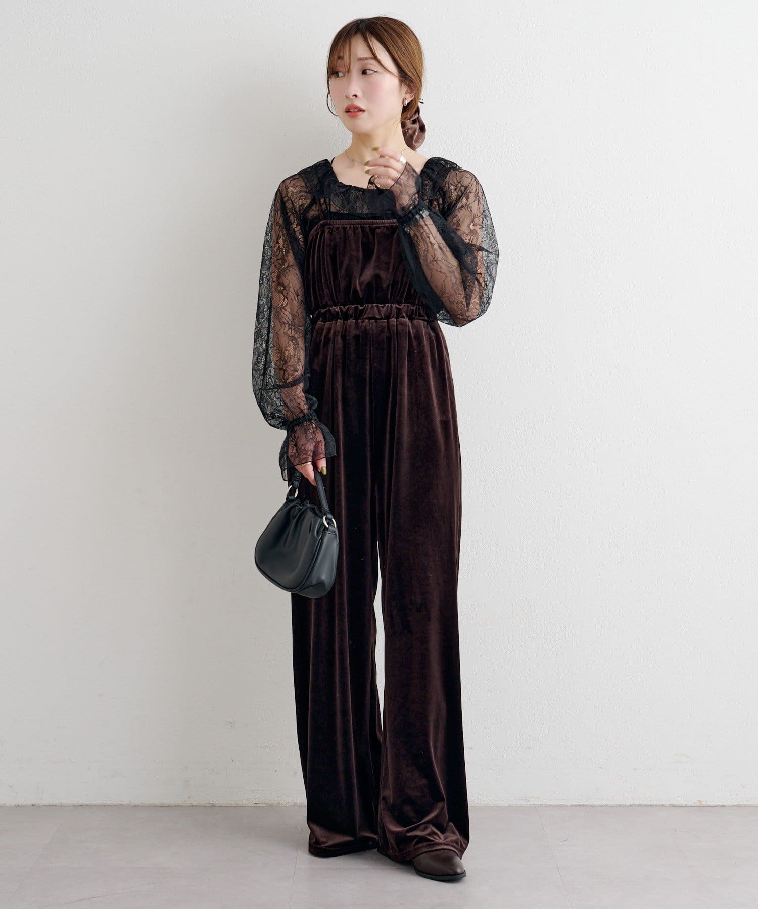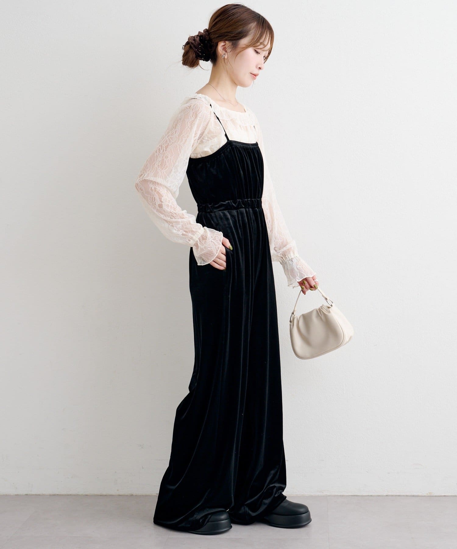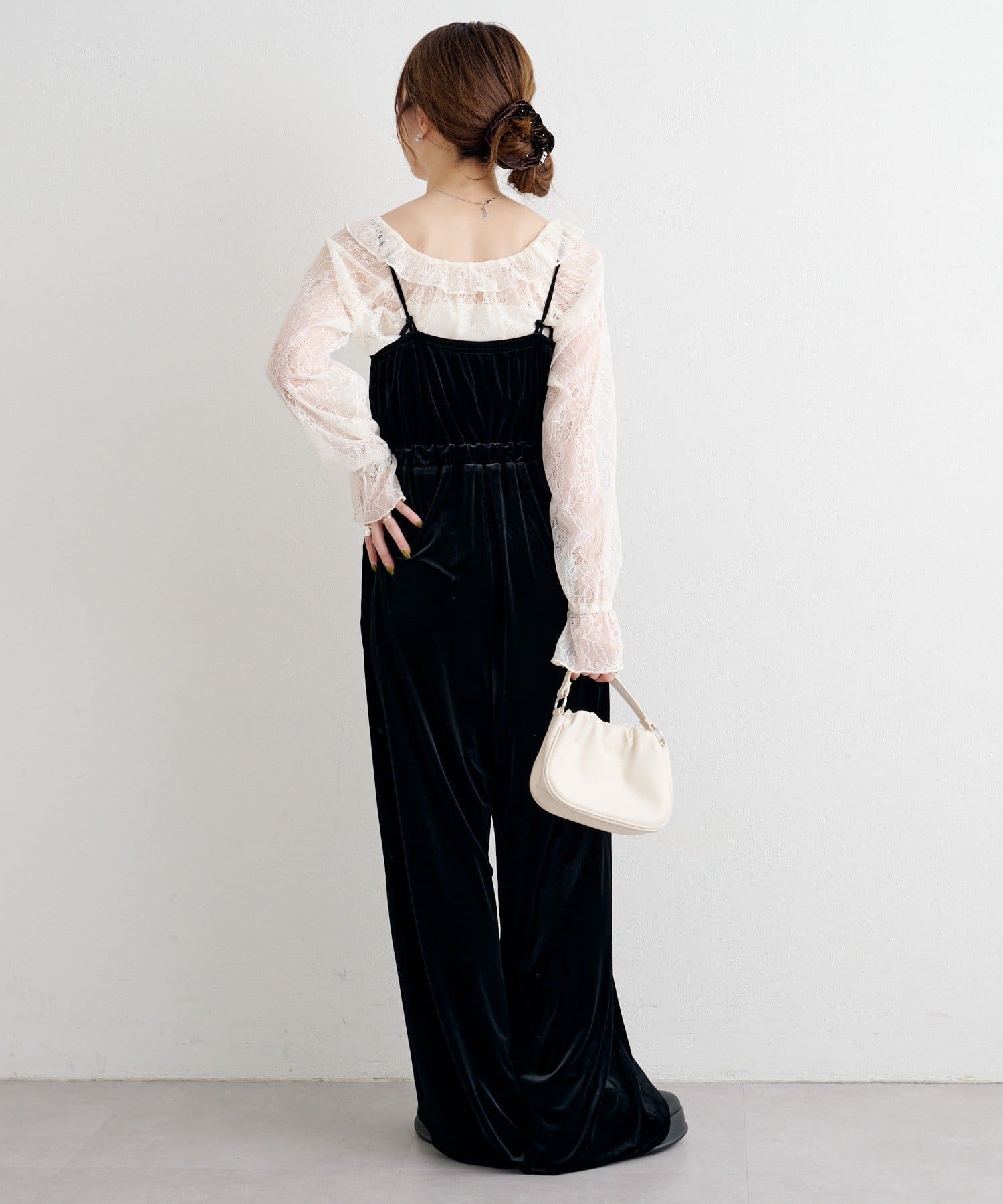 レーストップスとベロアコンビネゾンがセットになった、華やかさと上品さを兼ね備えたアイテム。