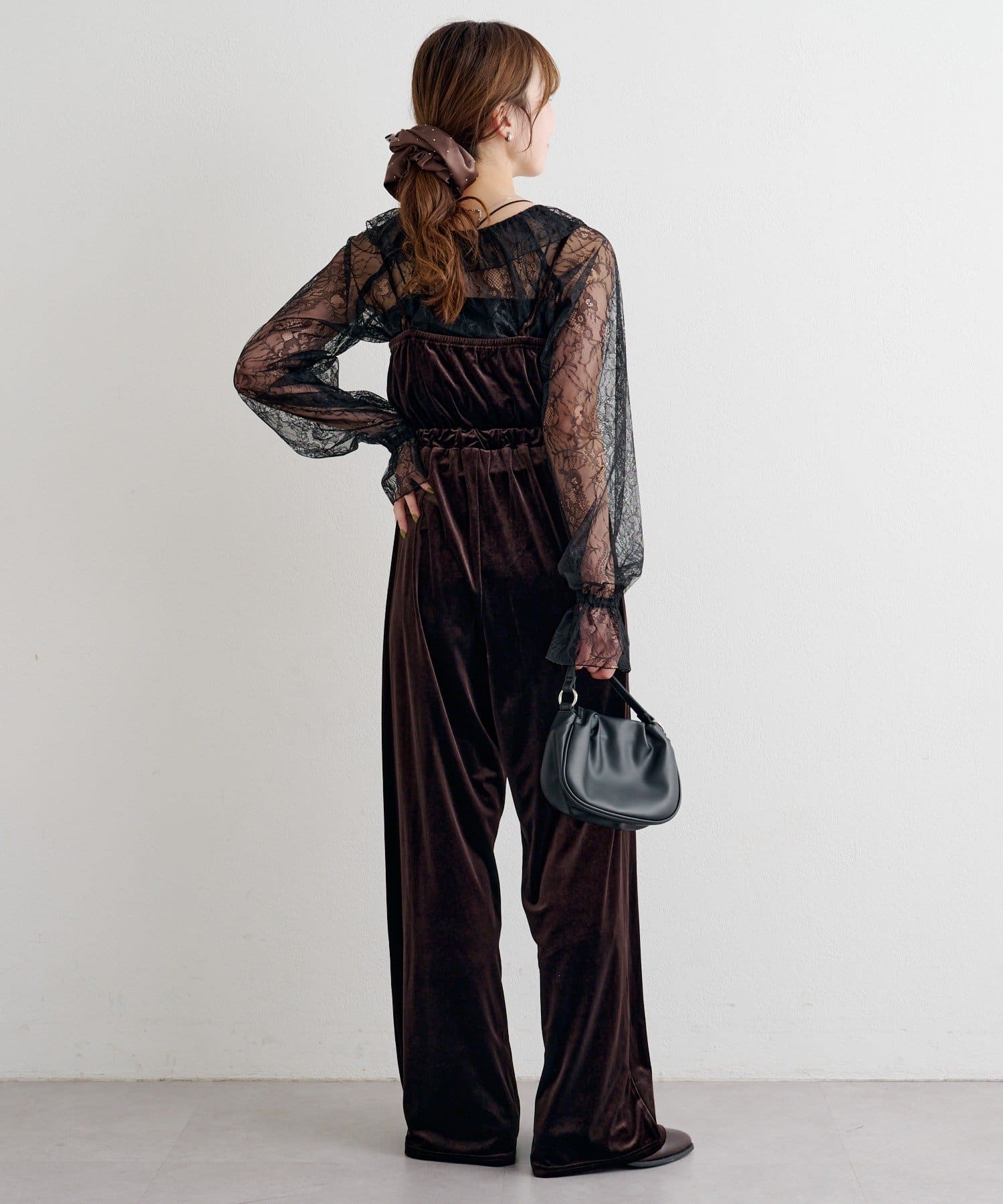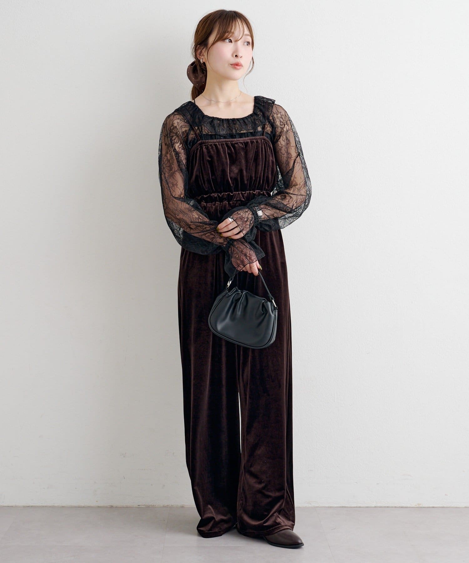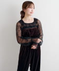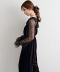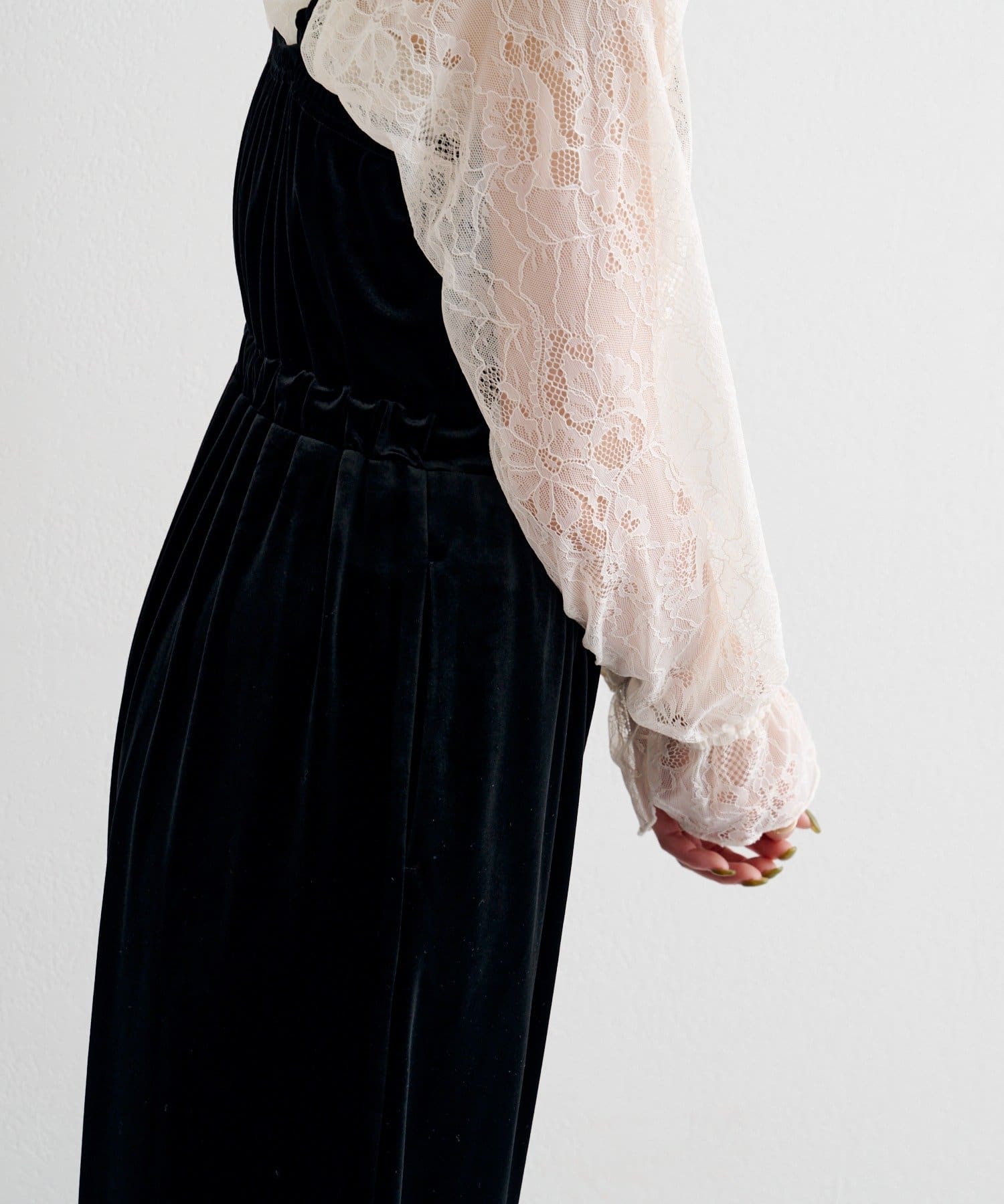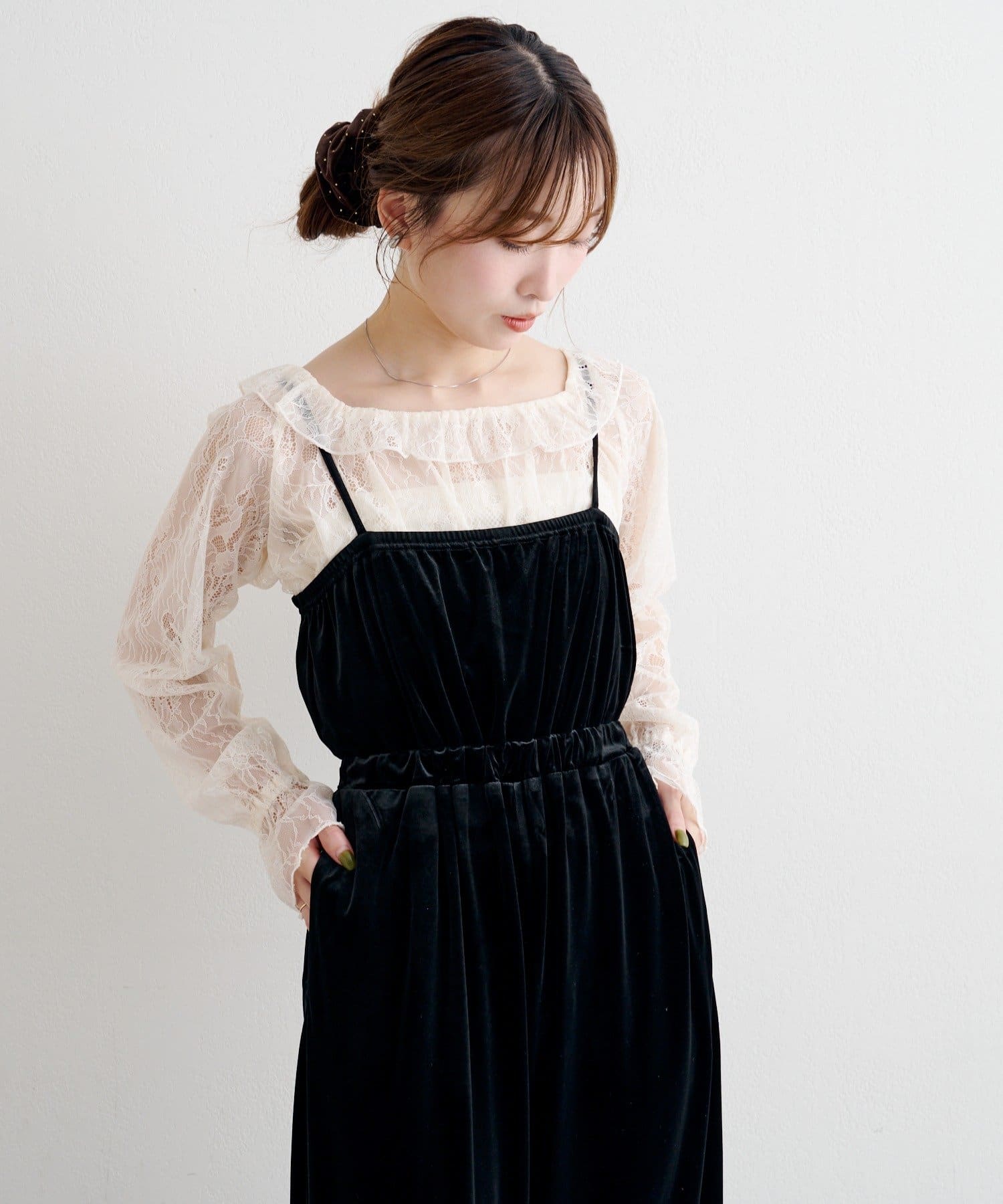 レーストップスとベロアコンビネゾンがセットになった、華やかさと上品さを兼ね備えたアイテム。
