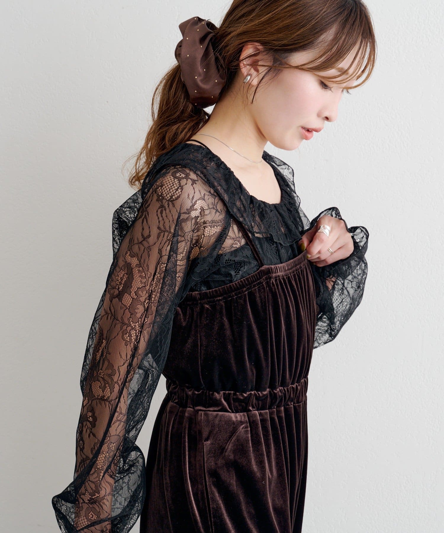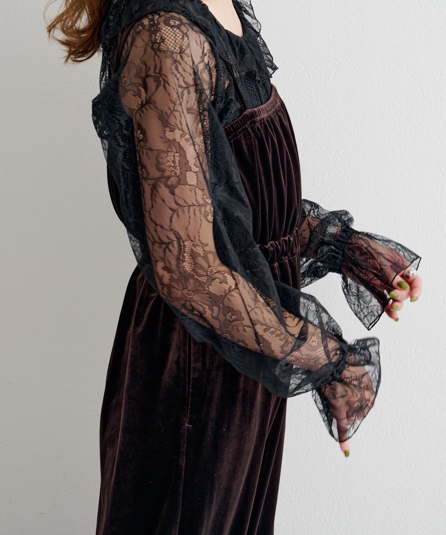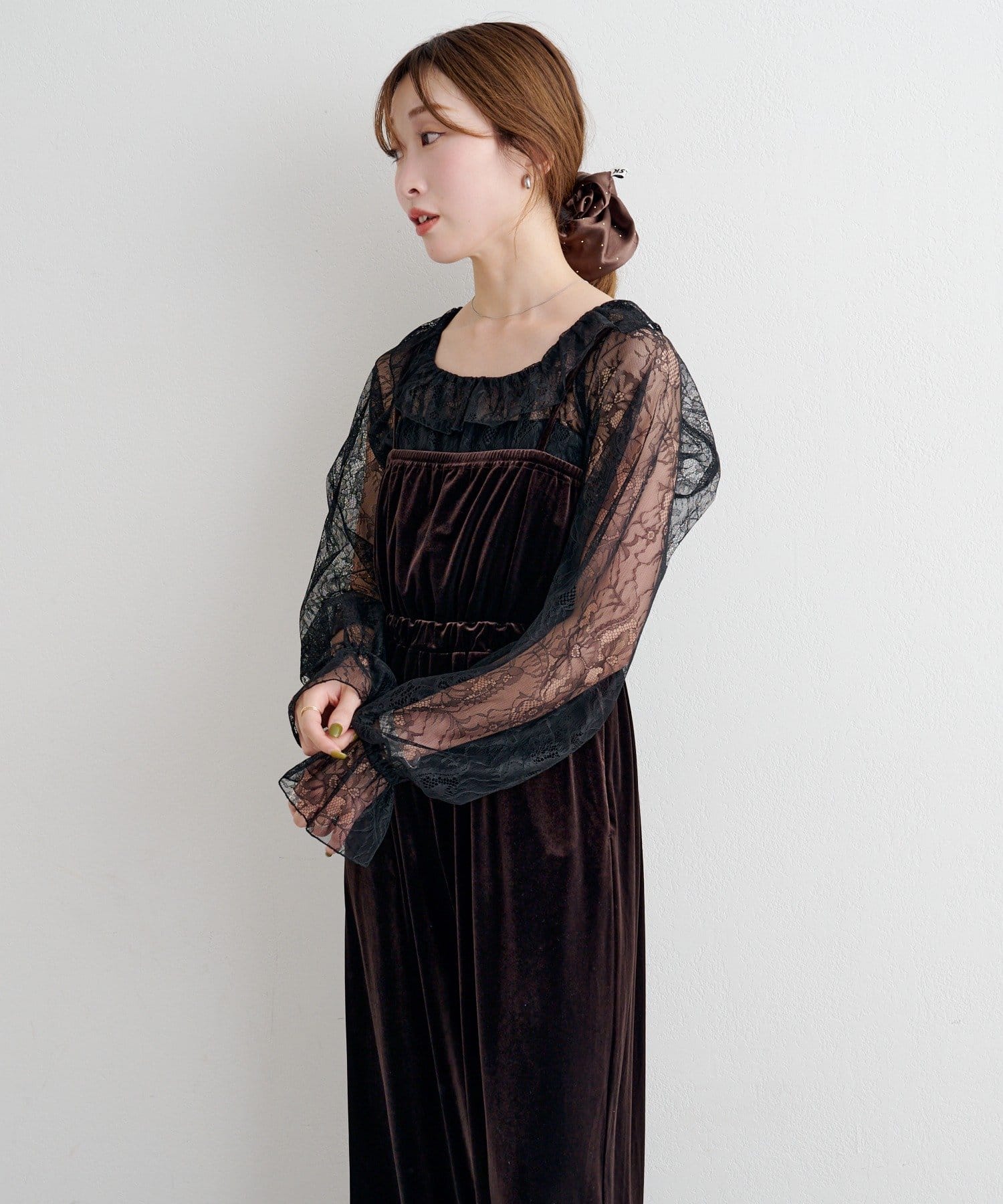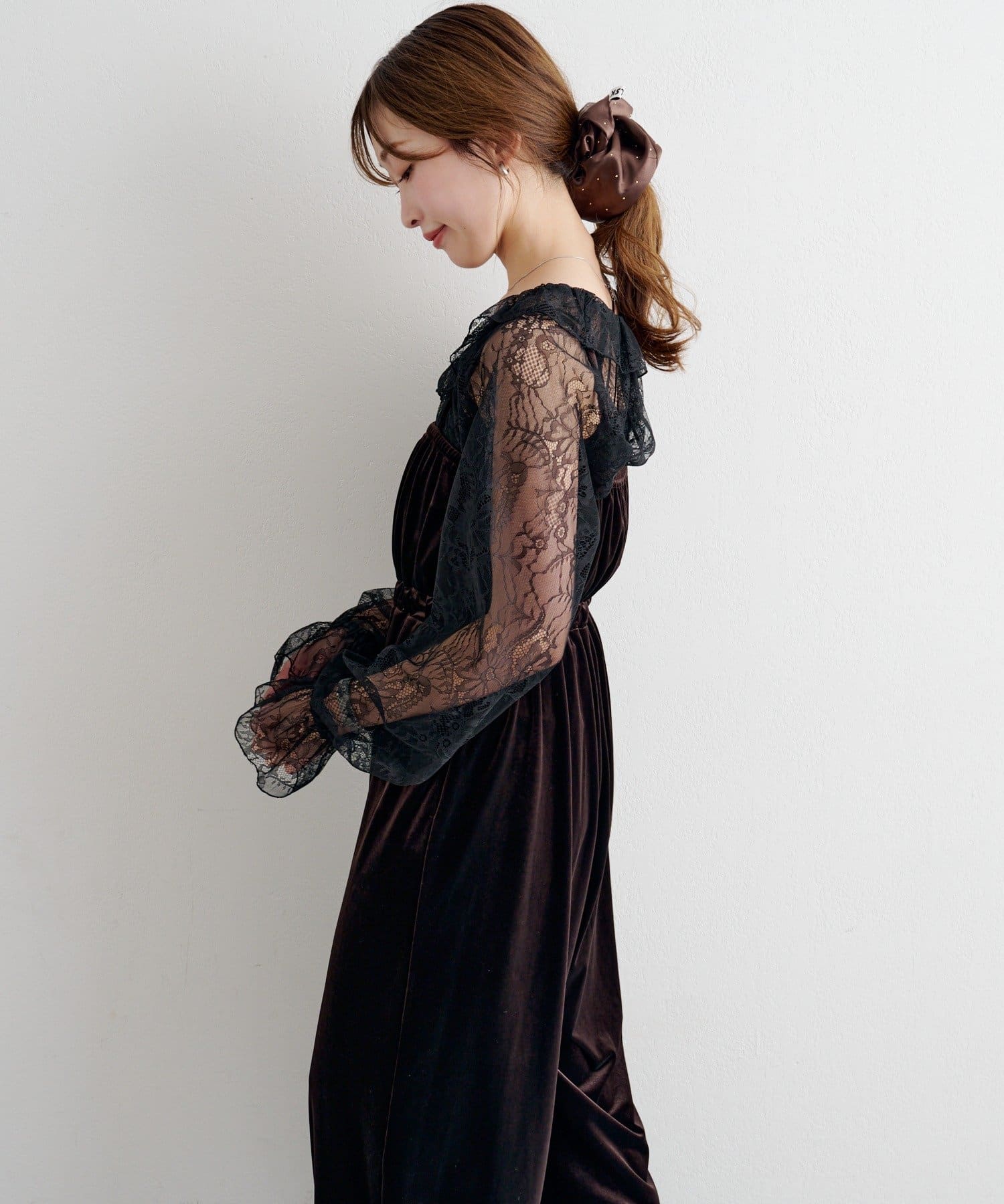 繊細なレースが顔まわりを明るく見せ、ベロアの柔らかな光沢が大人っぽいムードを引き立てます。