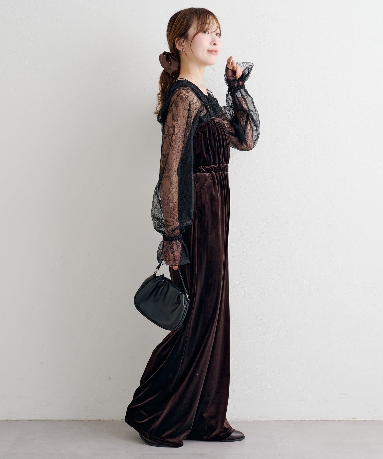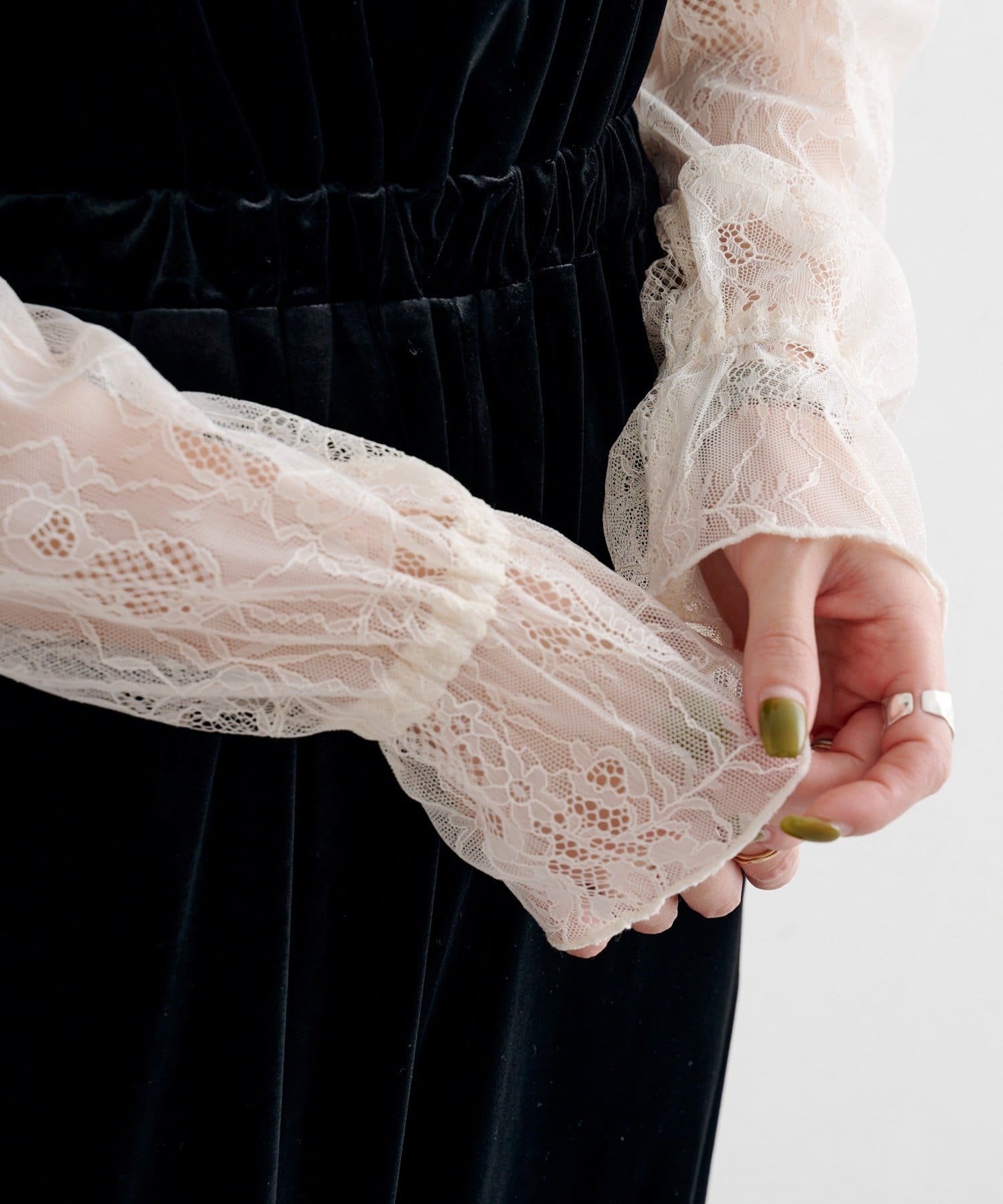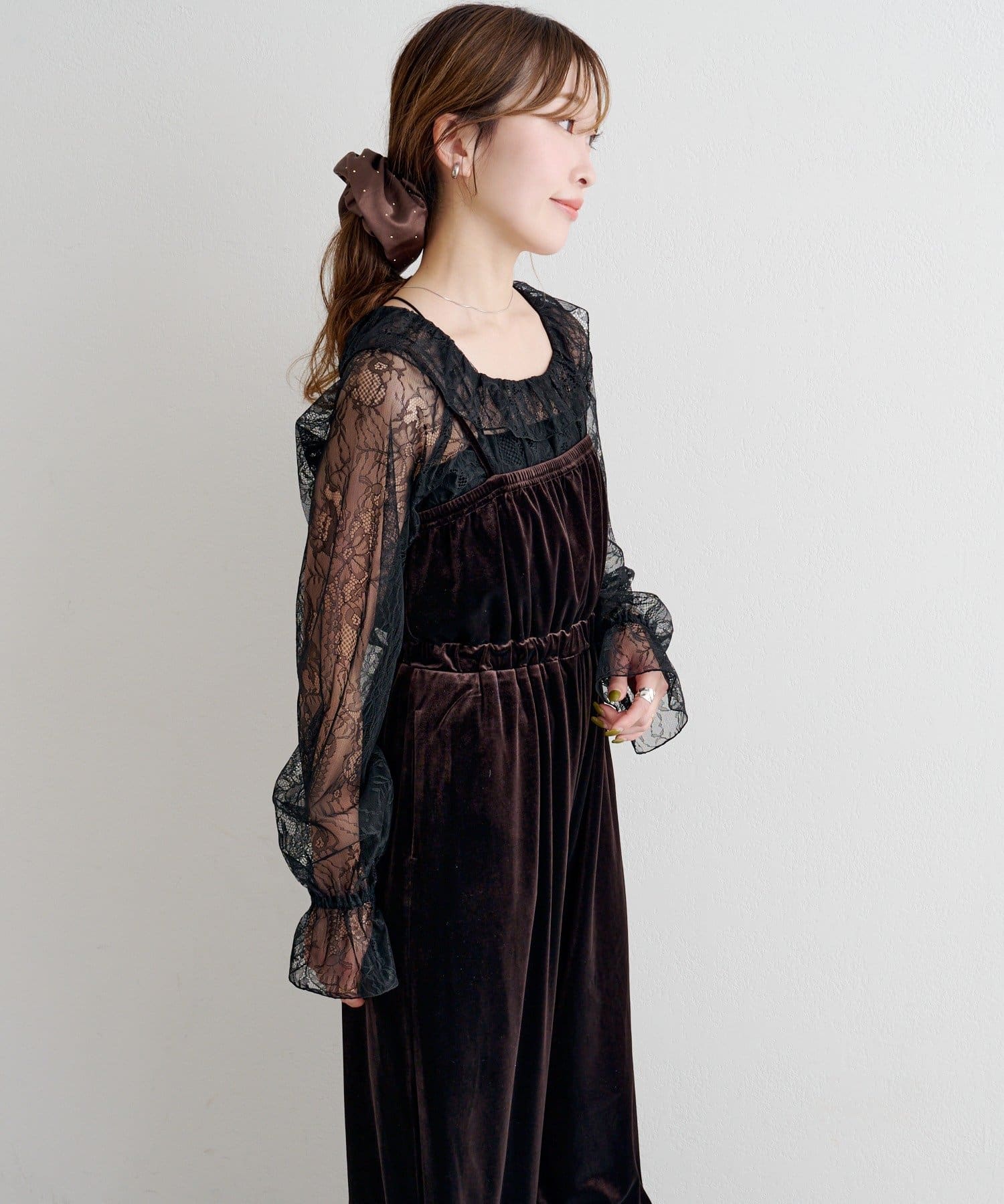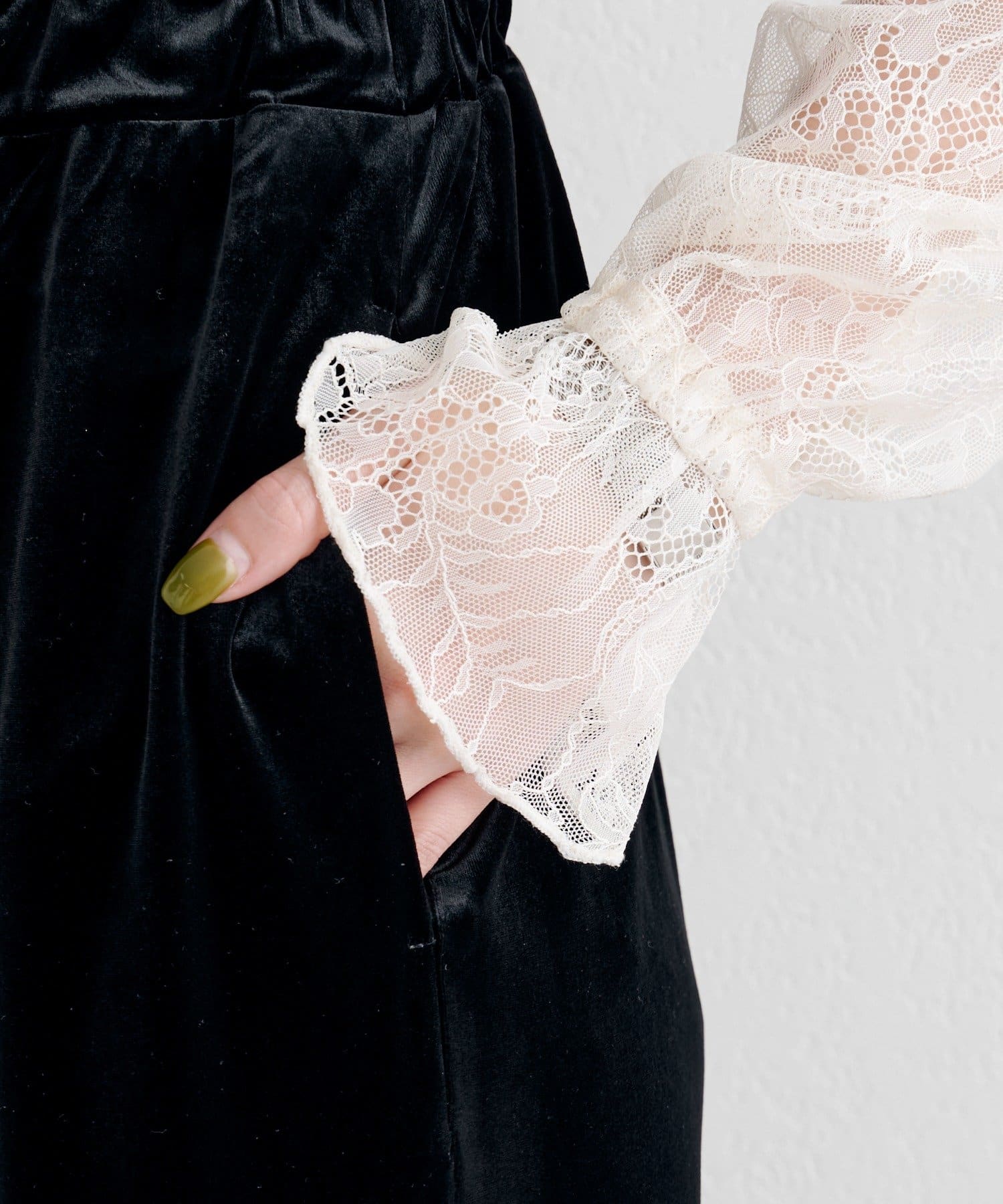 繊細なレースが顔まわりを明るく見せ、ベロアの柔らかな光沢が大人っぽいムードを引き立てます。