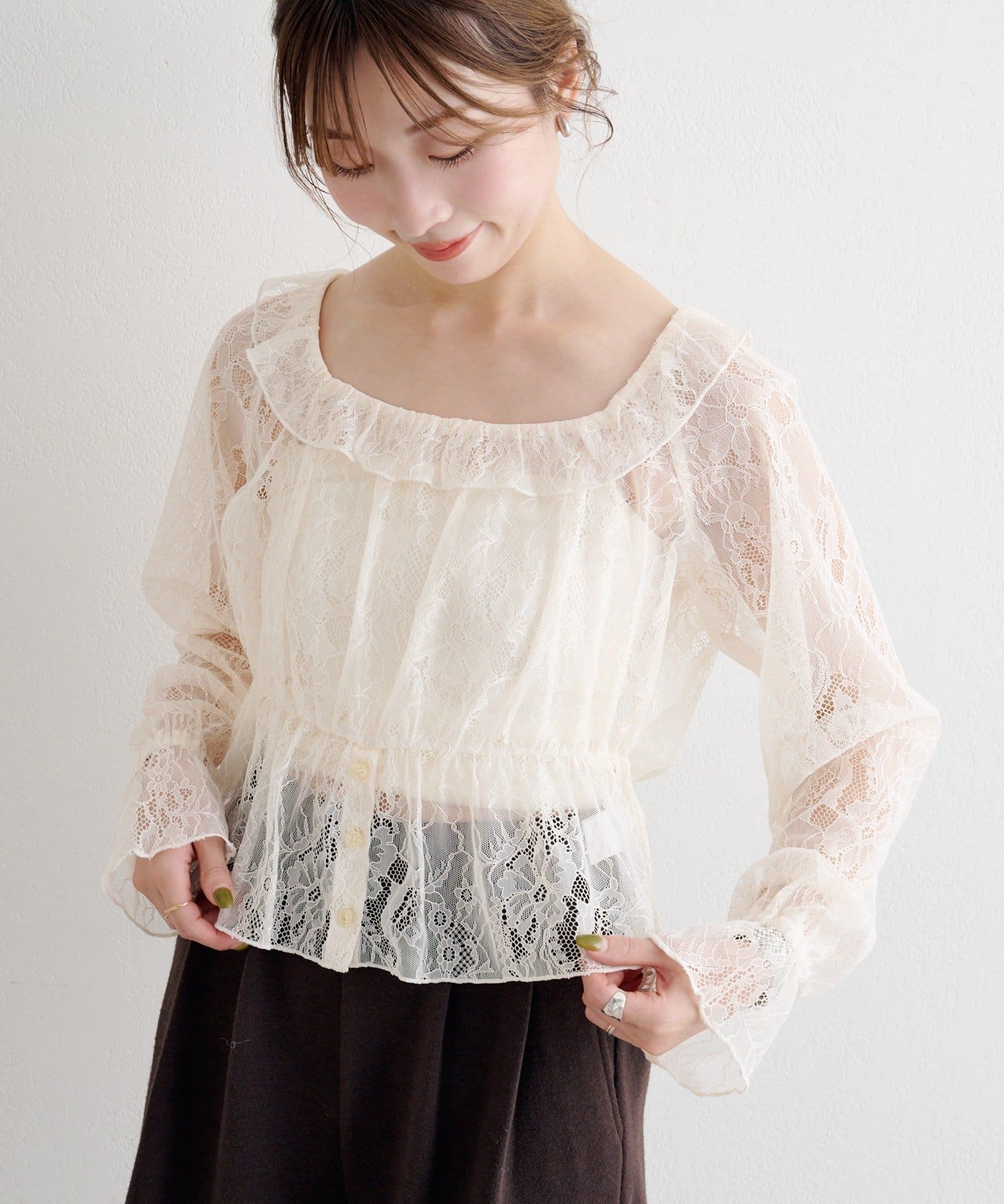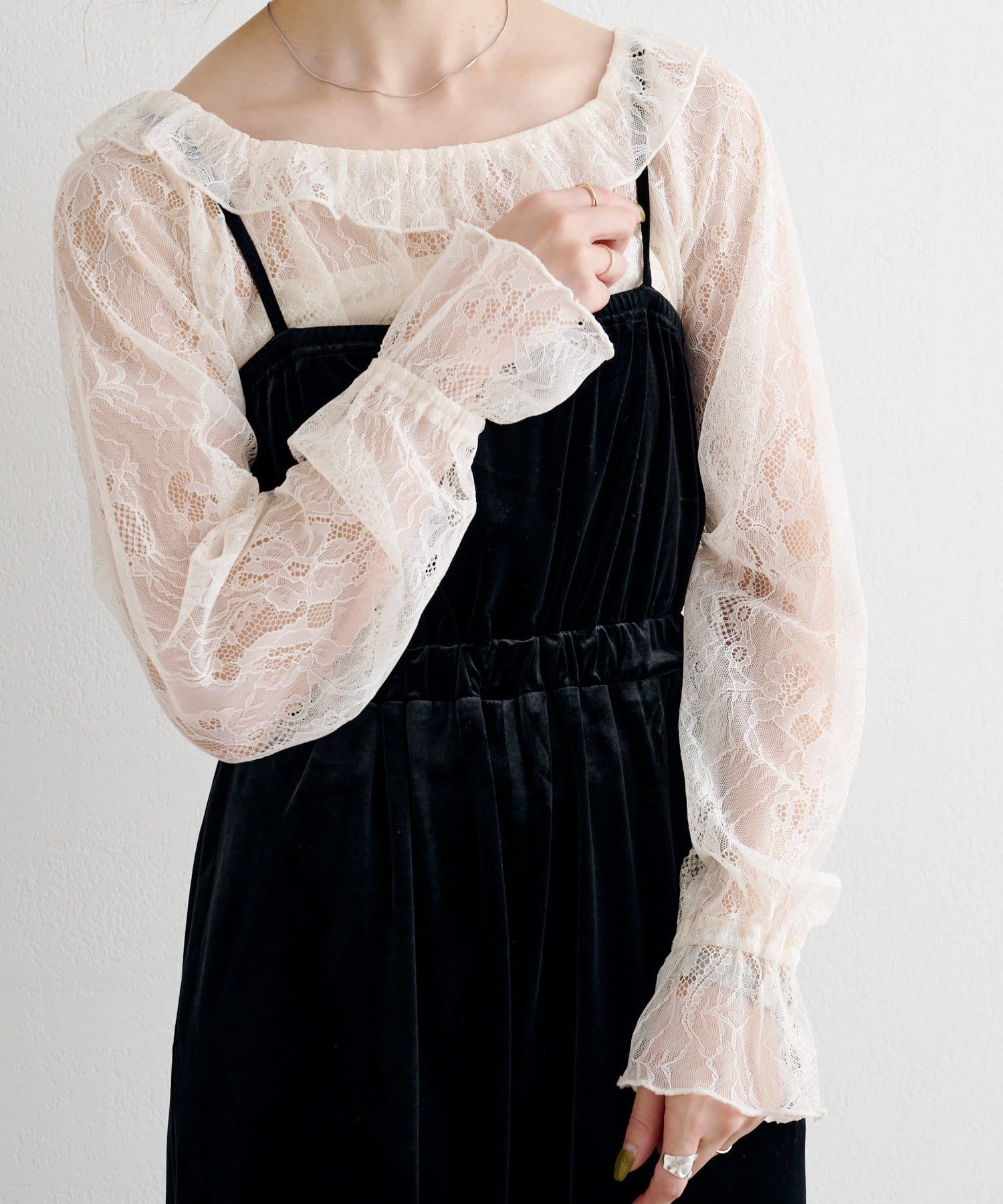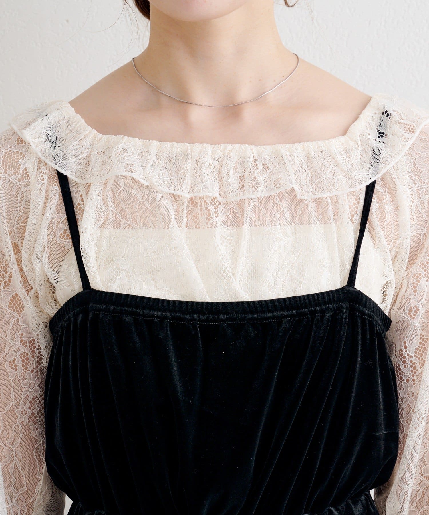 レーストップスをスウェットやカーデの中に仕込んで、レイヤードのアクセントに。ジャンスカやワンピースのインナーとしても相性◎。