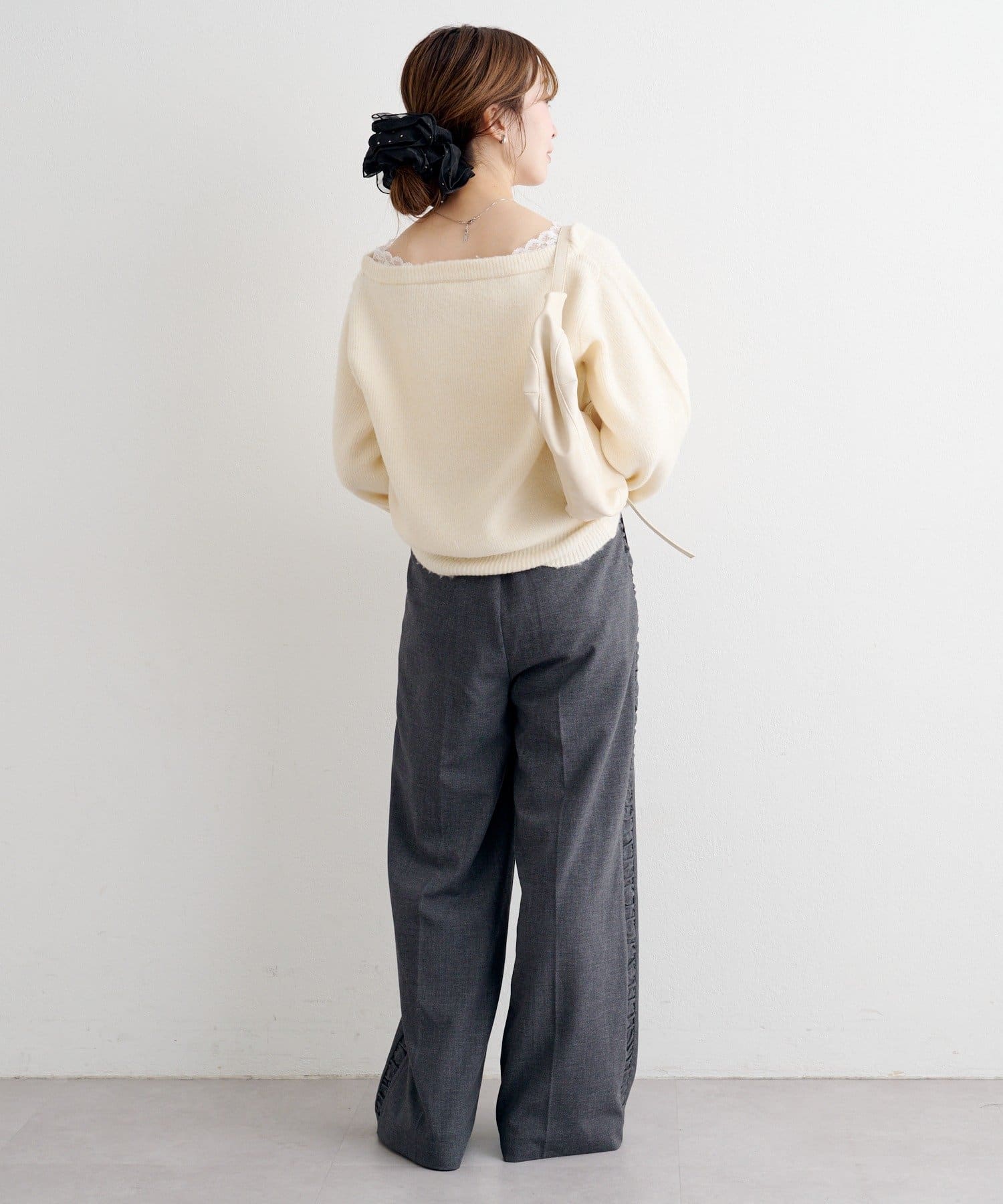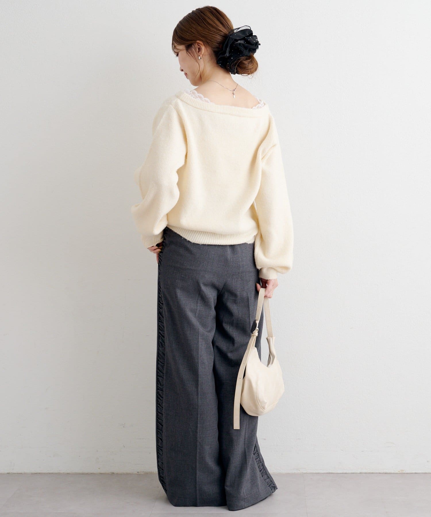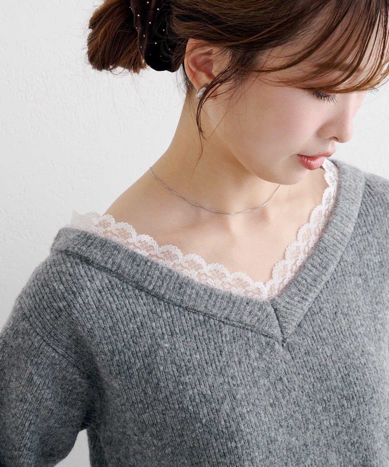 デコルテに沿って覗く繊細なレースが、シンプルながらも華やかな抜け感を演出します。
