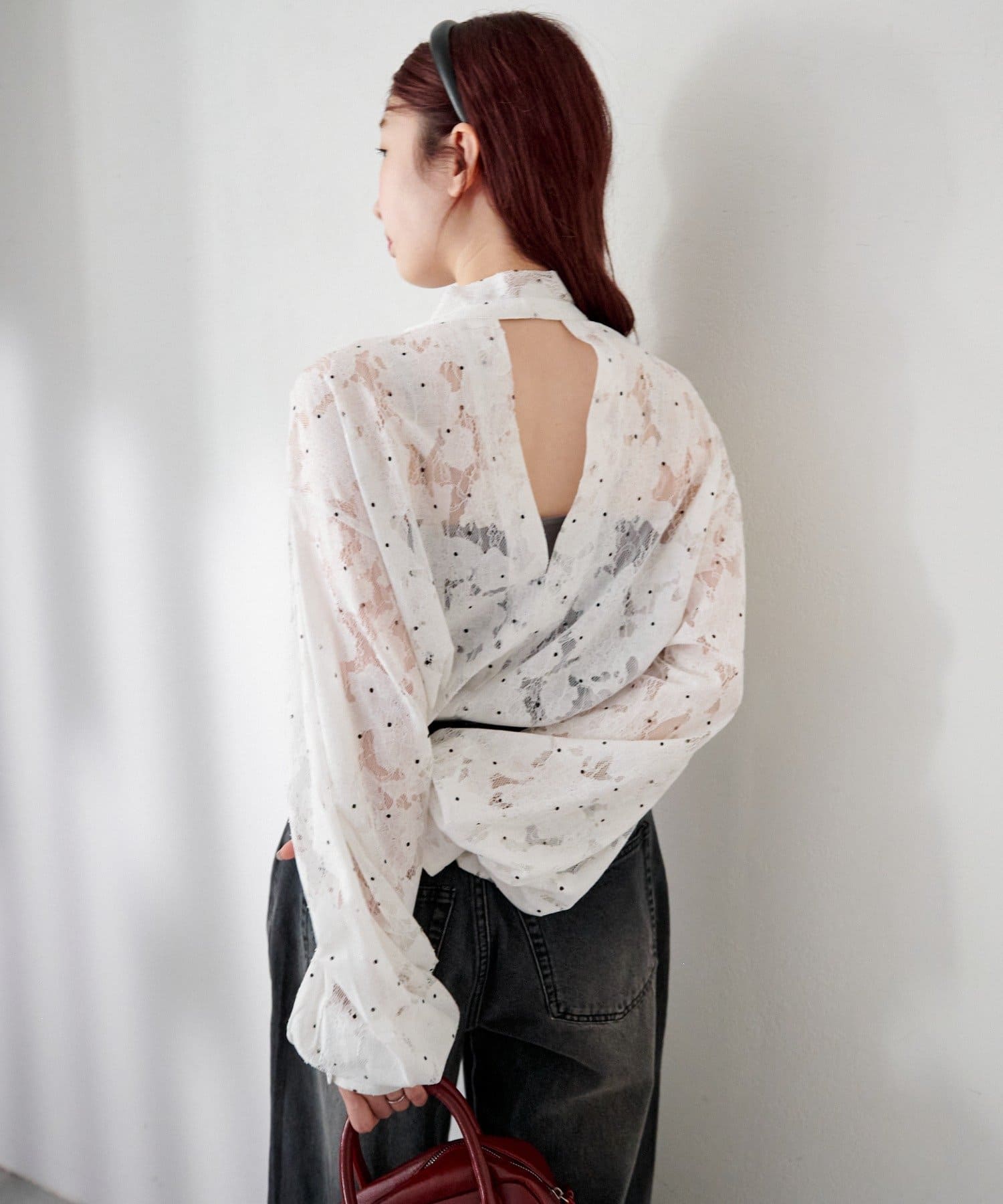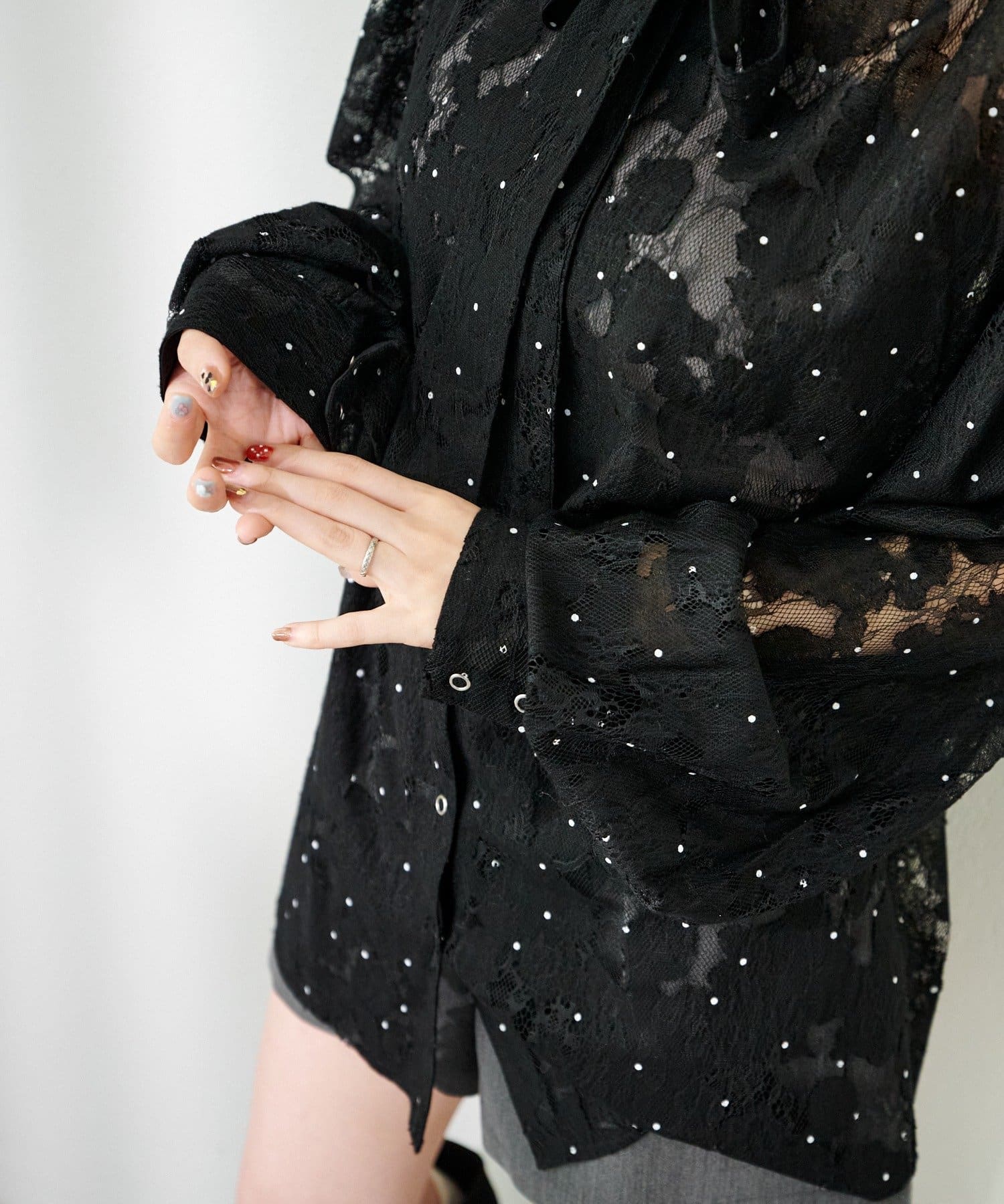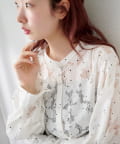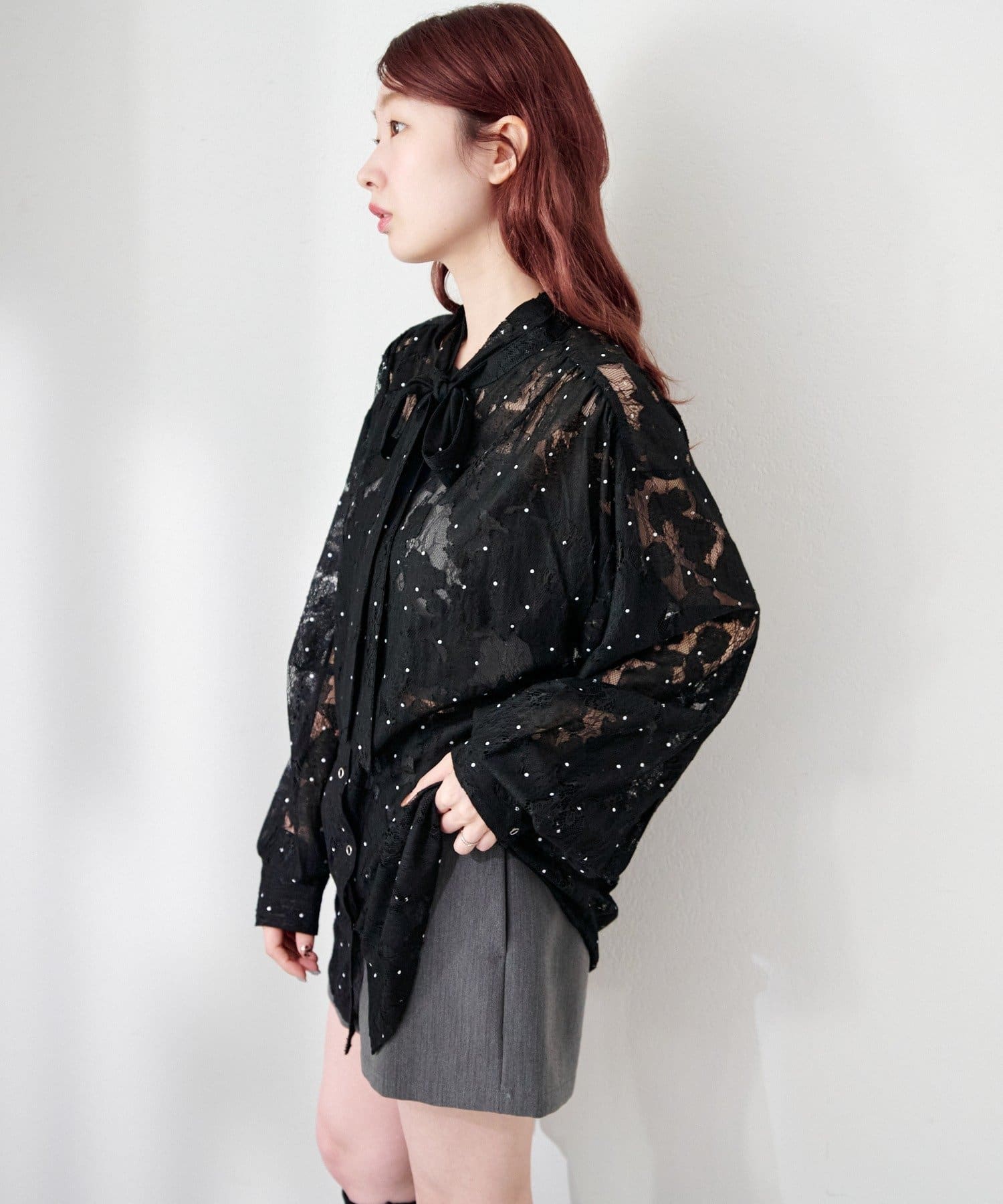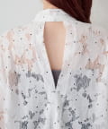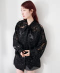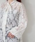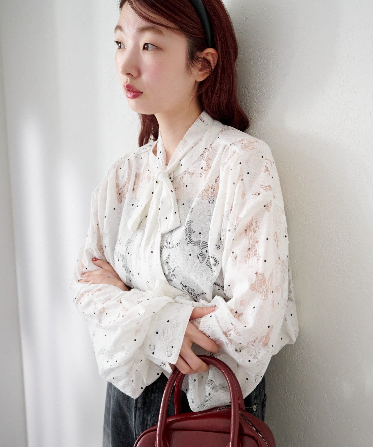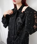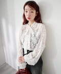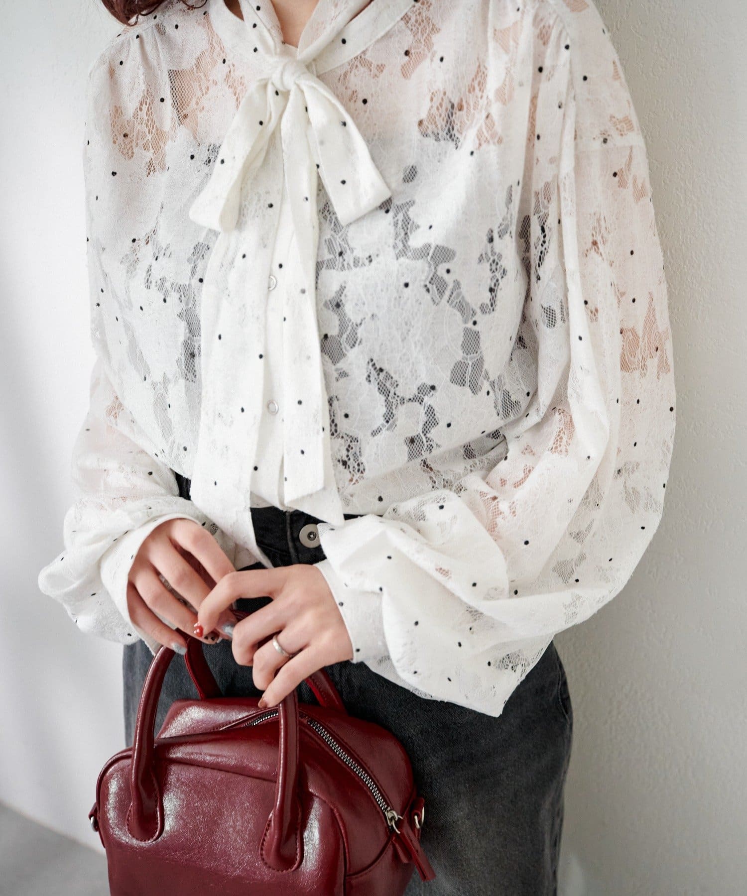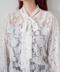 ドット柄が散りばめられたレース生地に、フェミニンなボウタイをあしらったブラウス。