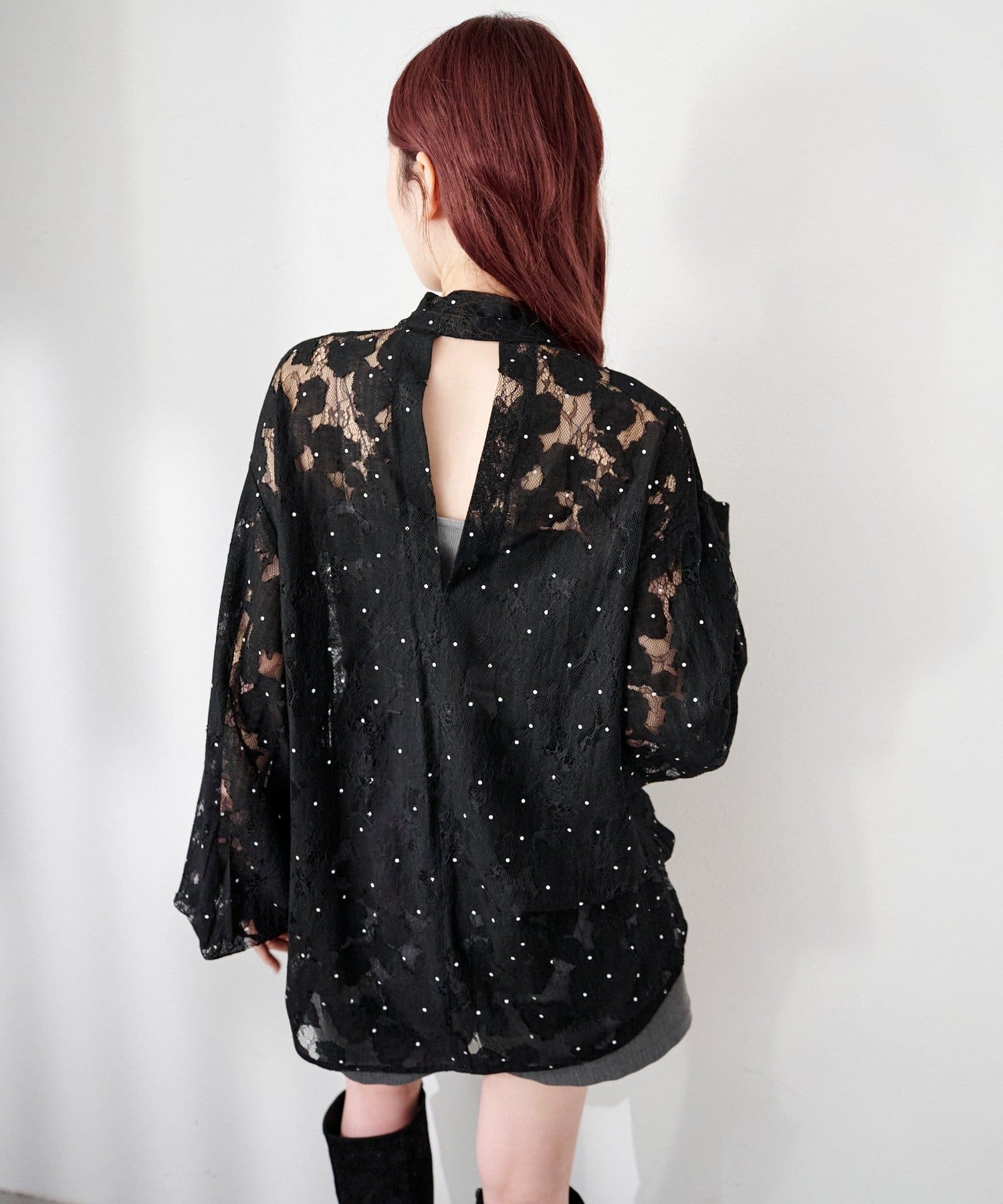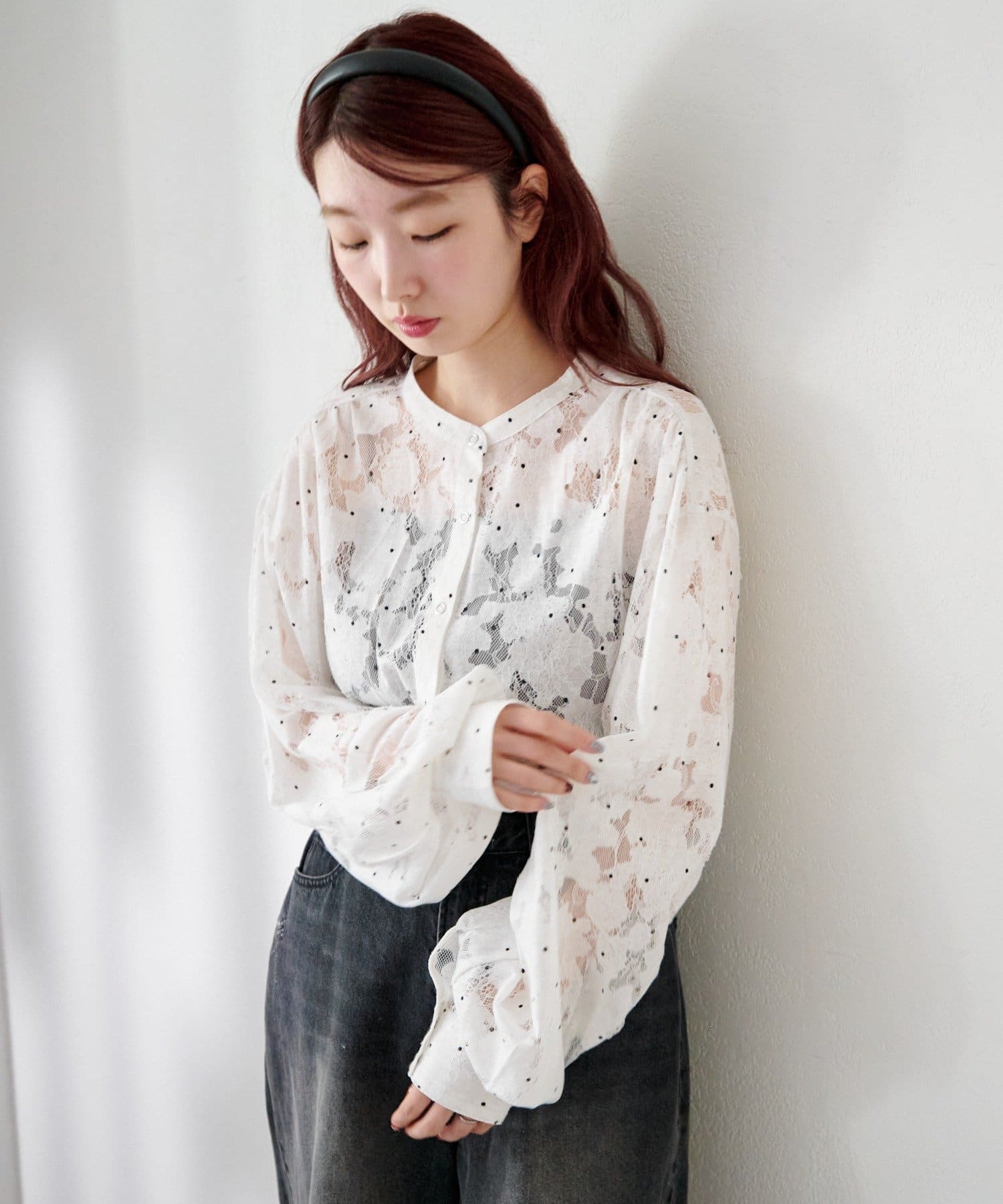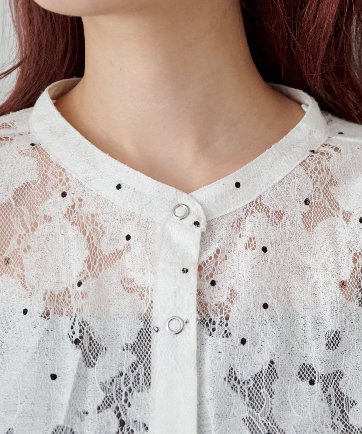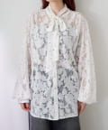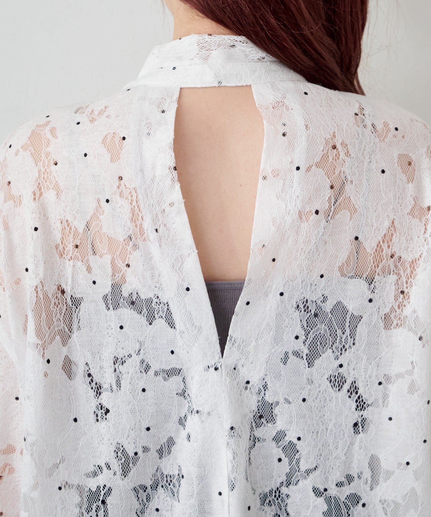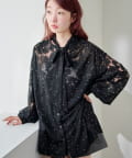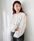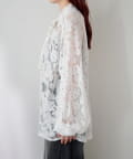 ドット柄が散りばめられたレース生地に、フェミニンなボウタイをあしらったブラウス。
