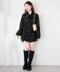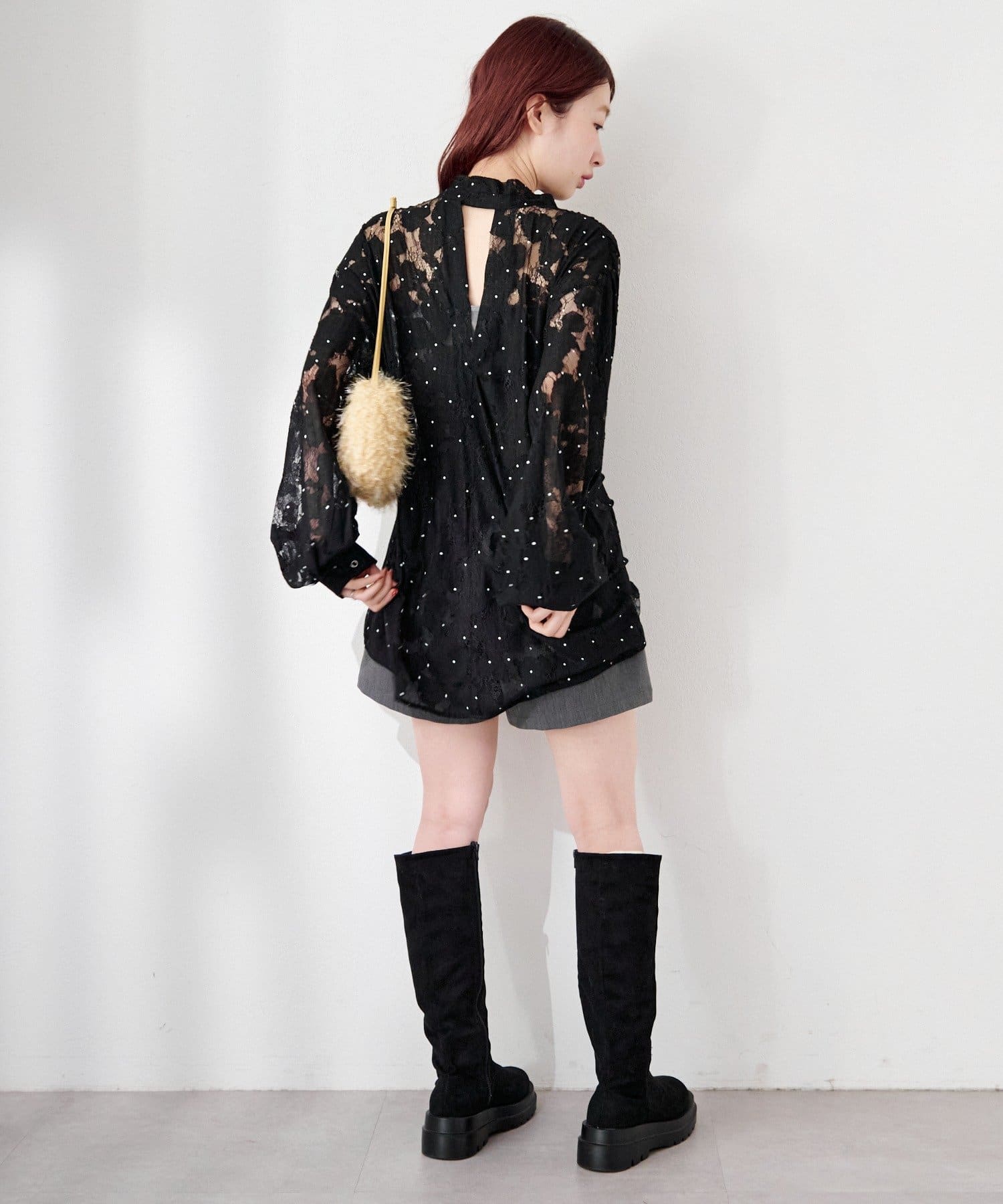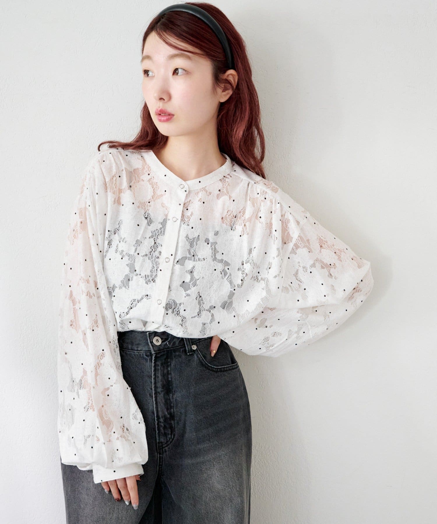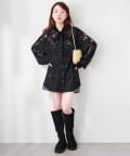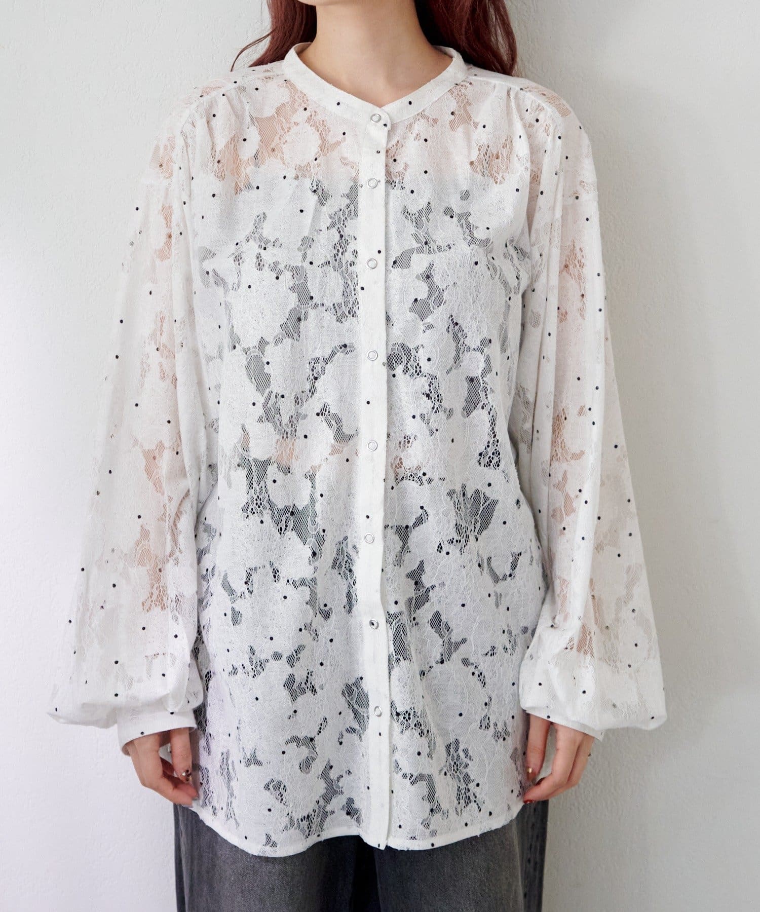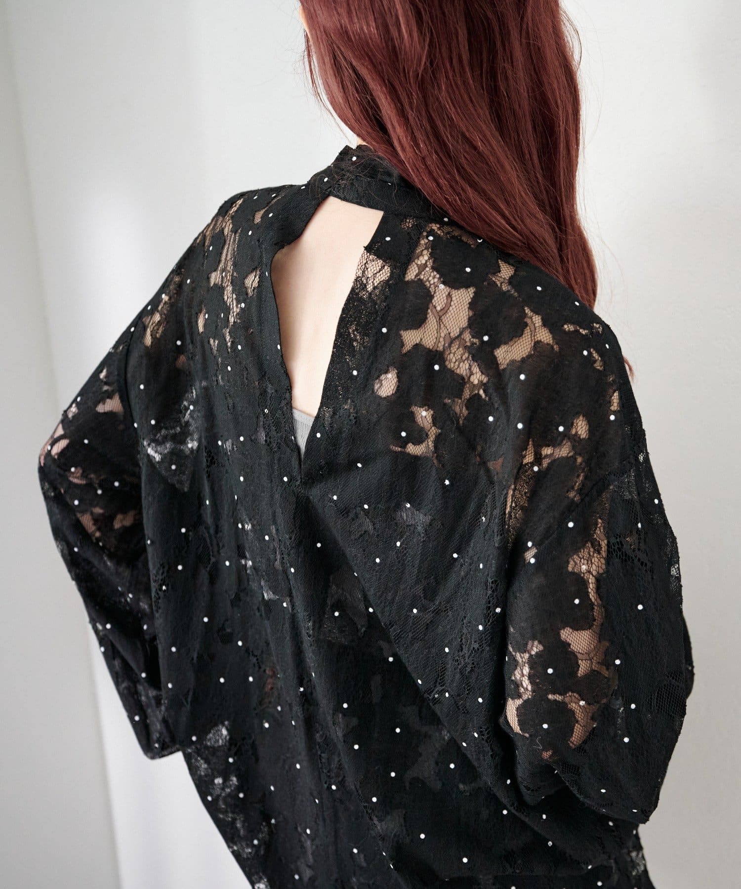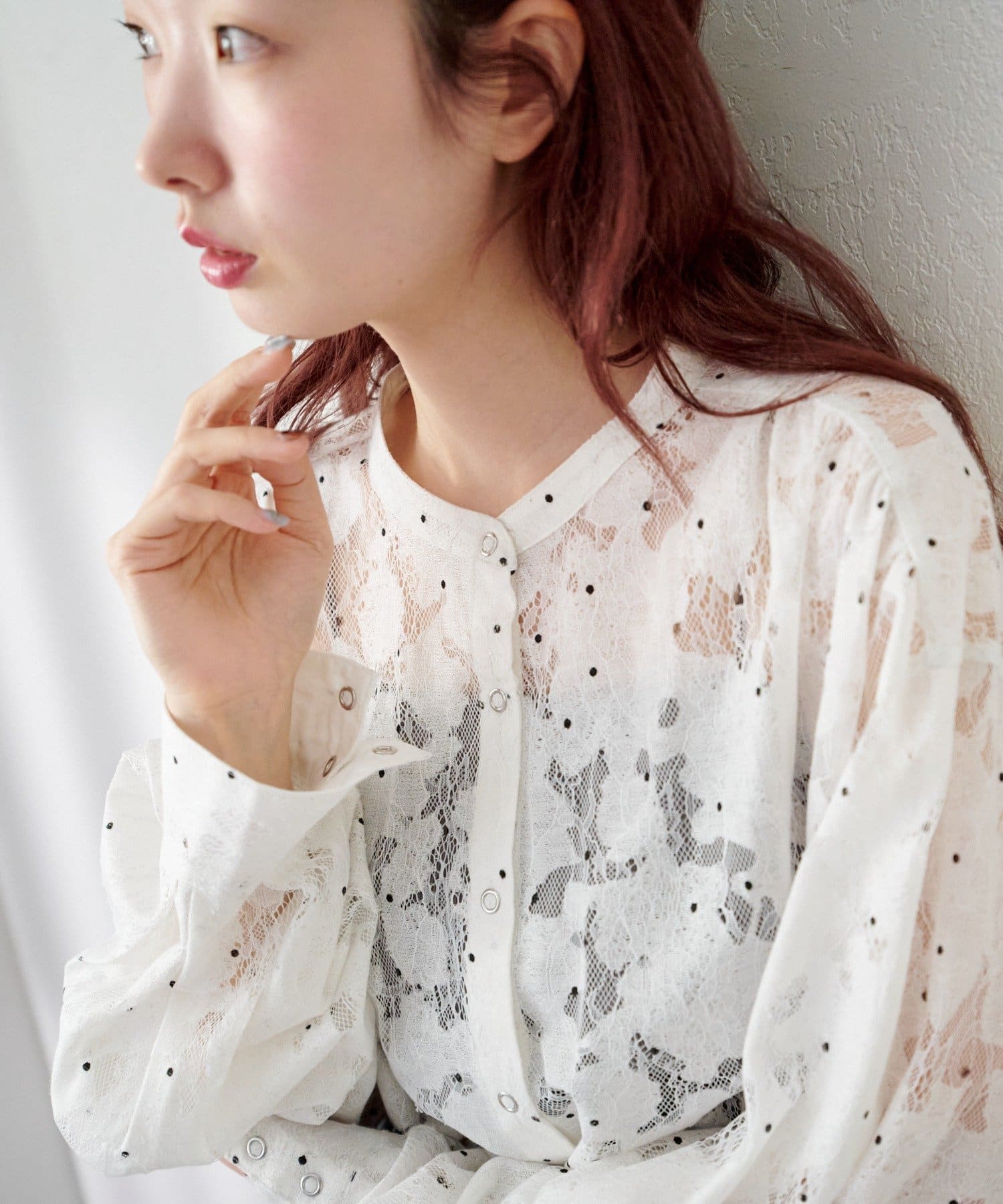 ドット柄が散りばめられたレース生地に、フェミニンなボウタイをあしらったブラウス。