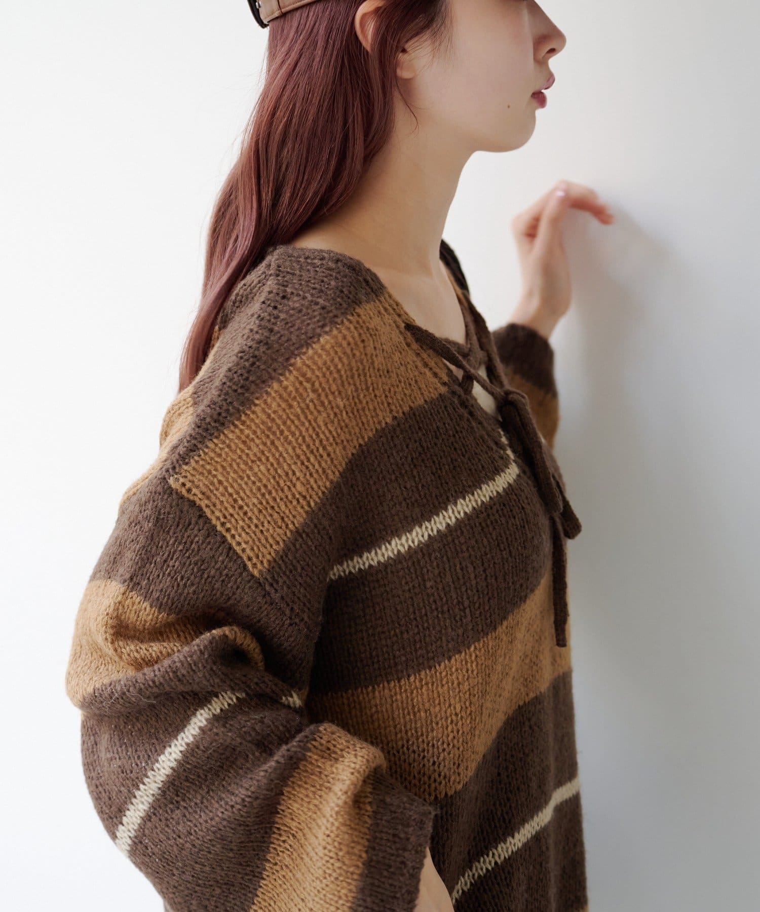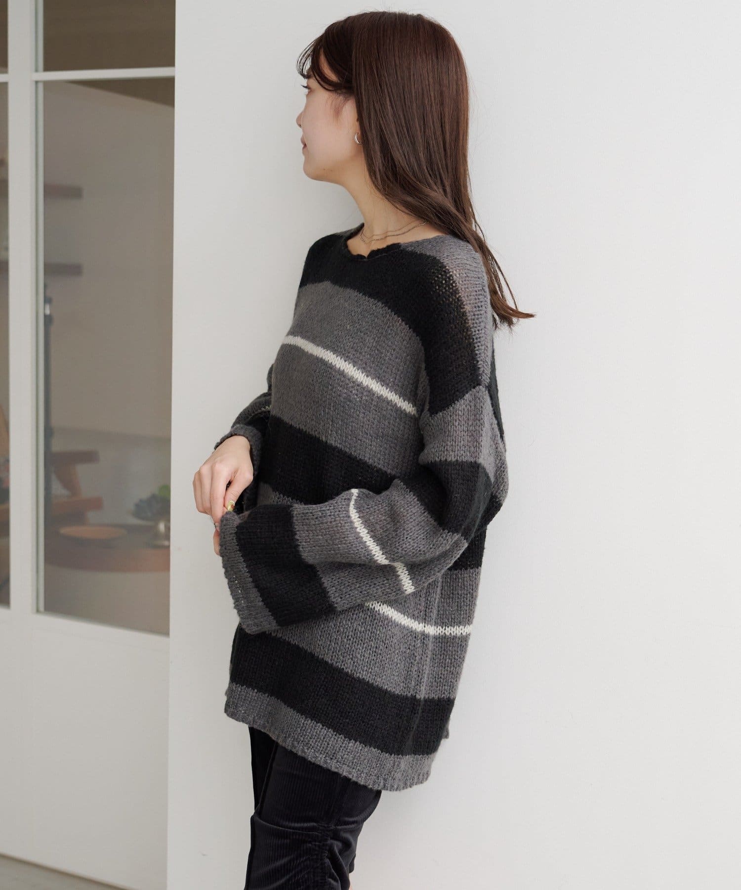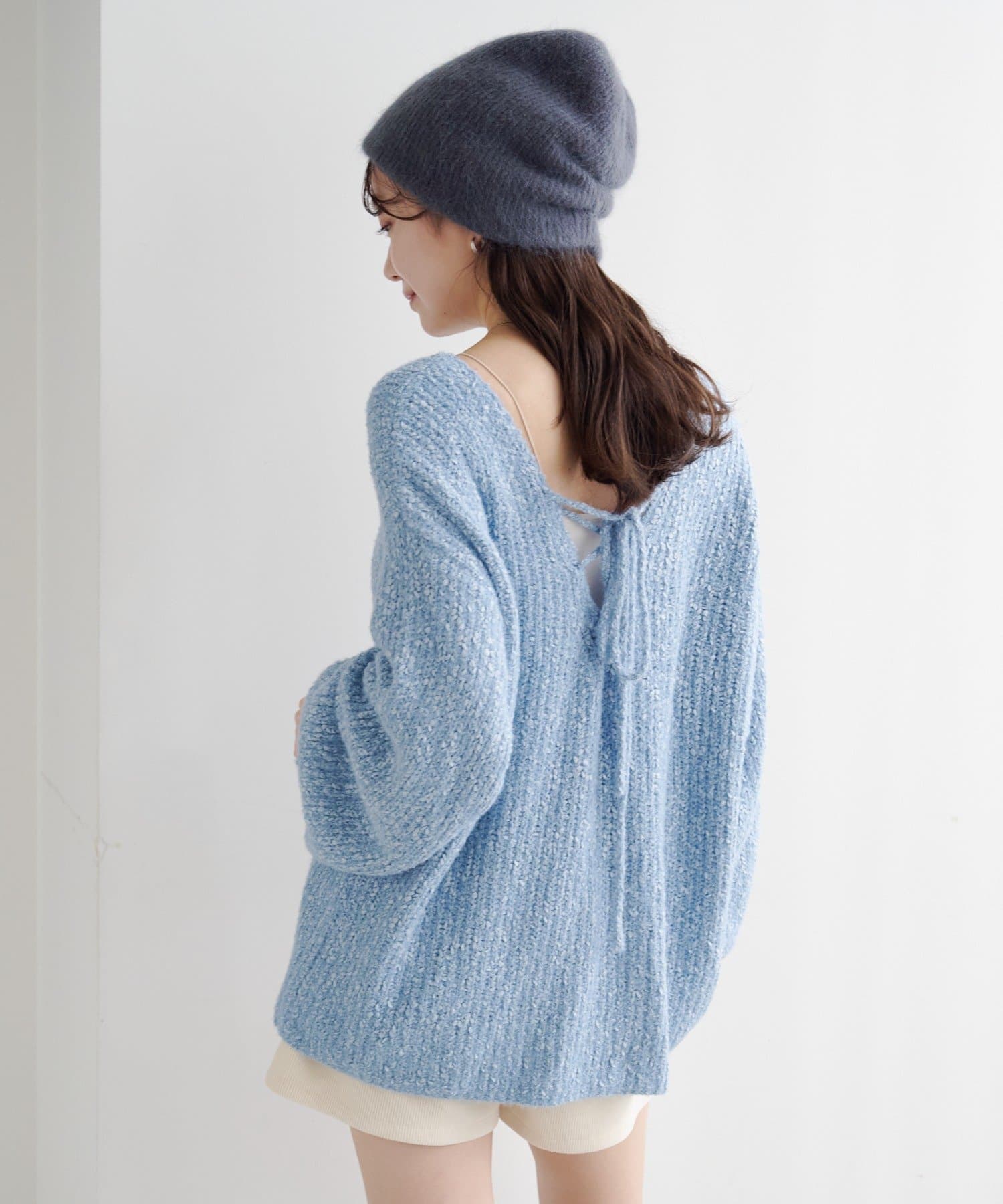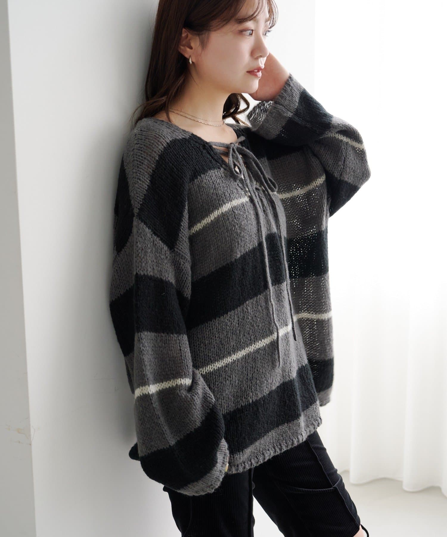 TOP > Kastane > レディース > トップス > ニット/セーター > 【WEB先行/無地&ボーダー/前後2WAY】編み上げルーズニット