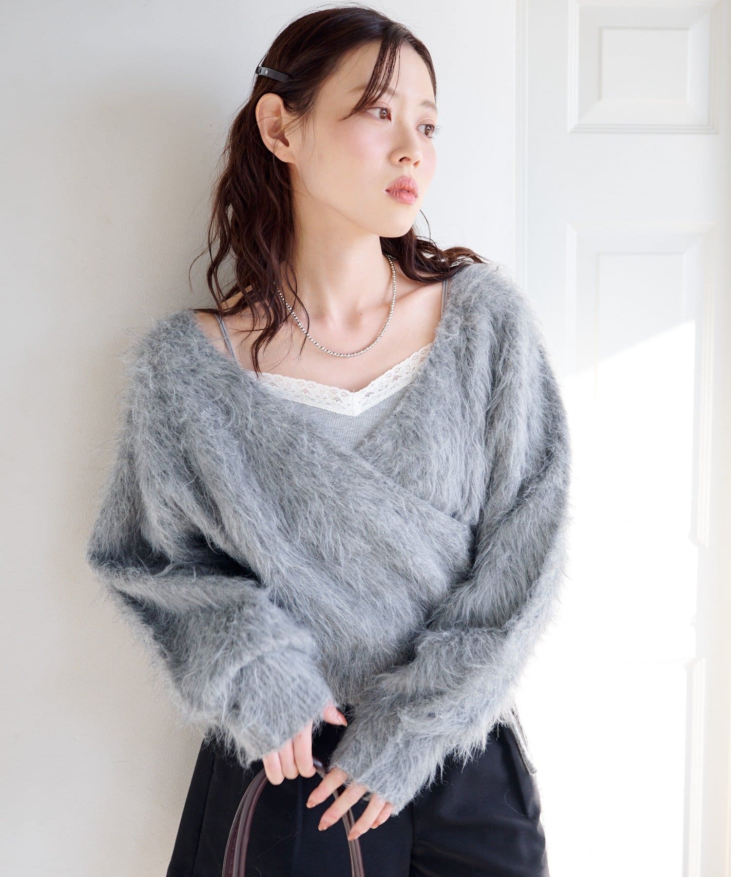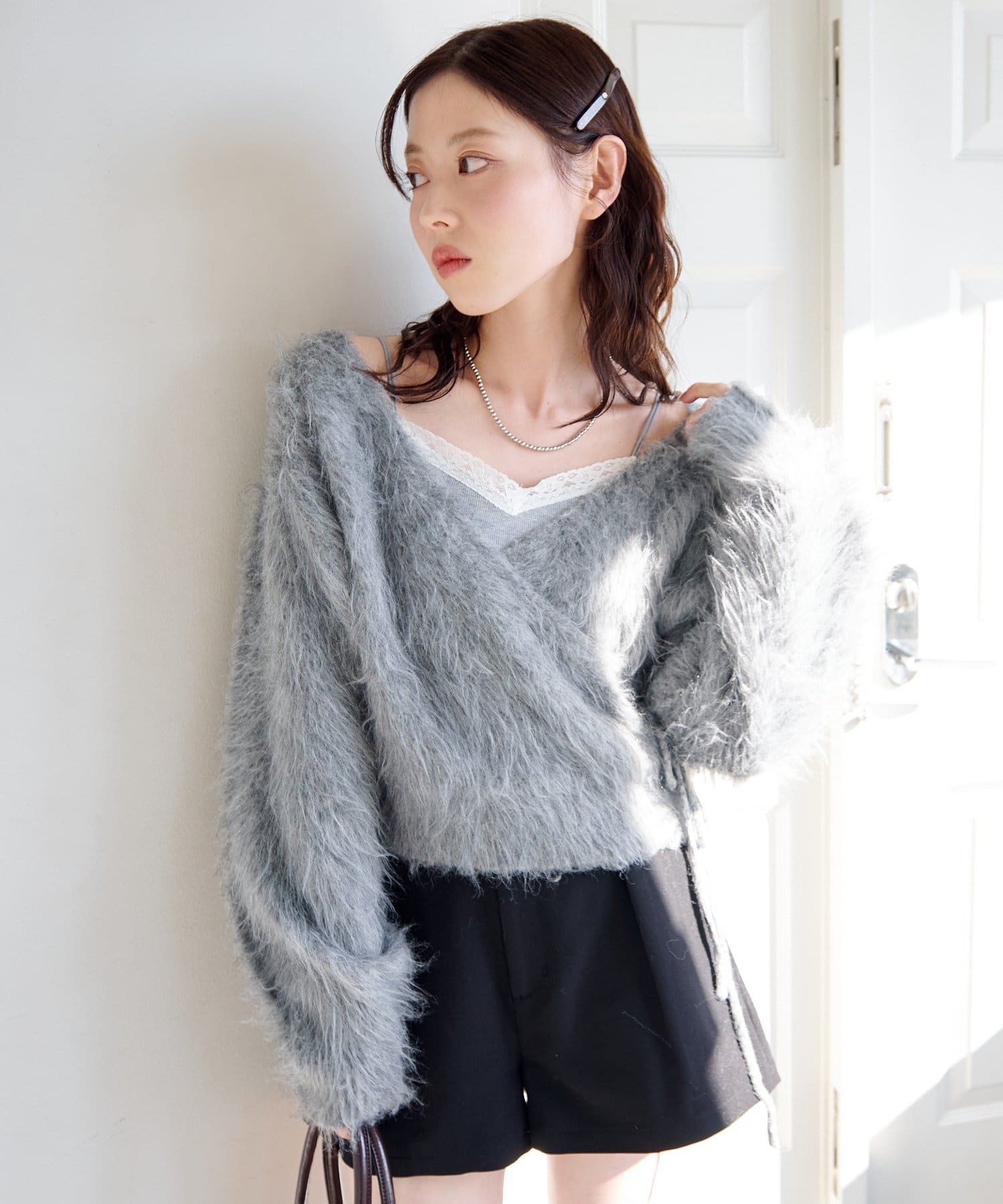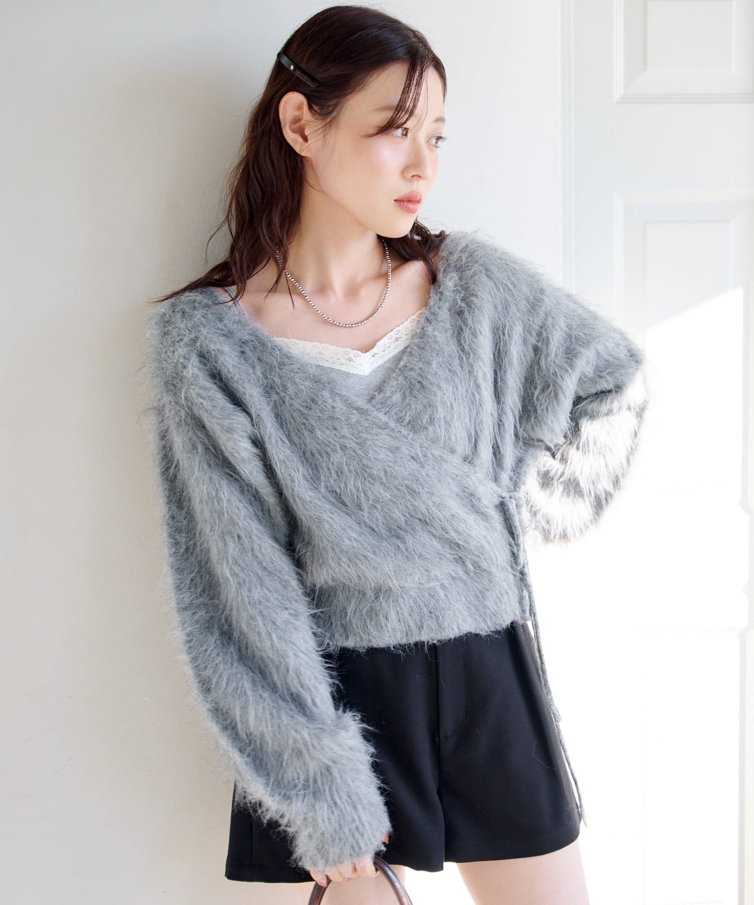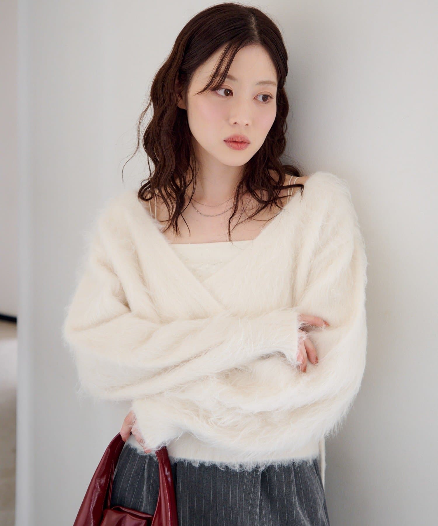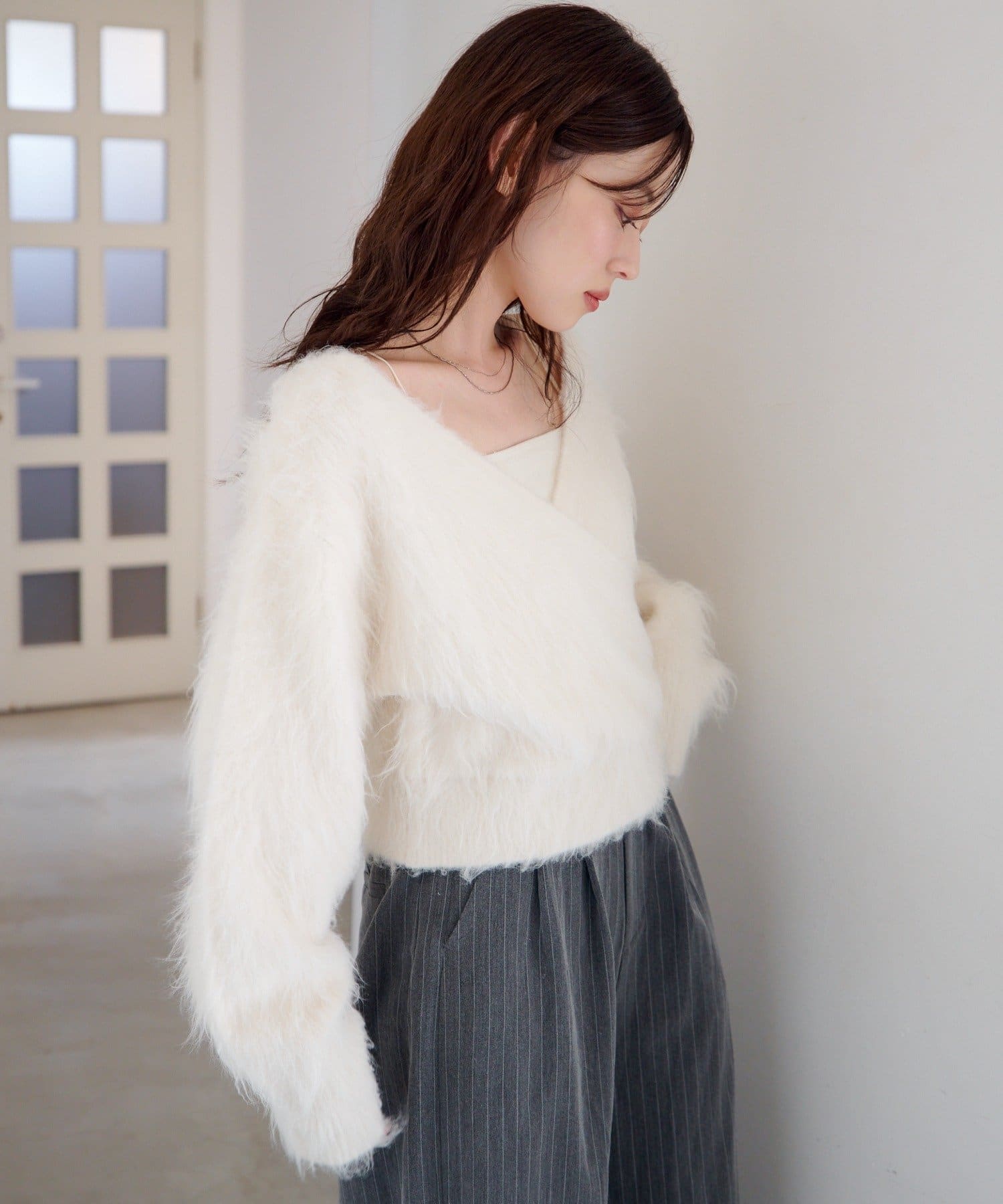 ふわふわのシャギー素材を贅沢に使った、華やかさ抜群のカシュクールニット。