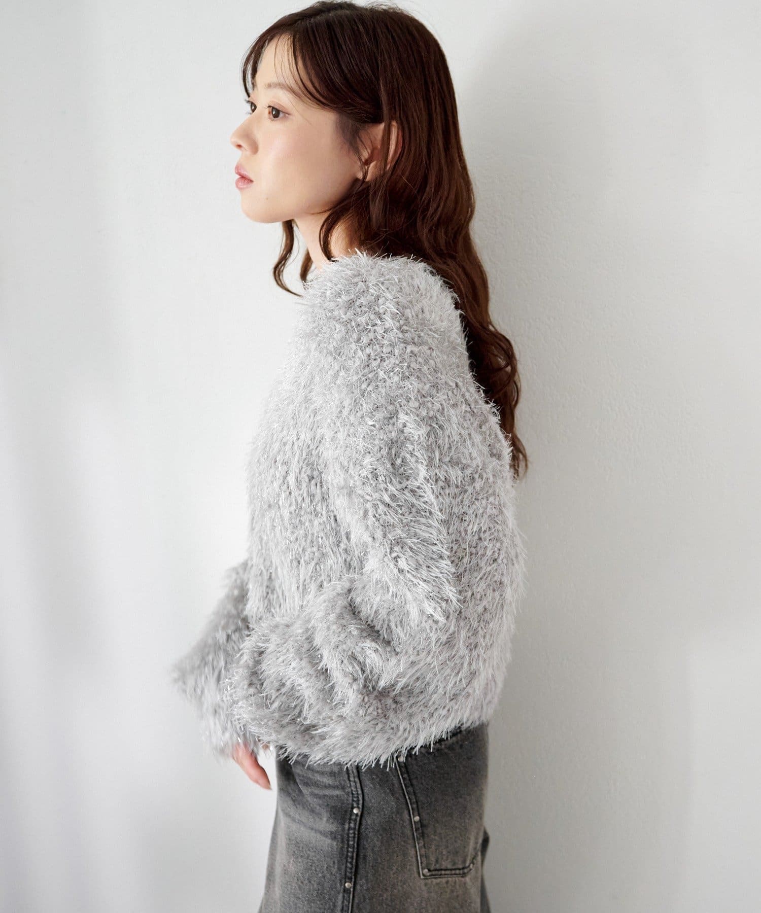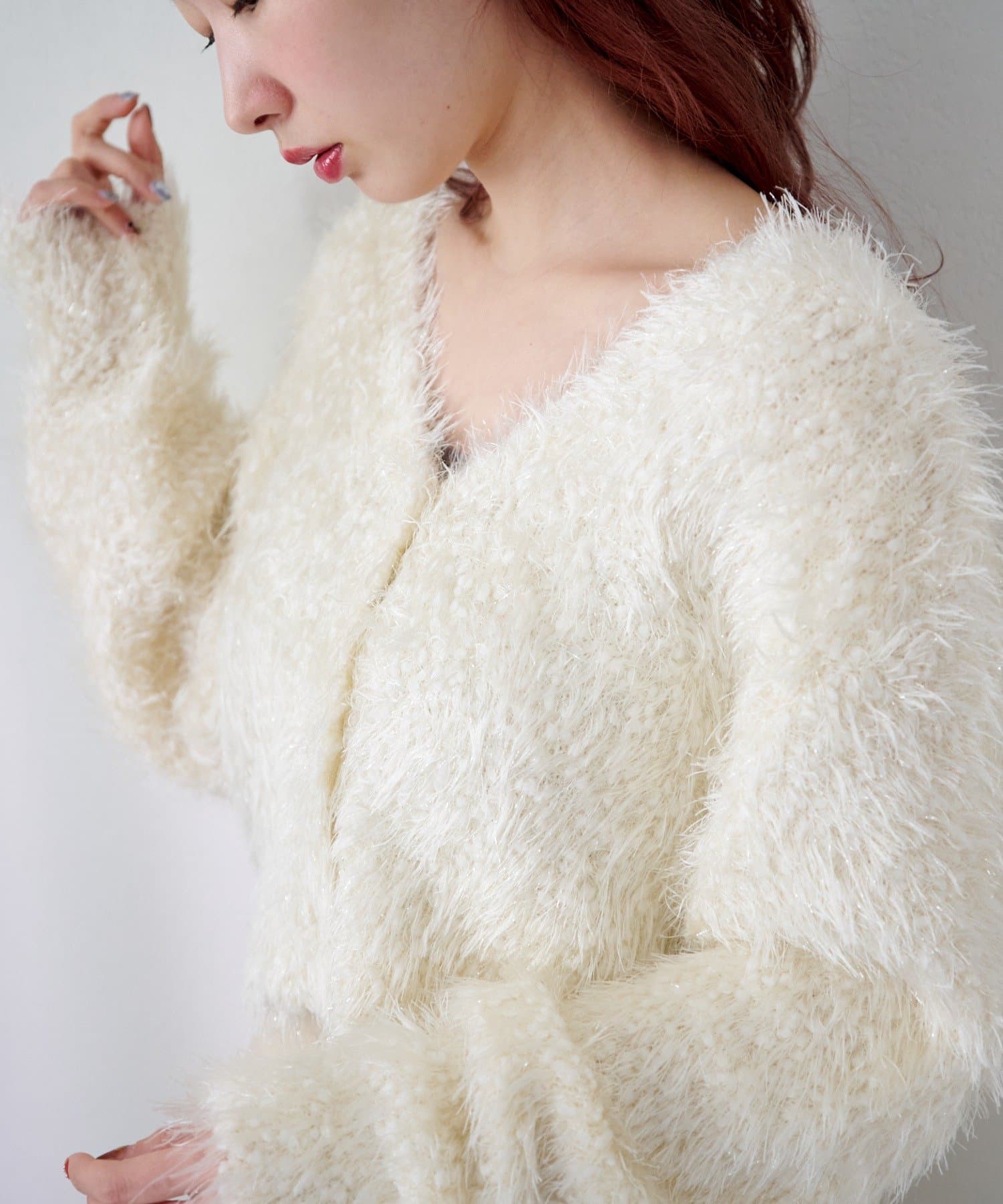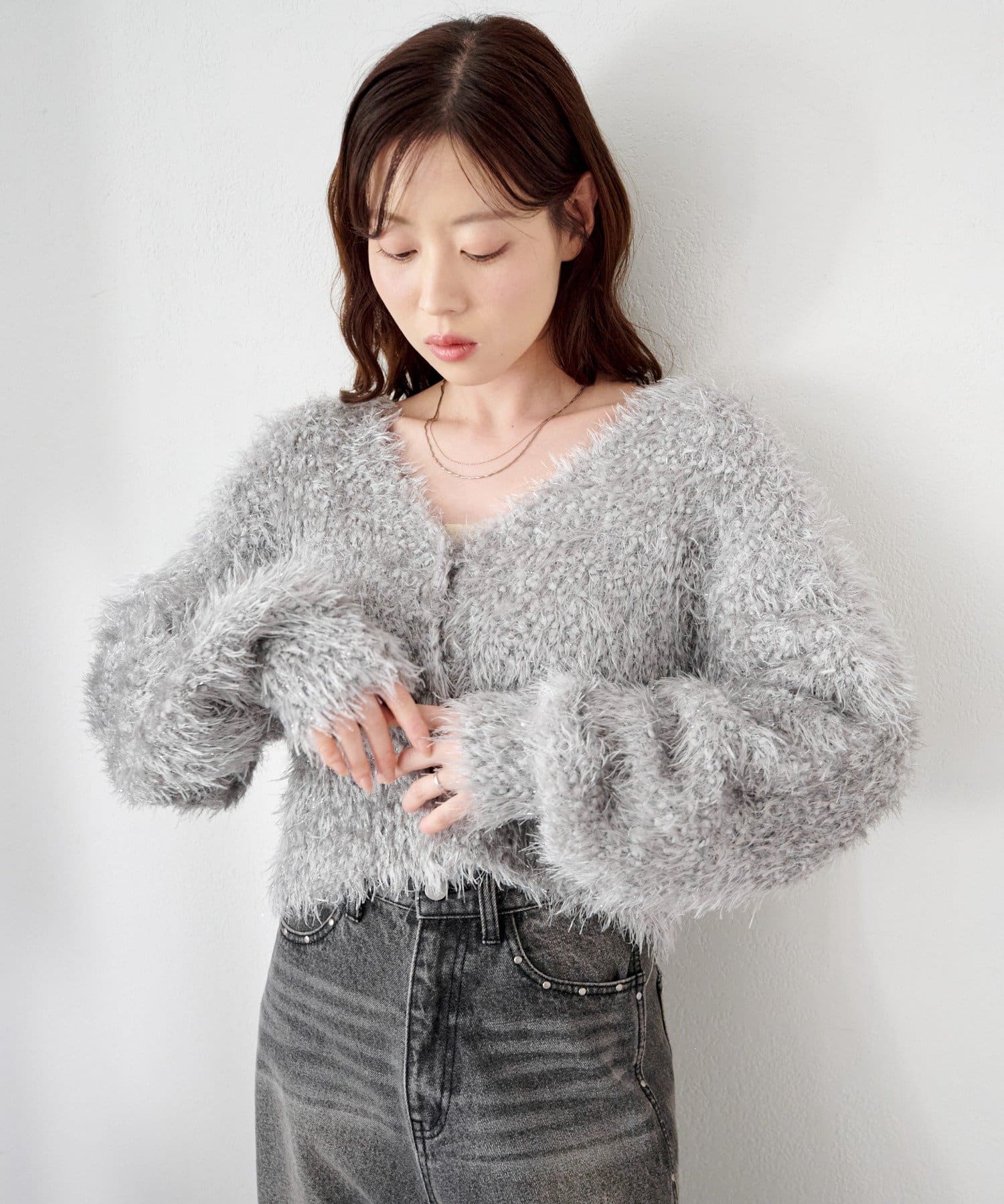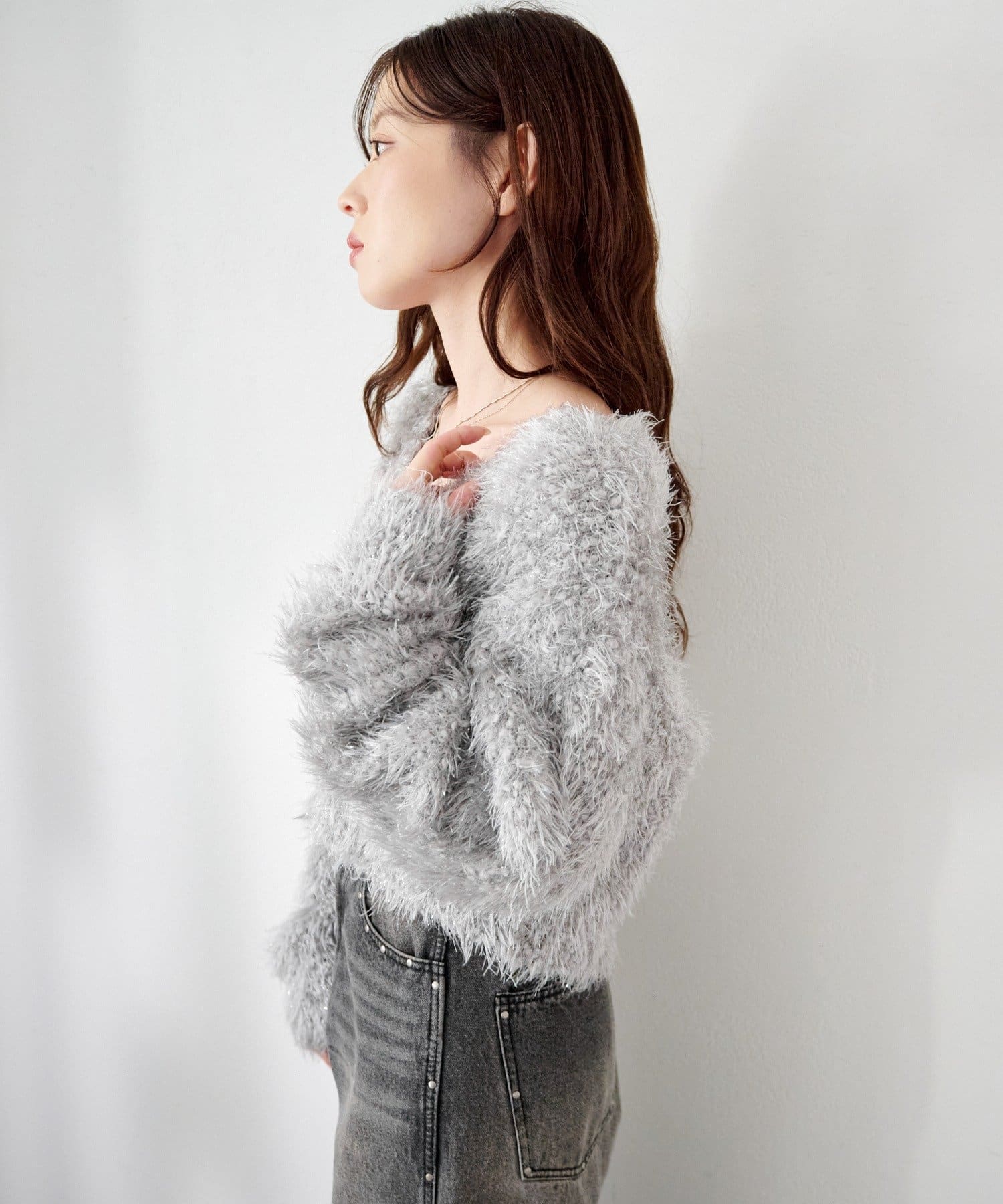 毛足の長いシャギー素材に、ほんのりとした光沢感をプラスしたグロスシャギーニットカーディガン。