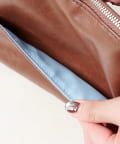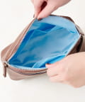 内側は鮮やかなカラーの裏地で、暗くなりがちなポーチ内部を明るい印象に。