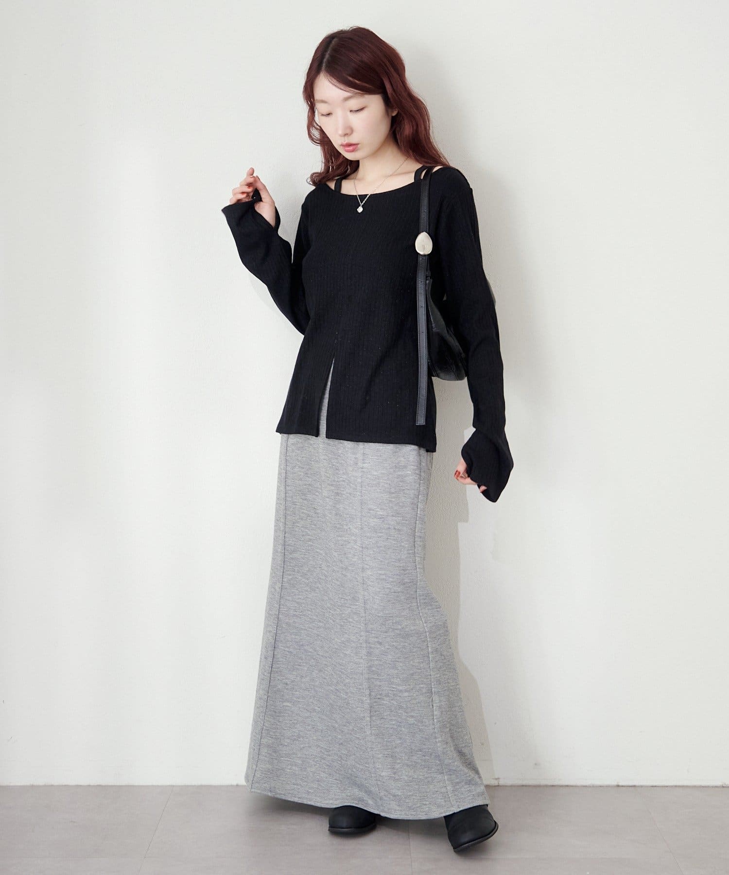 フロントのスリットがアクセントになり、タックイン・アウトどちらでもバランスよく着られる一枚。