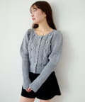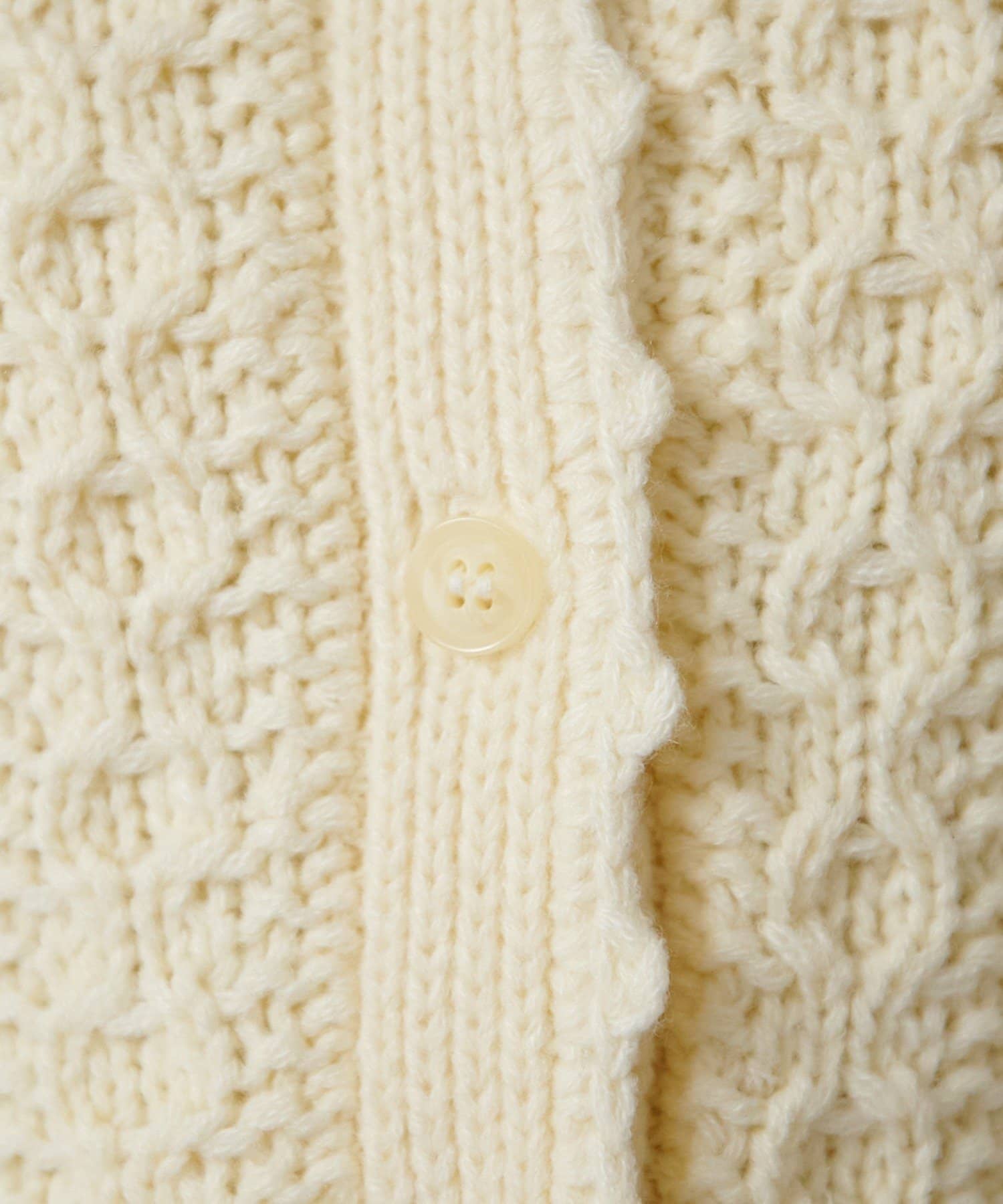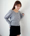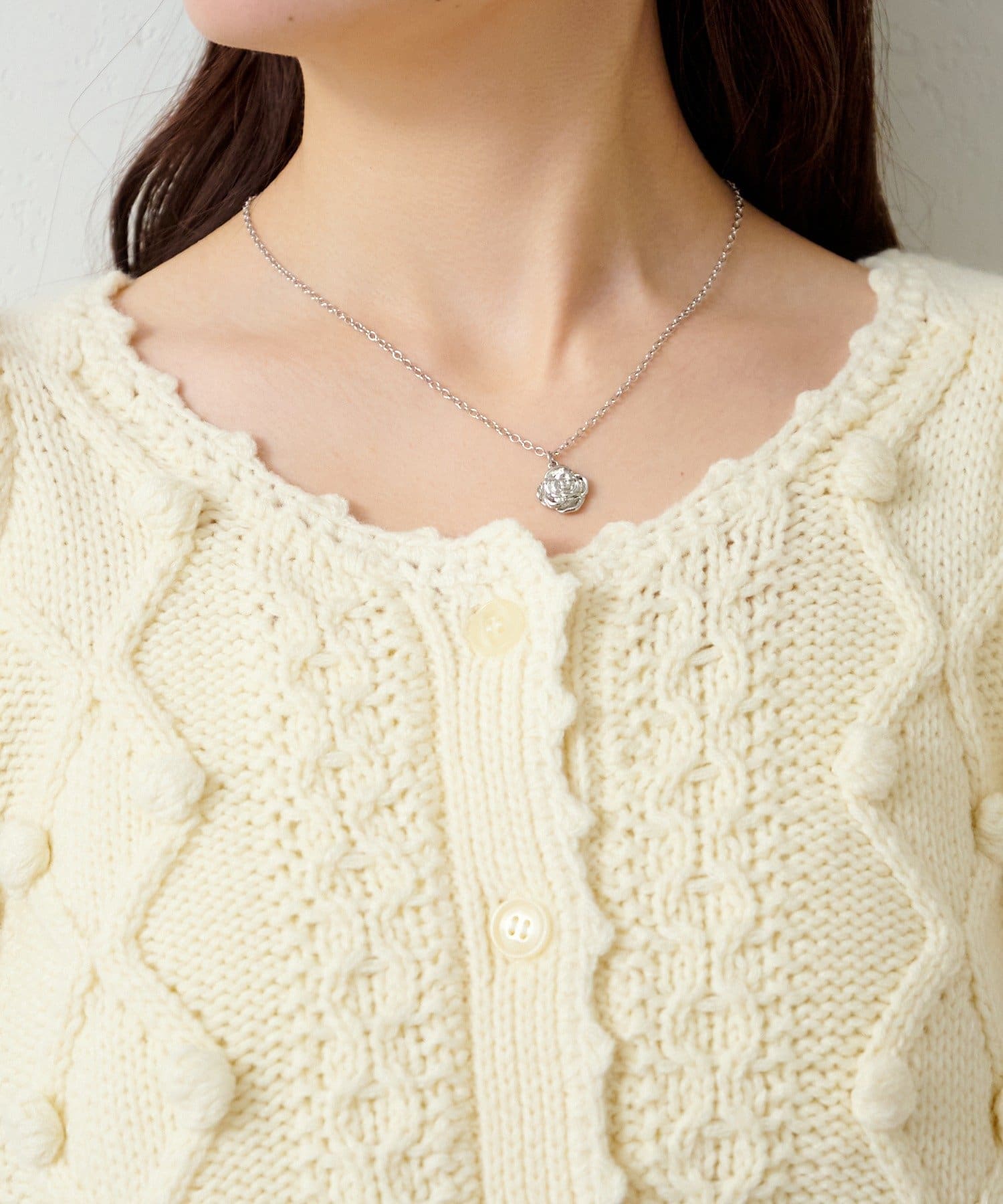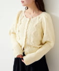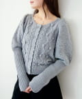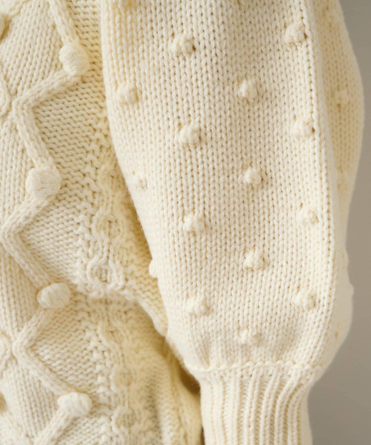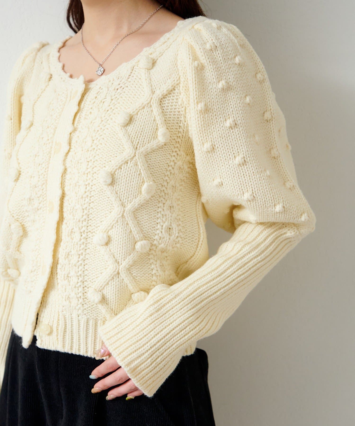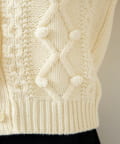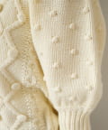 立体的なポンポン装飾と上品な編み柄が合わさった、存在感のある一着です。