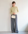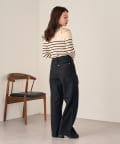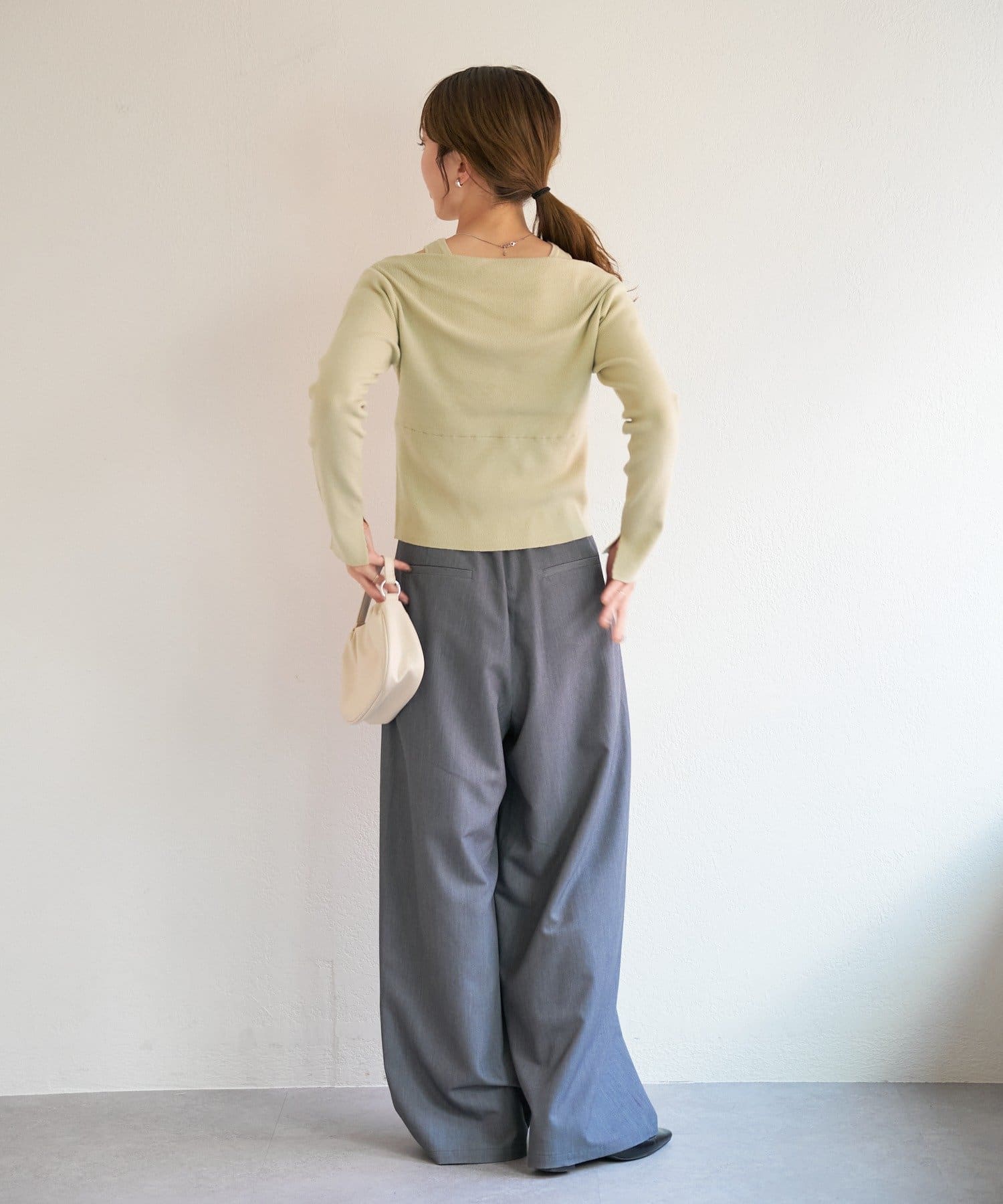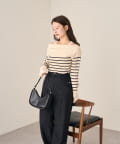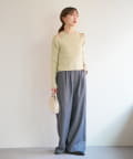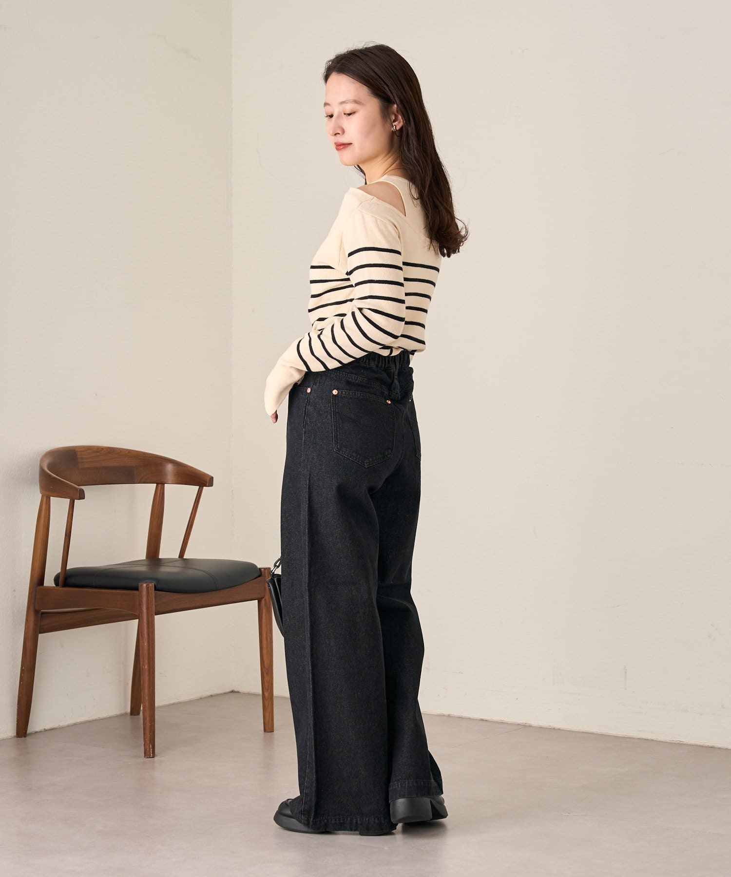 オフショルで肌見せしているので、ボトムはデニムやスラックスと合わせて