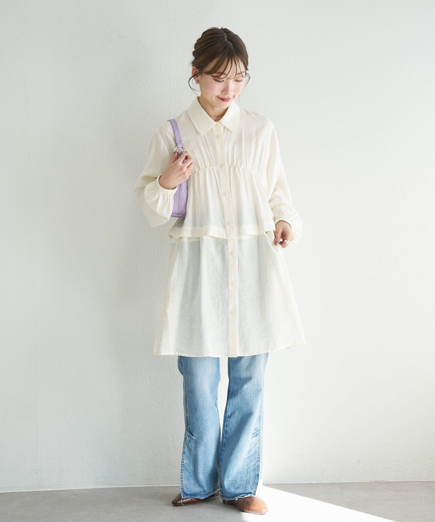 胸下のギャザー切り替えがふんわりと広がり、体型をさりげなくカバーします。