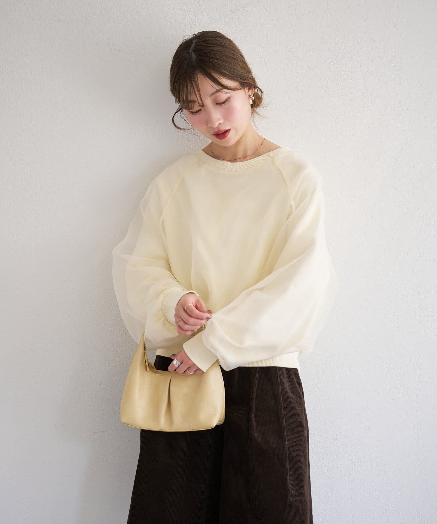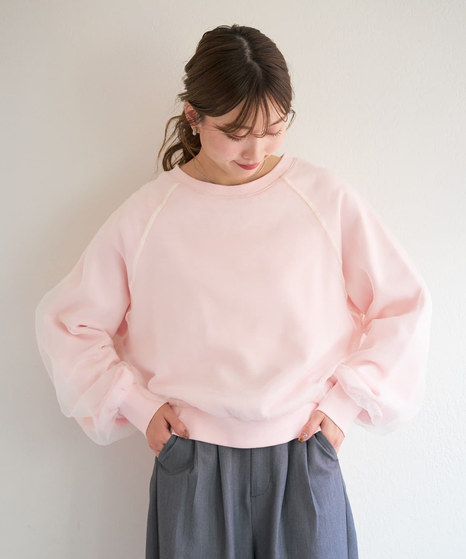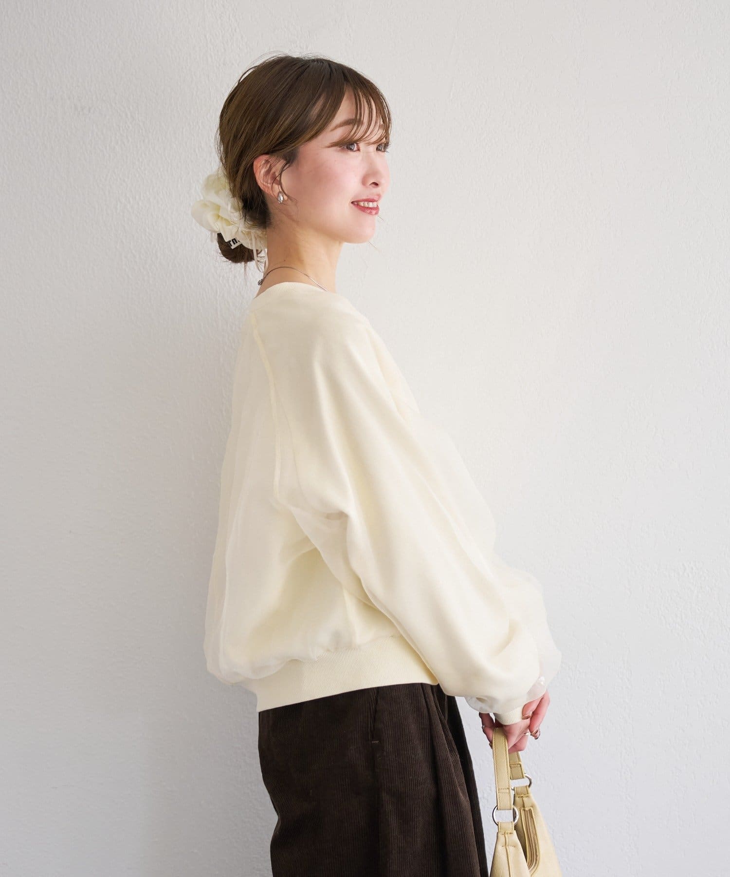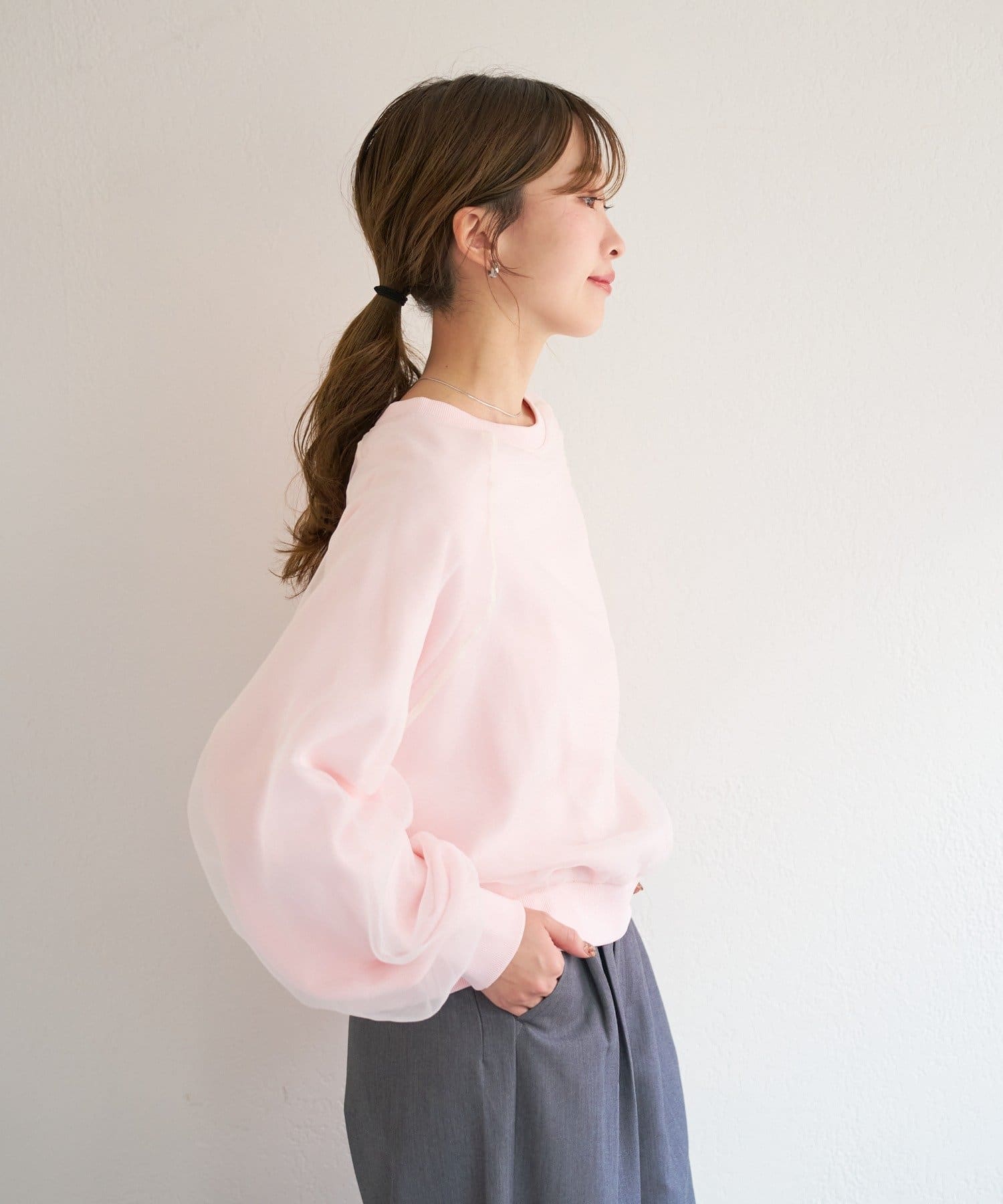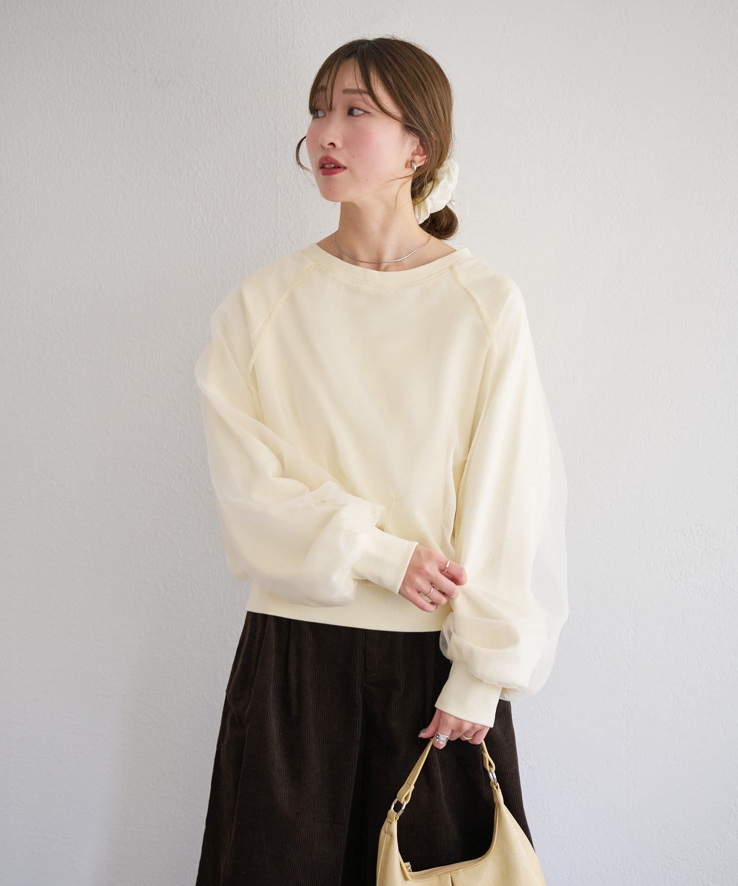 透け感のある袖が軽やかさをプラスし、カジュアルな中にも女性らしさを感じる一枚です。