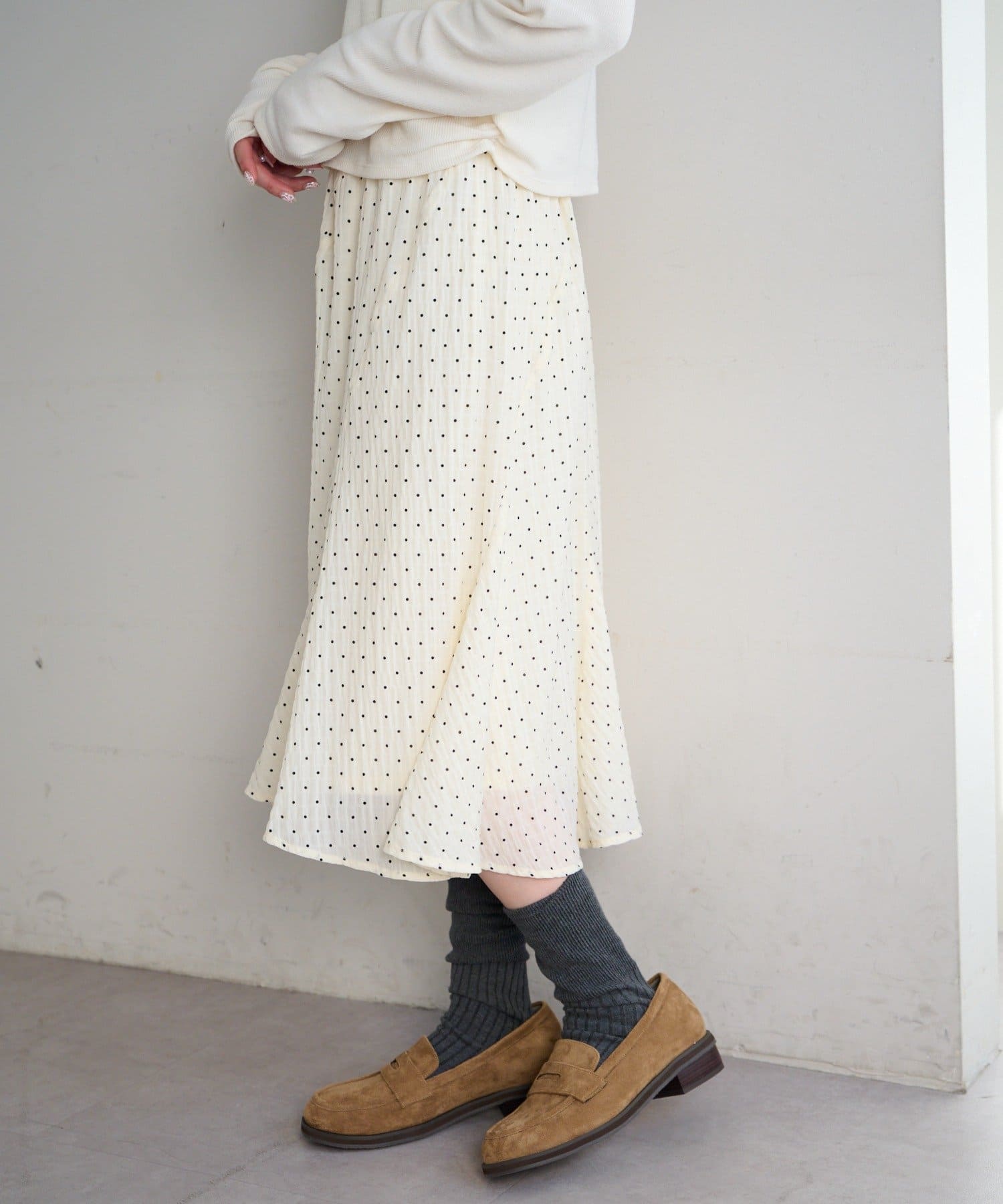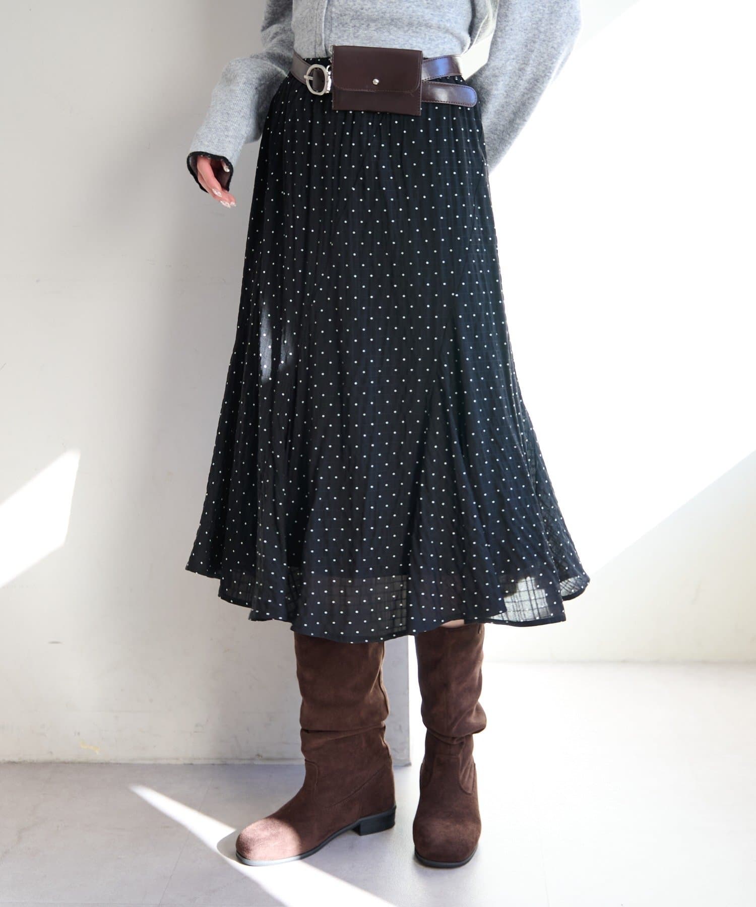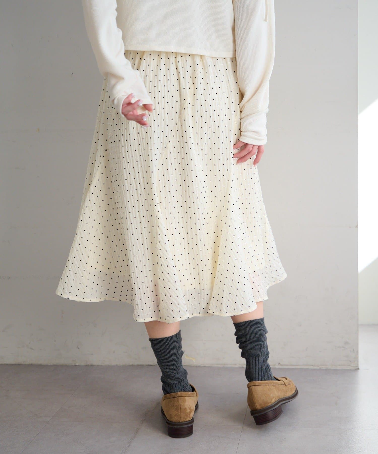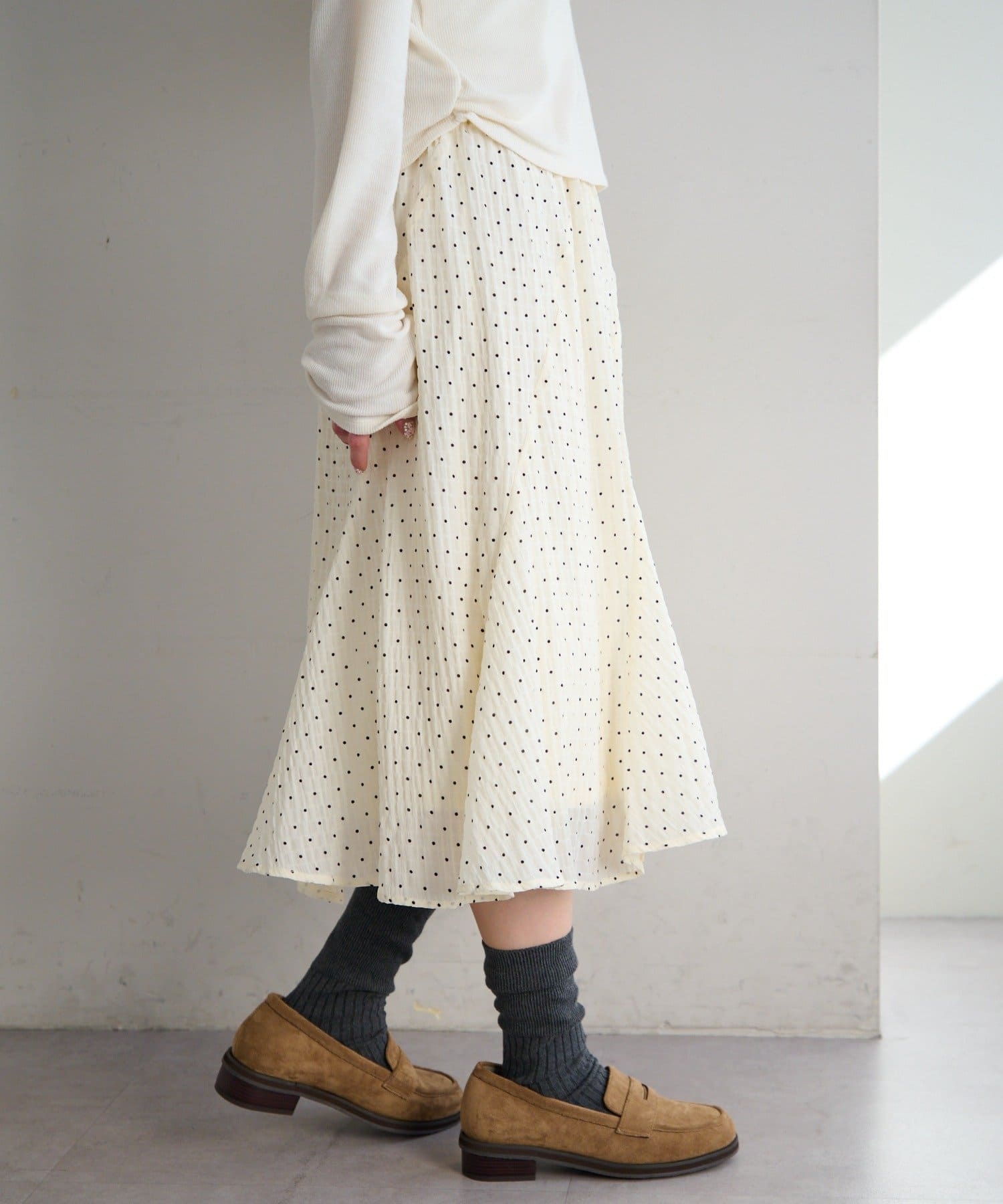 ベーシックなドット柄で、春夏はもちろんロングシーズン使えるシアーミドルスカート。