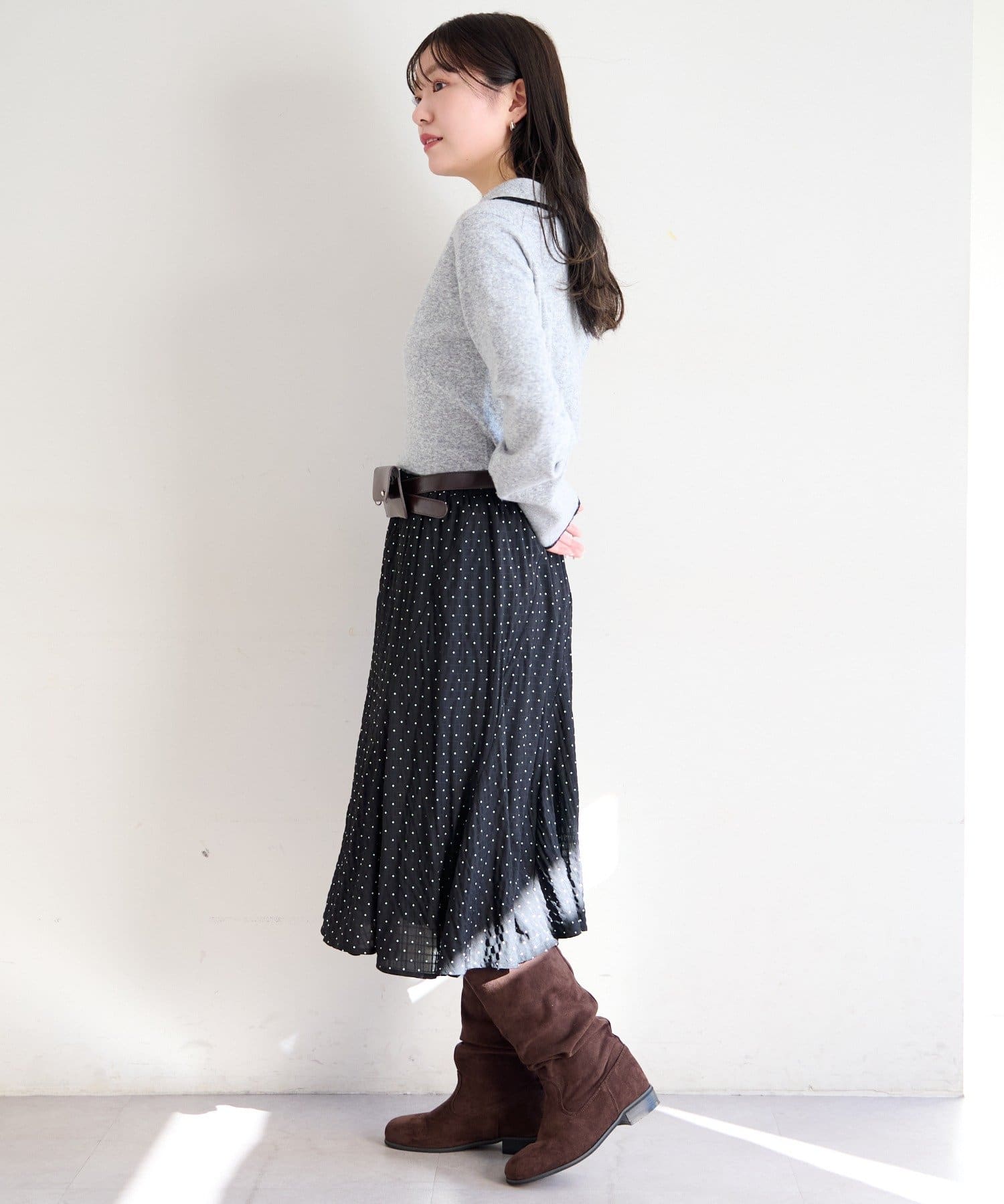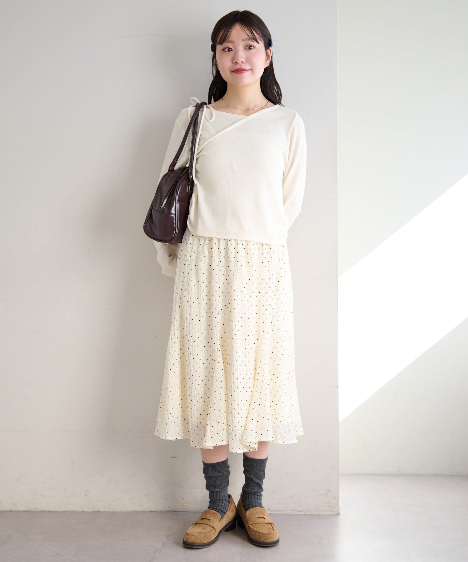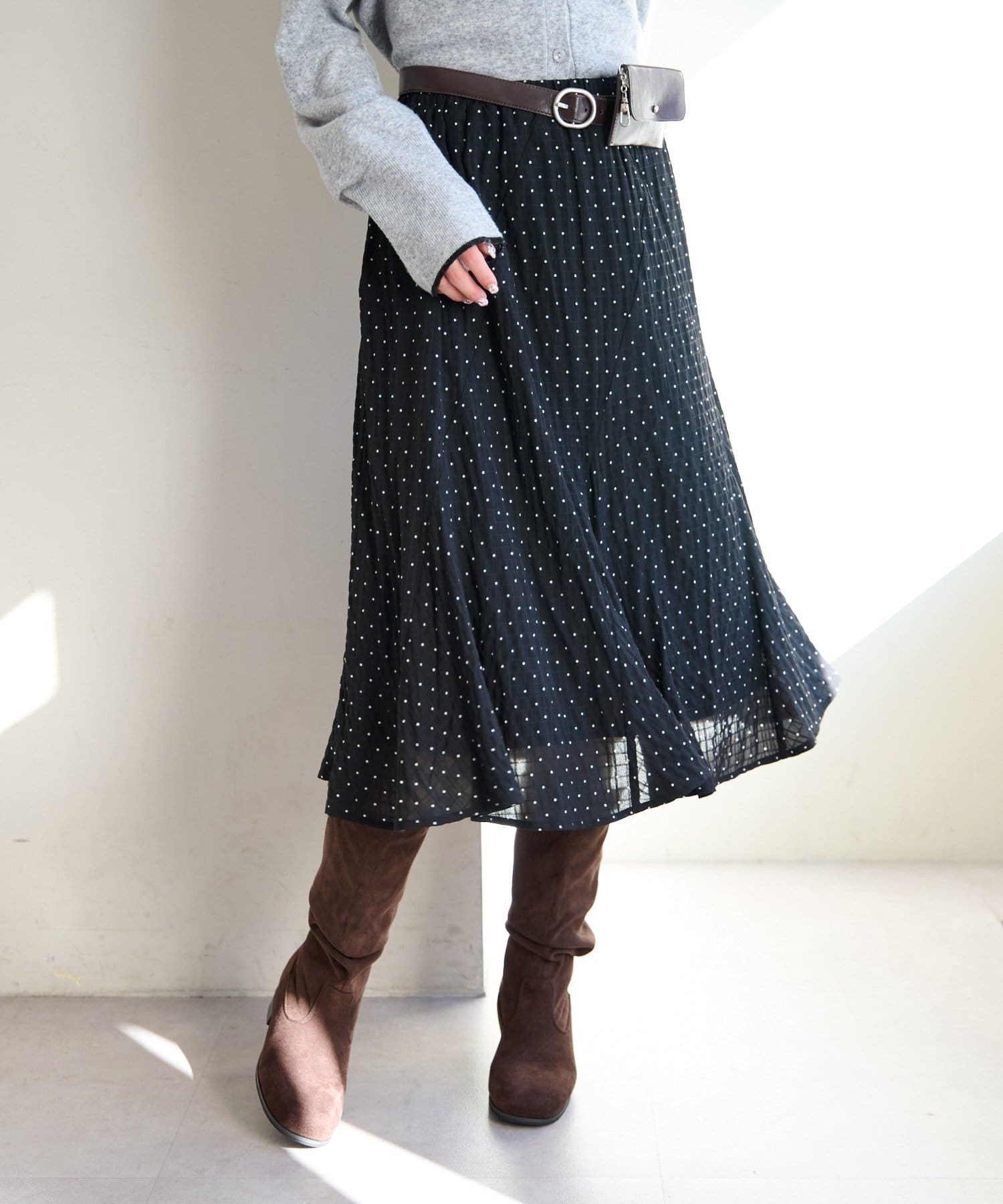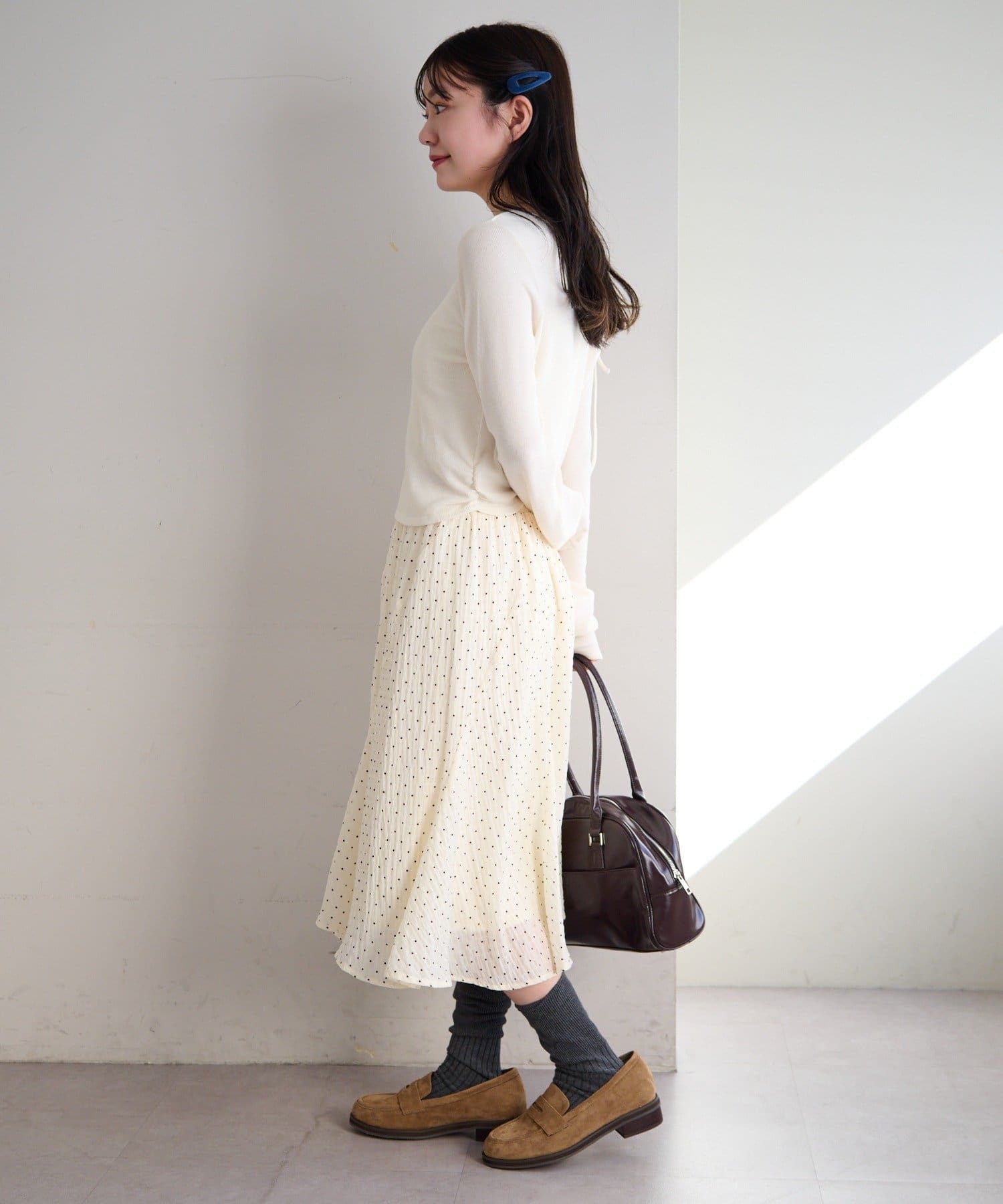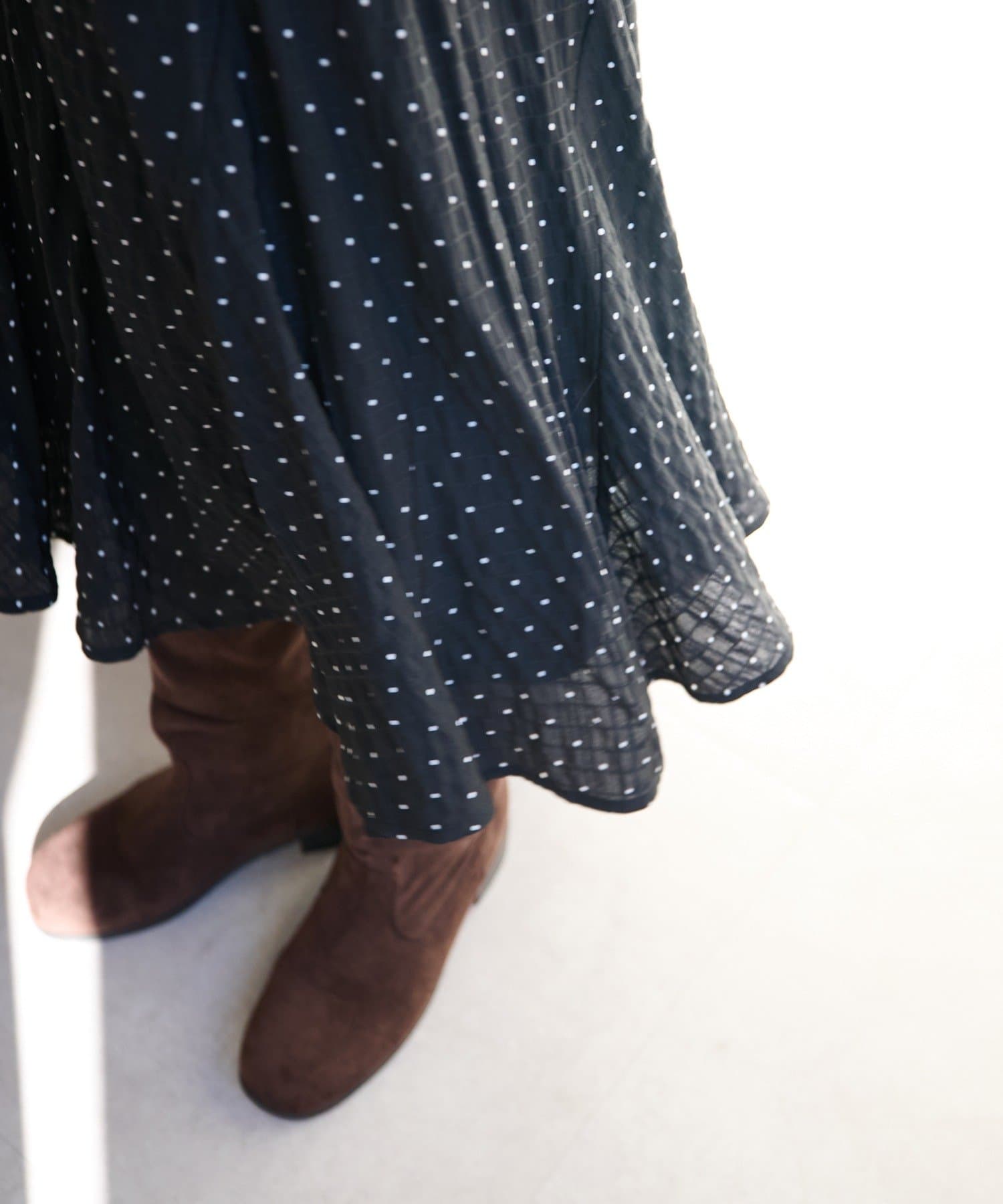 ベーシックなドット柄で、春夏はもちろんロングシーズン使えるシアーミドルスカート。