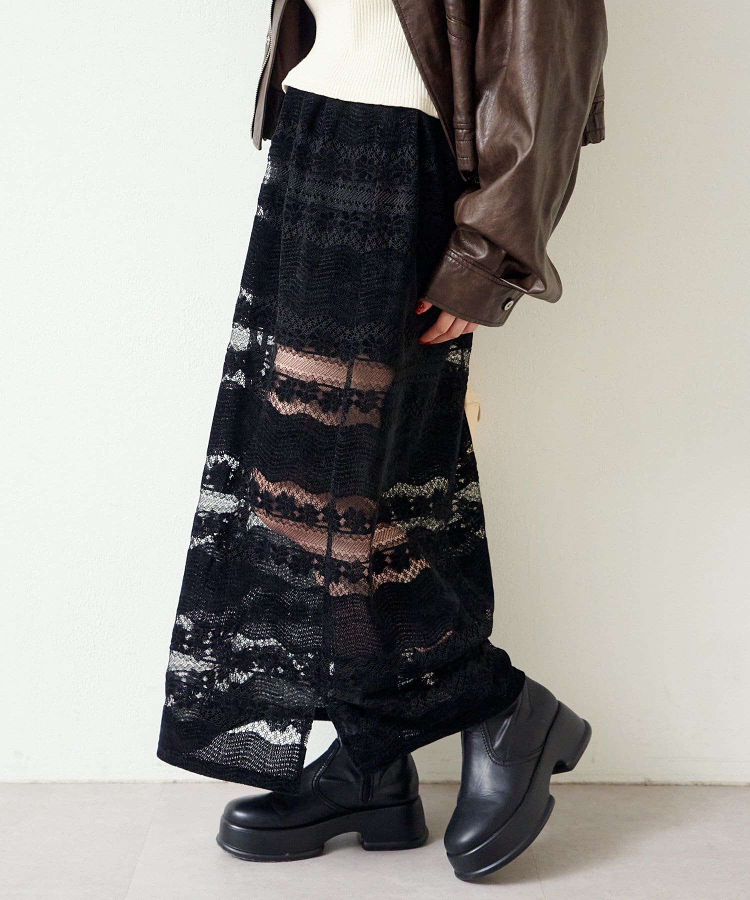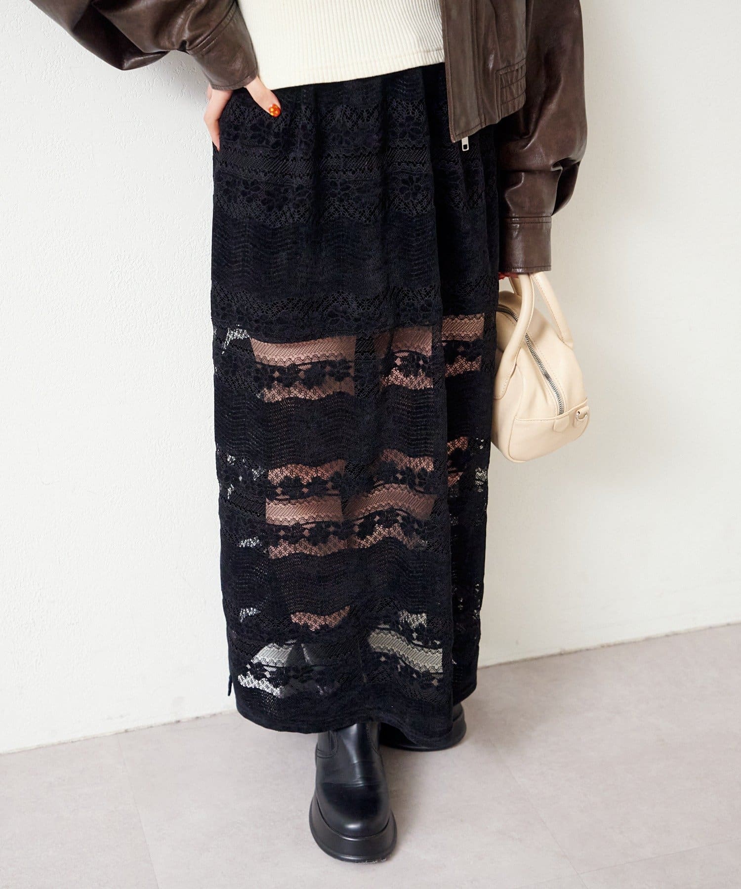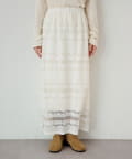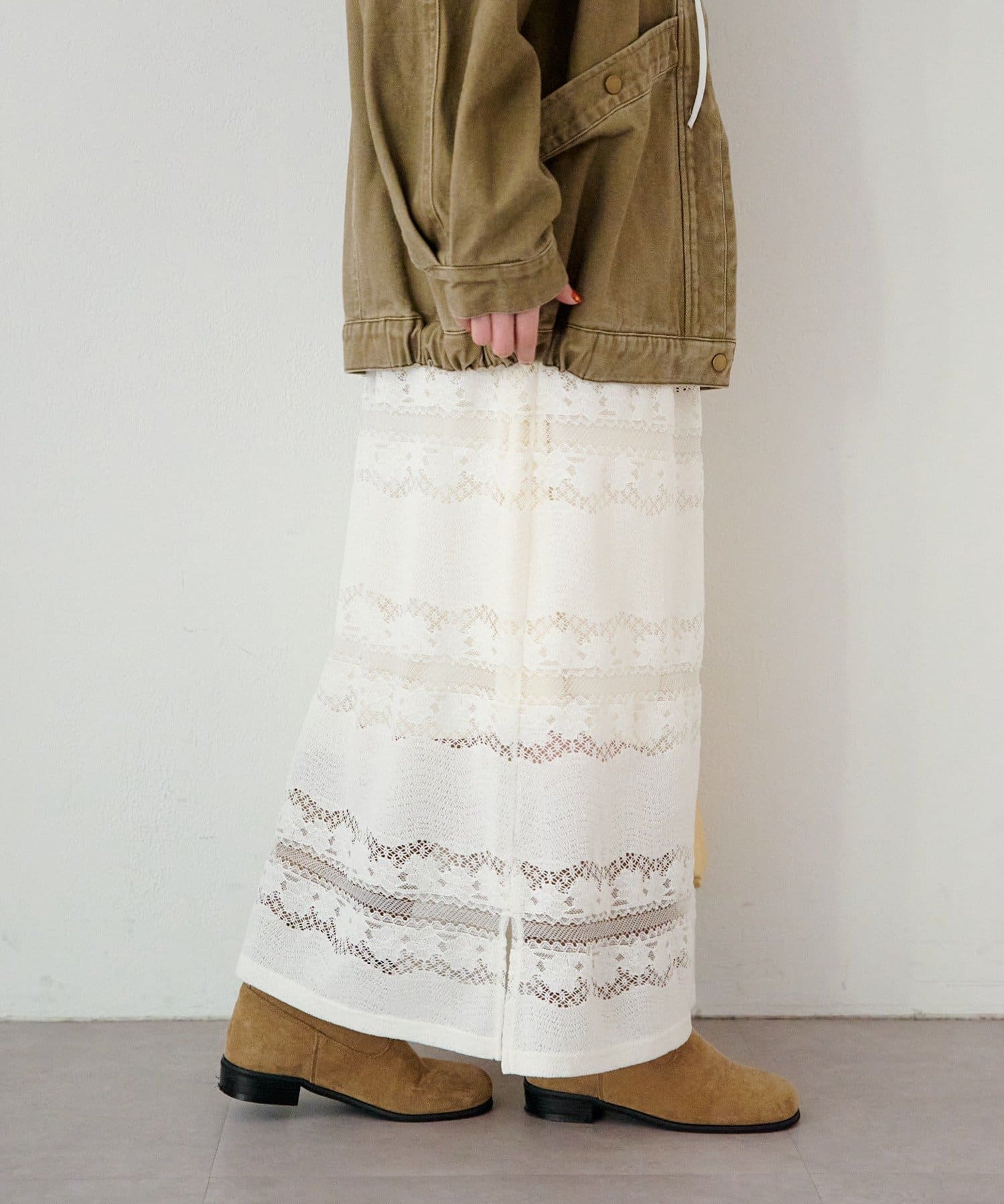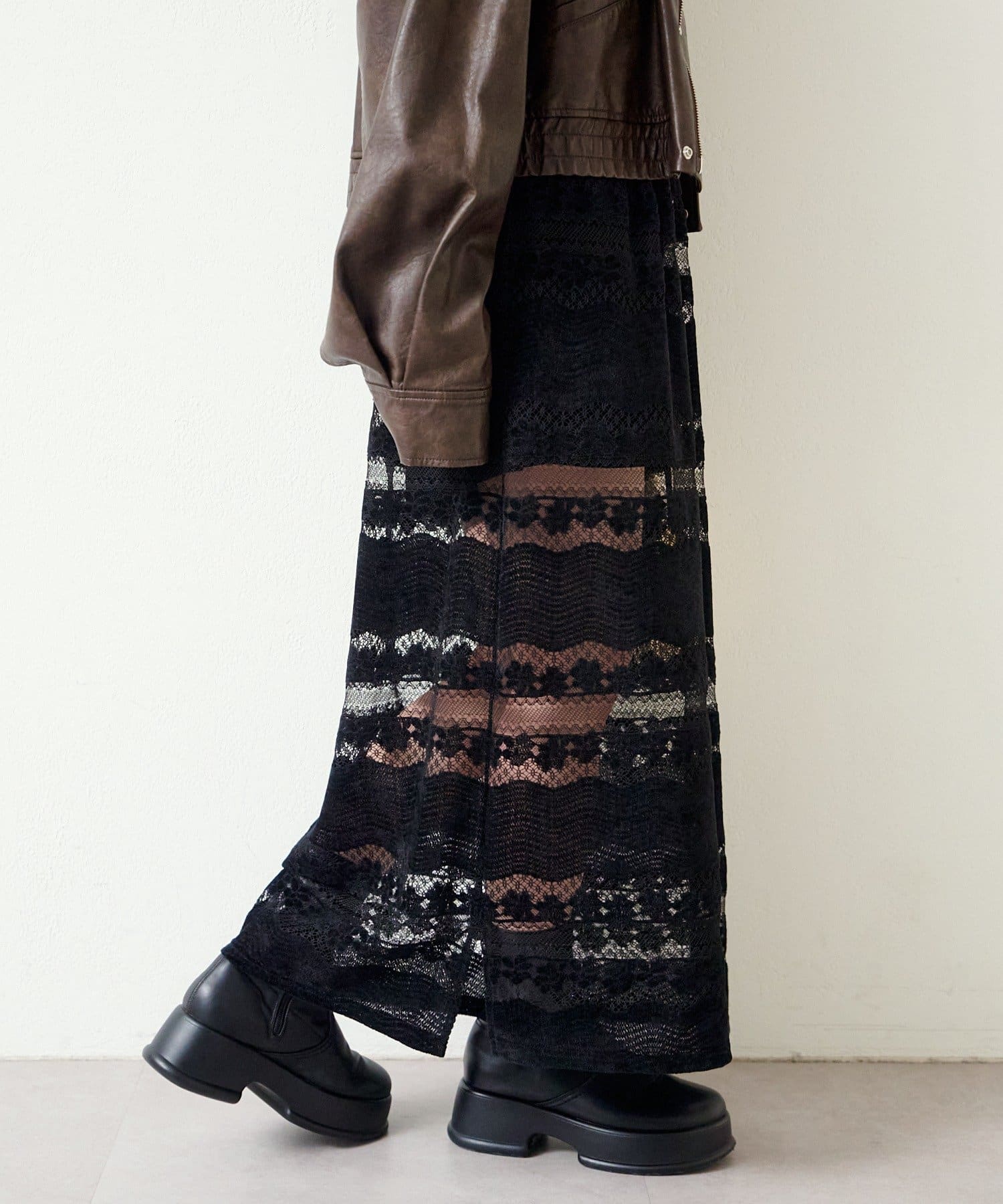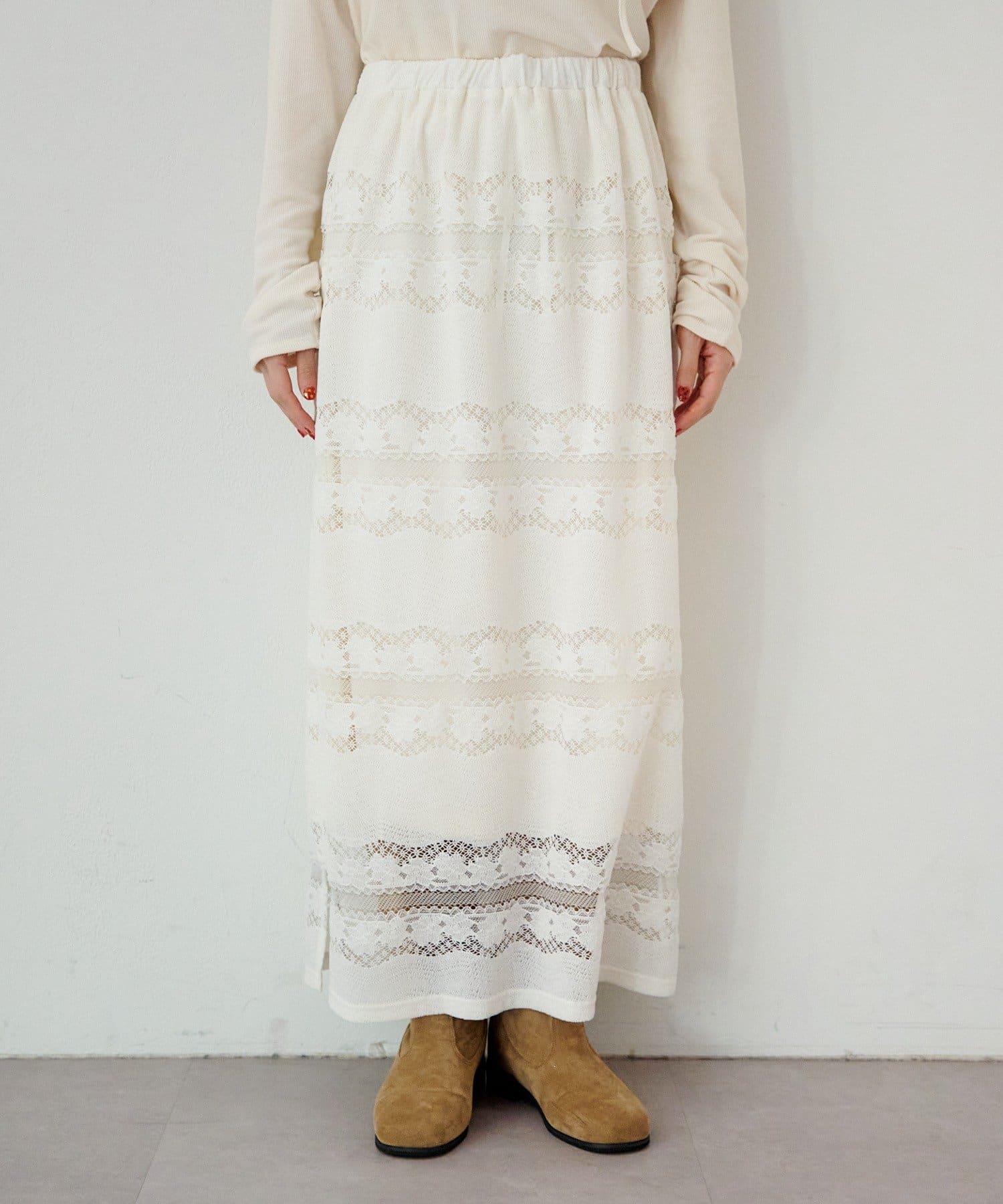 繊細なレースをボーダー状に切り替えた、上品さとモード感を併せ持つロングスカート。