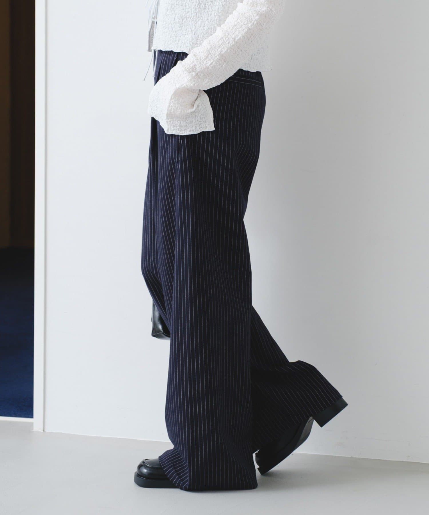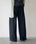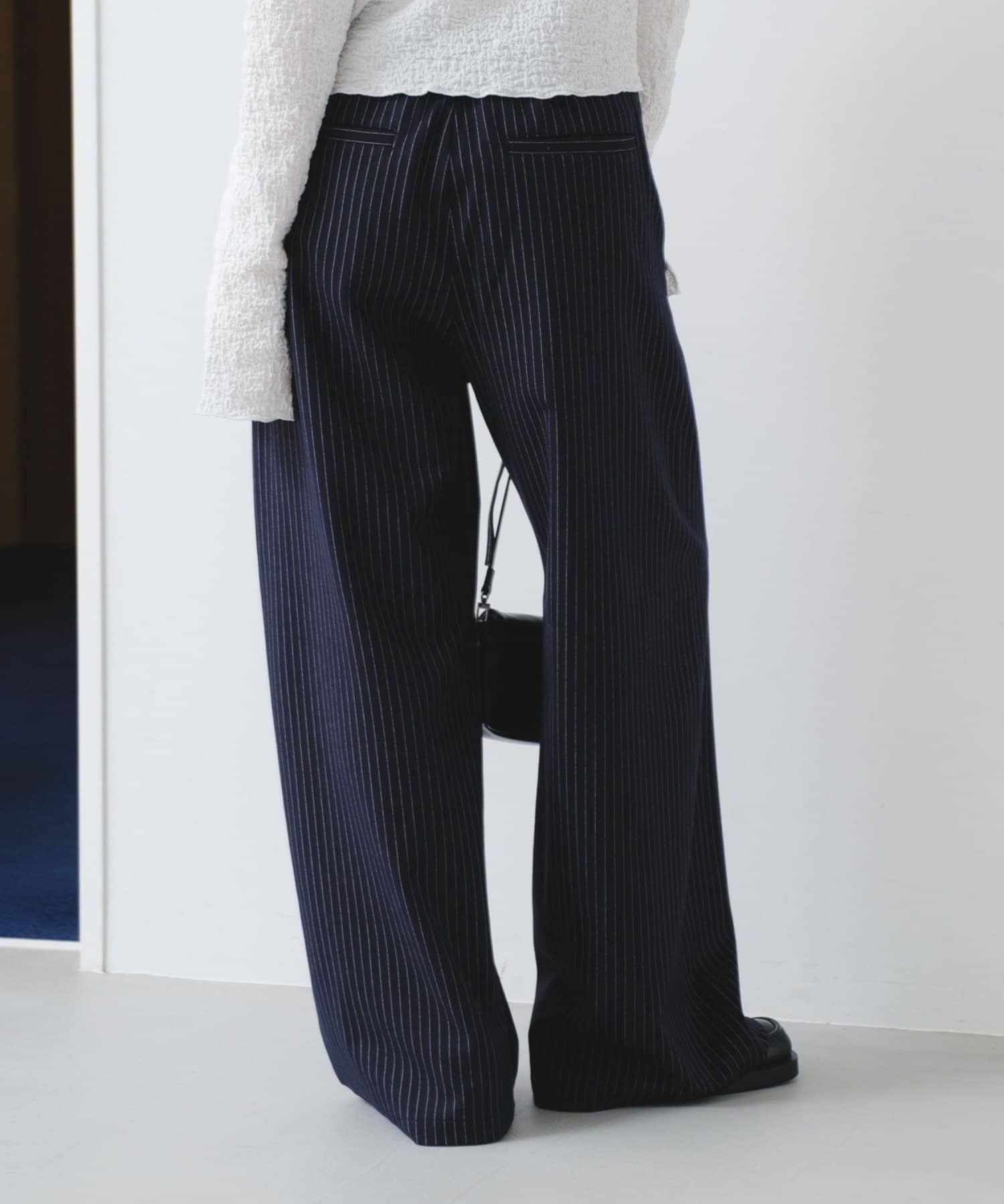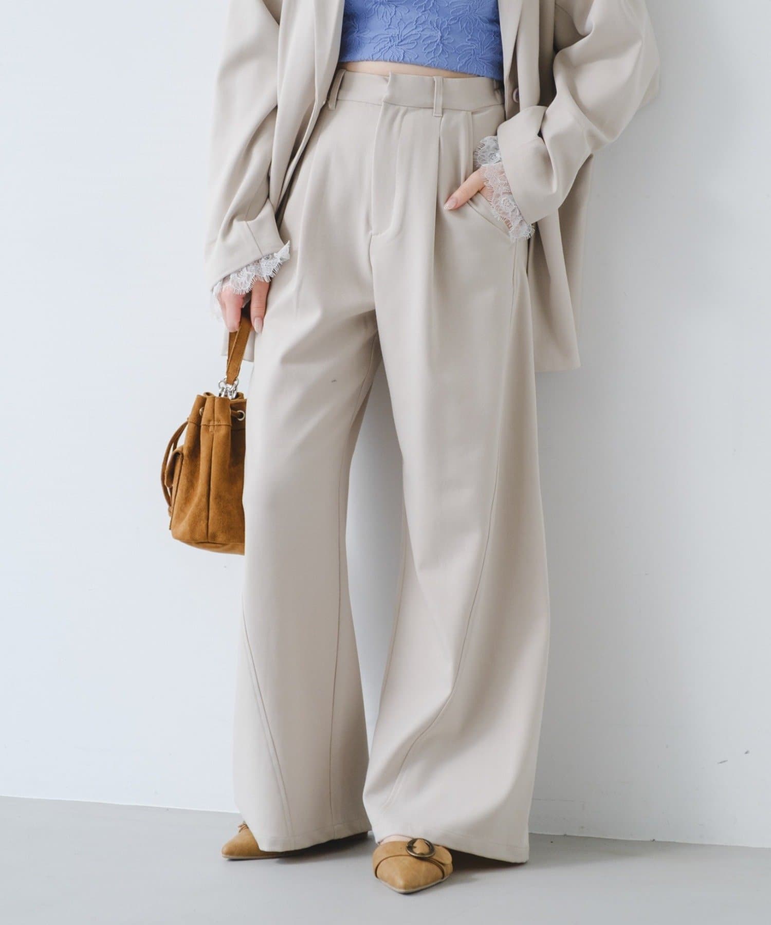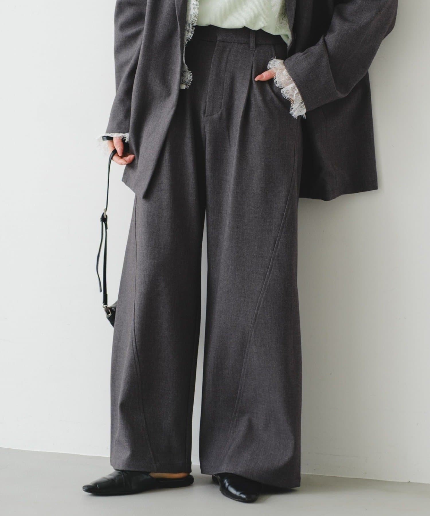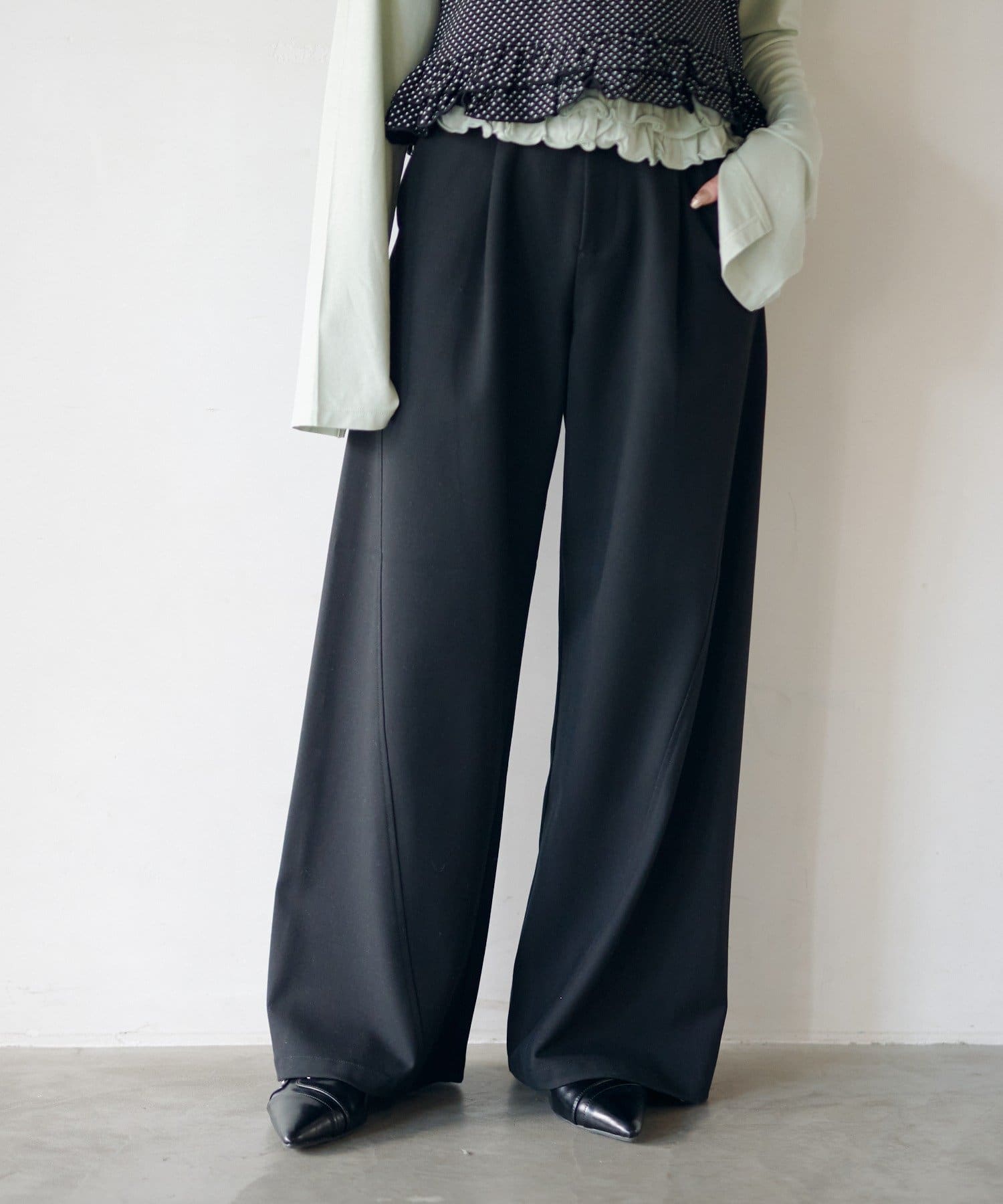 脚のラインに沿って緩やかにカーブを描くシルエットが特徴のスラックス。