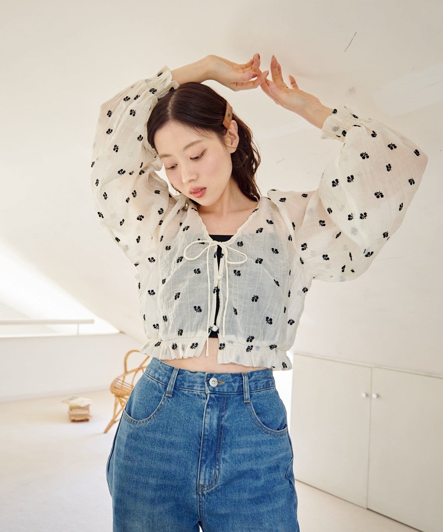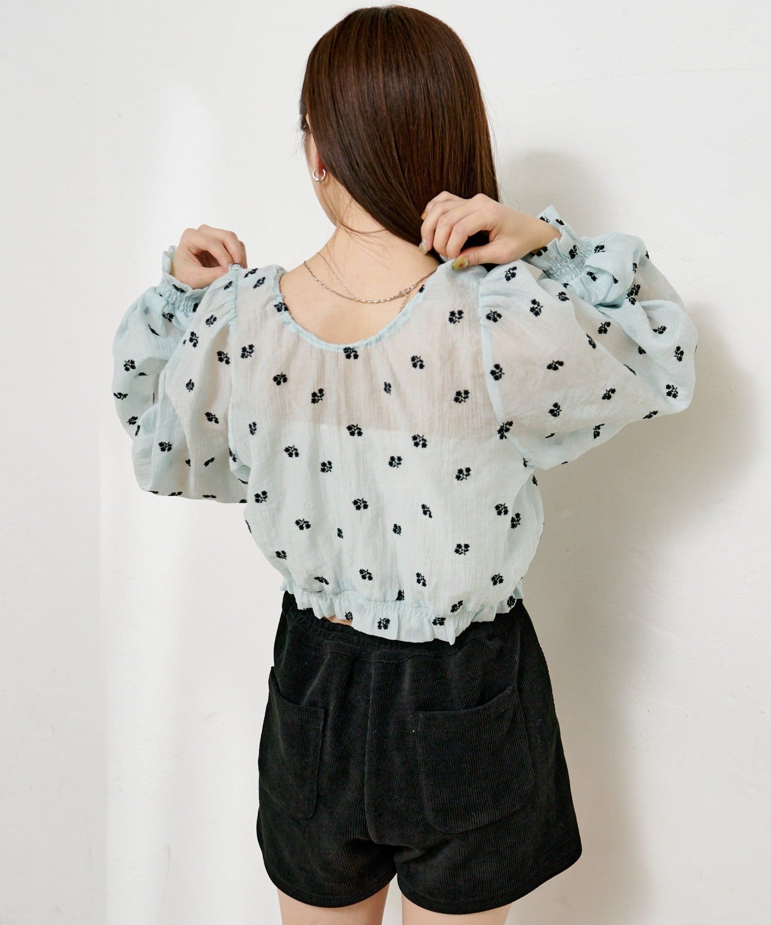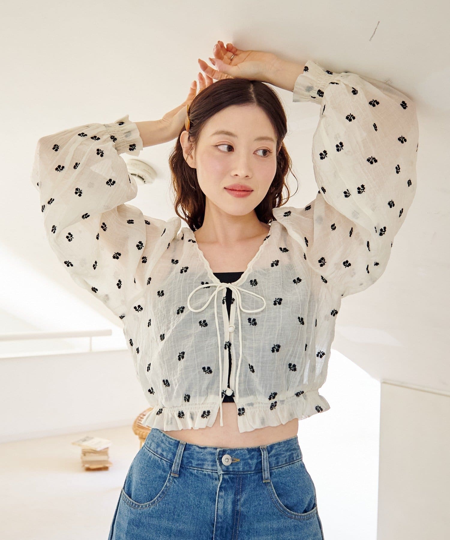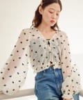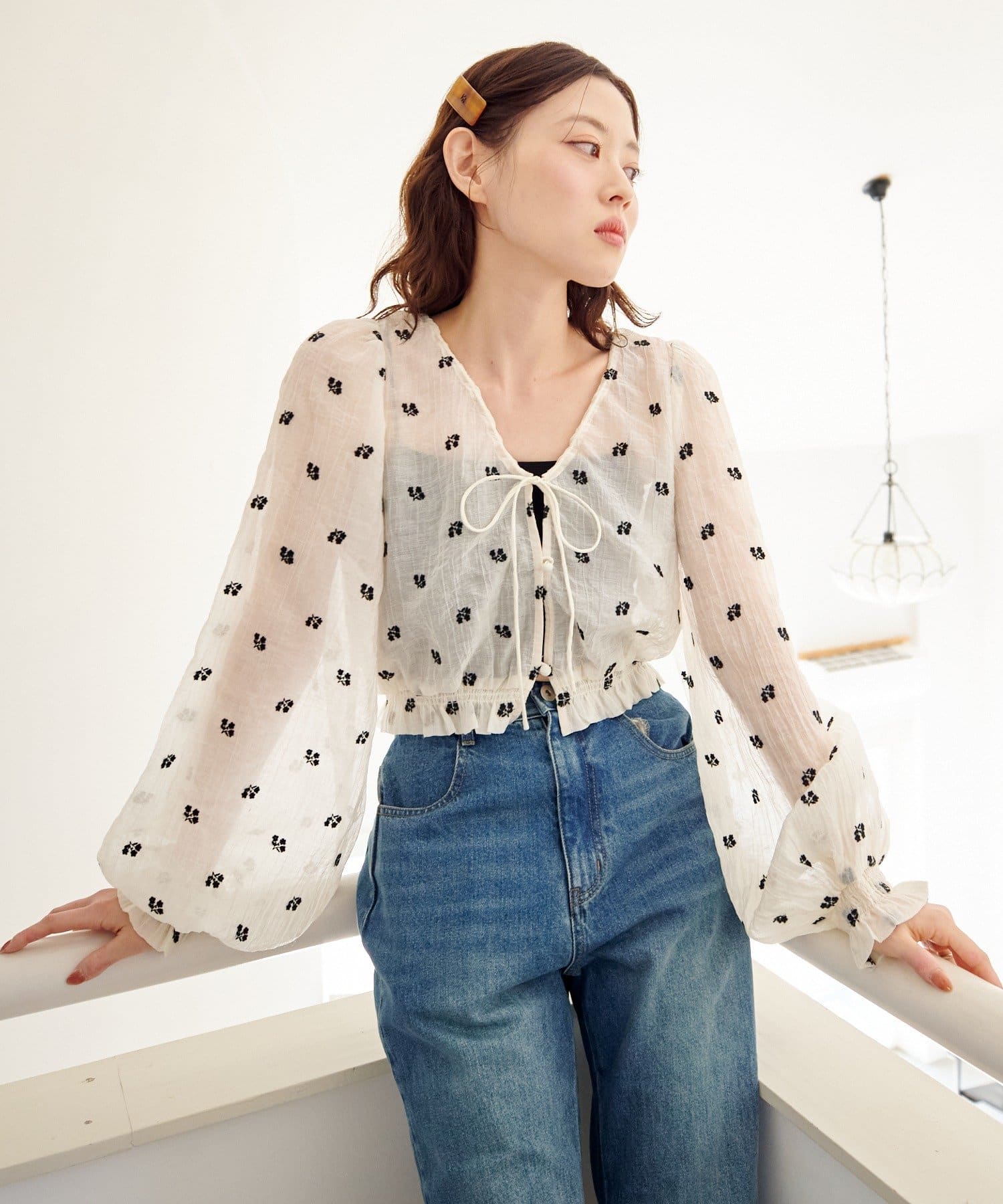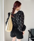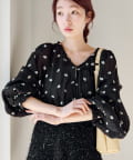 軽やかなシアー素材にふんわりボリューム袖を合わせ、着るだけで柔らかい雰囲気に仕上がります。