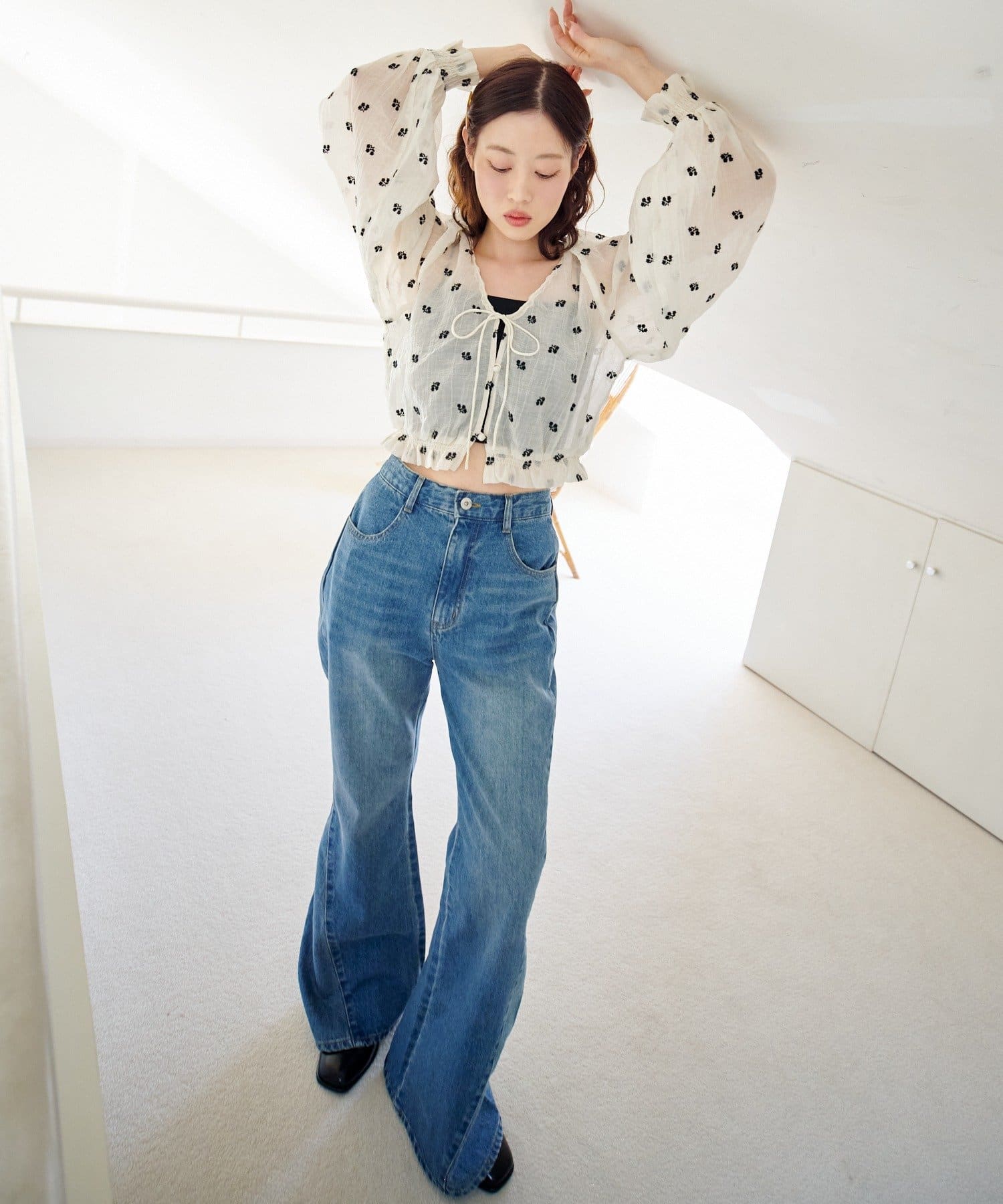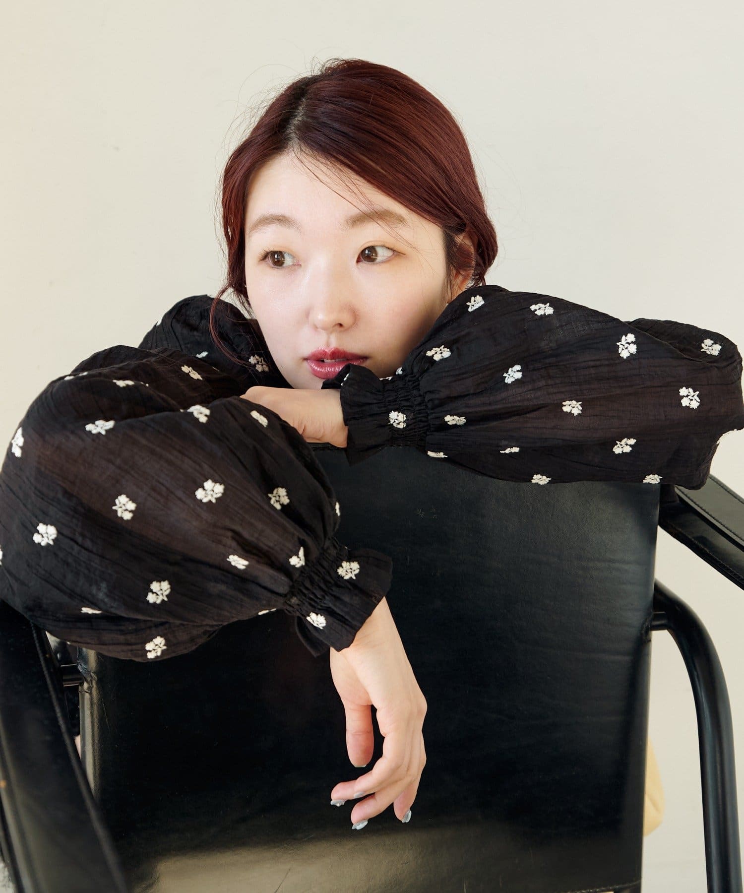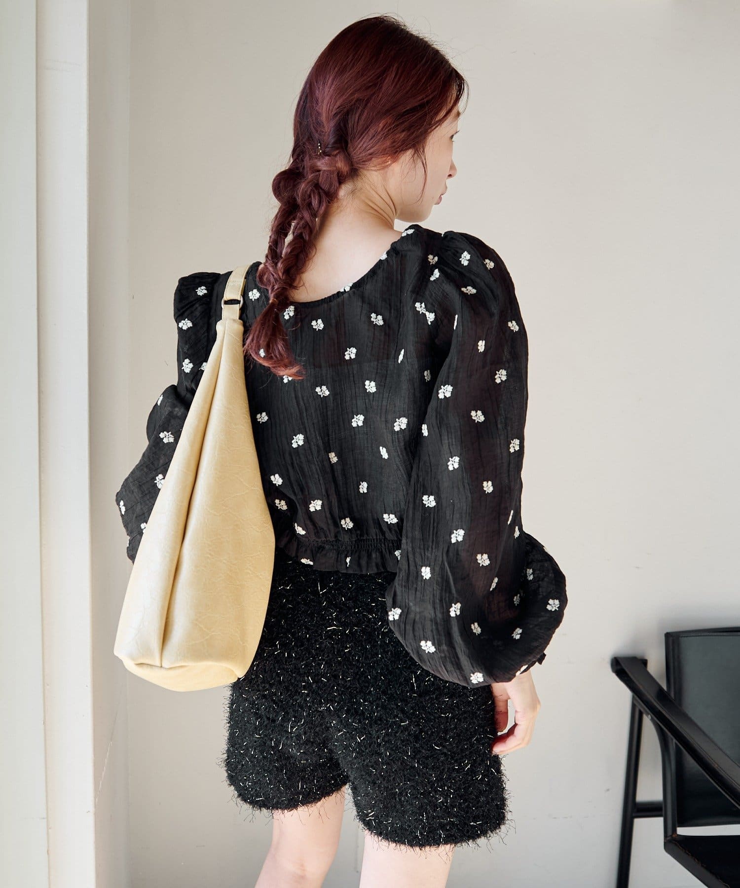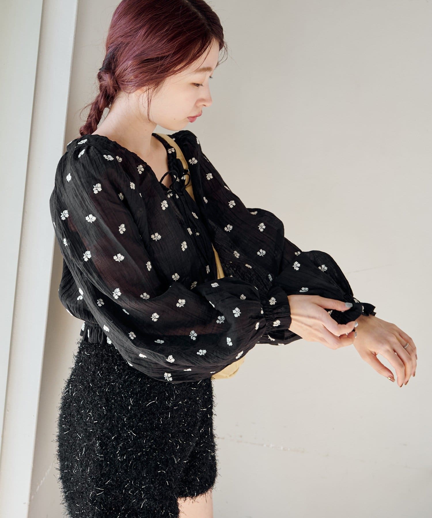 軽やかなシアー素材にふんわりボリューム袖を合わせ、着るだけで柔らかい雰囲気に仕上がります。