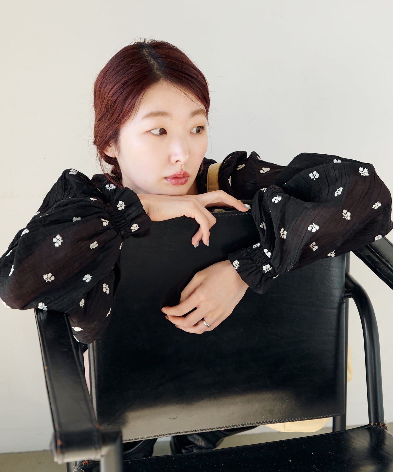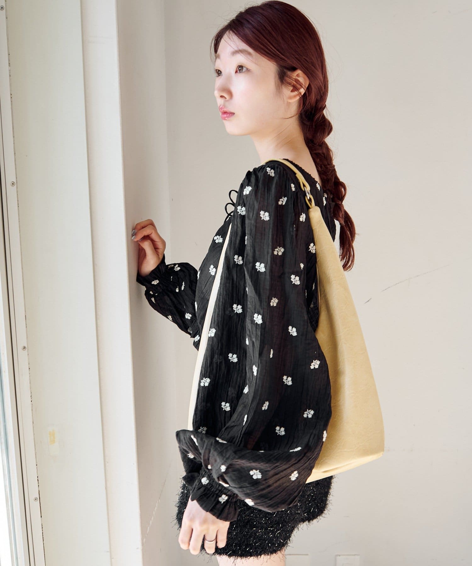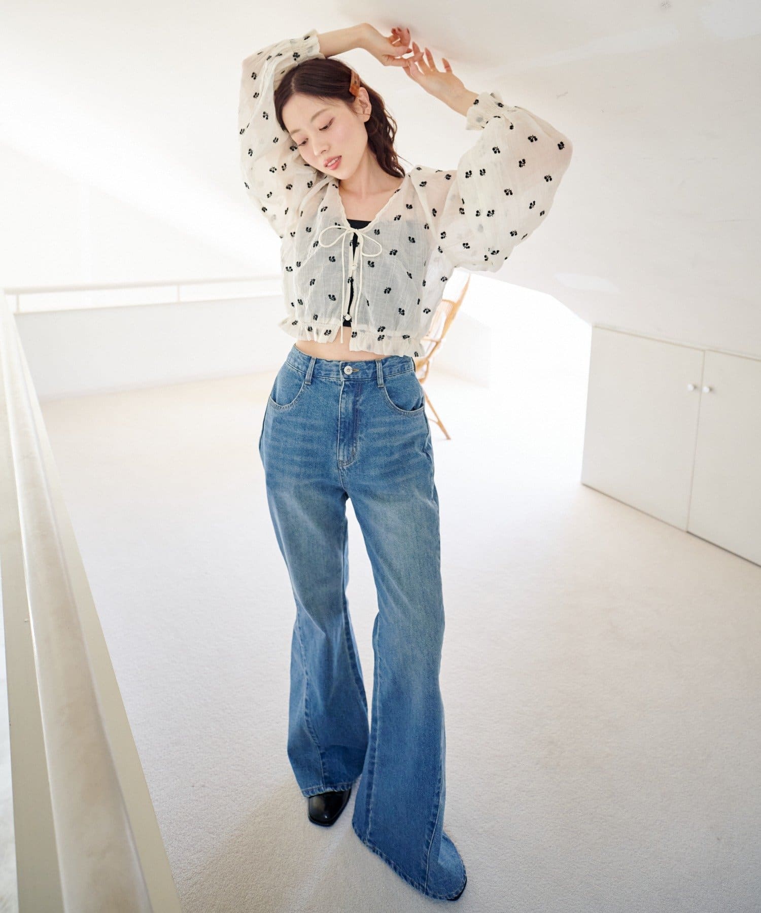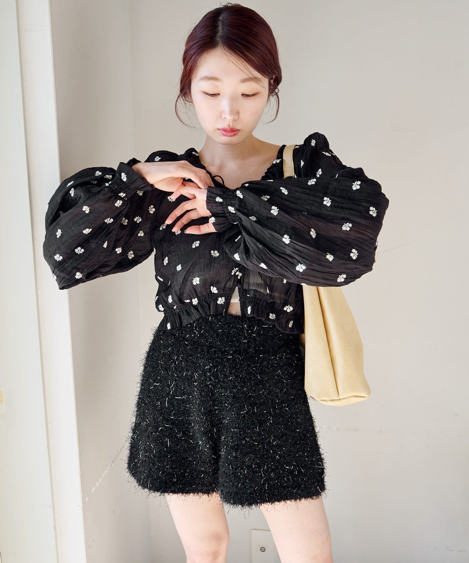 軽やかなシアー素材にふんわりボリューム袖を合わせ、着るだけで柔らかい雰囲気に仕上がります。
