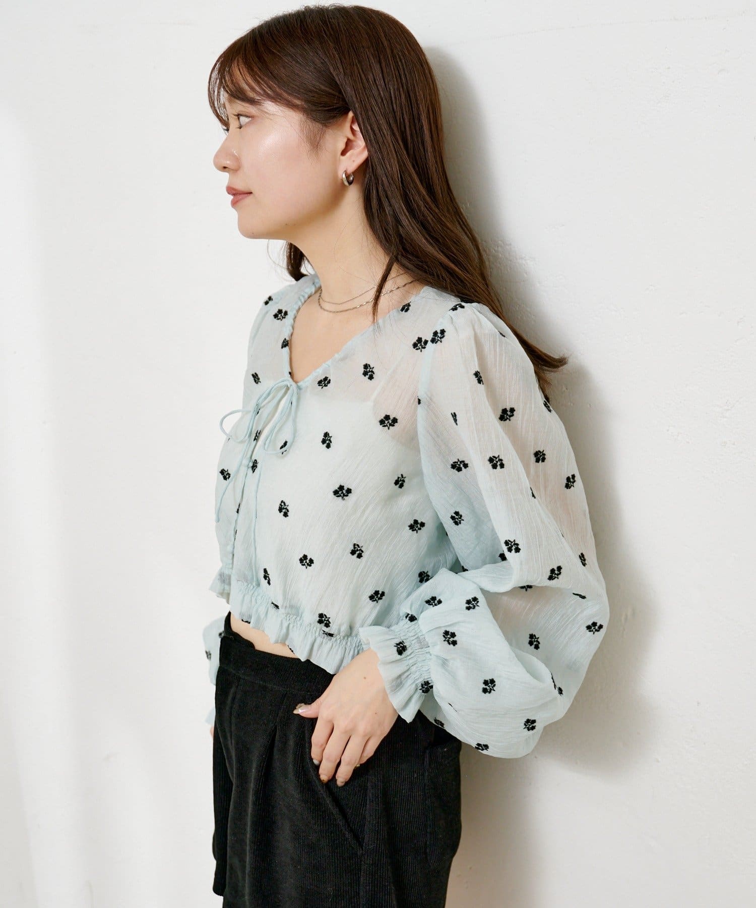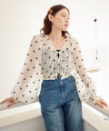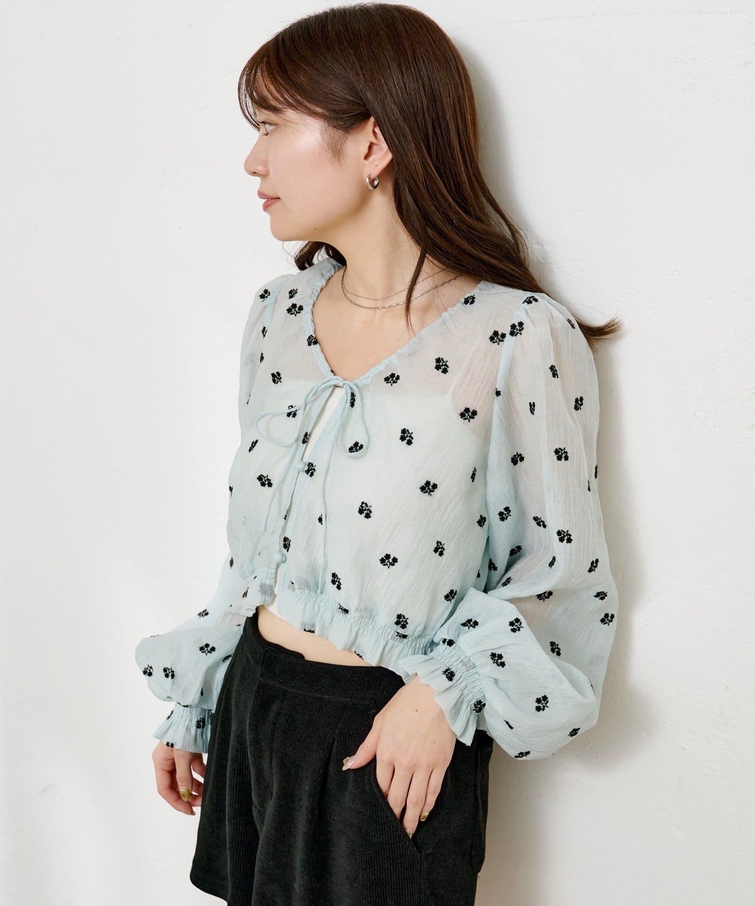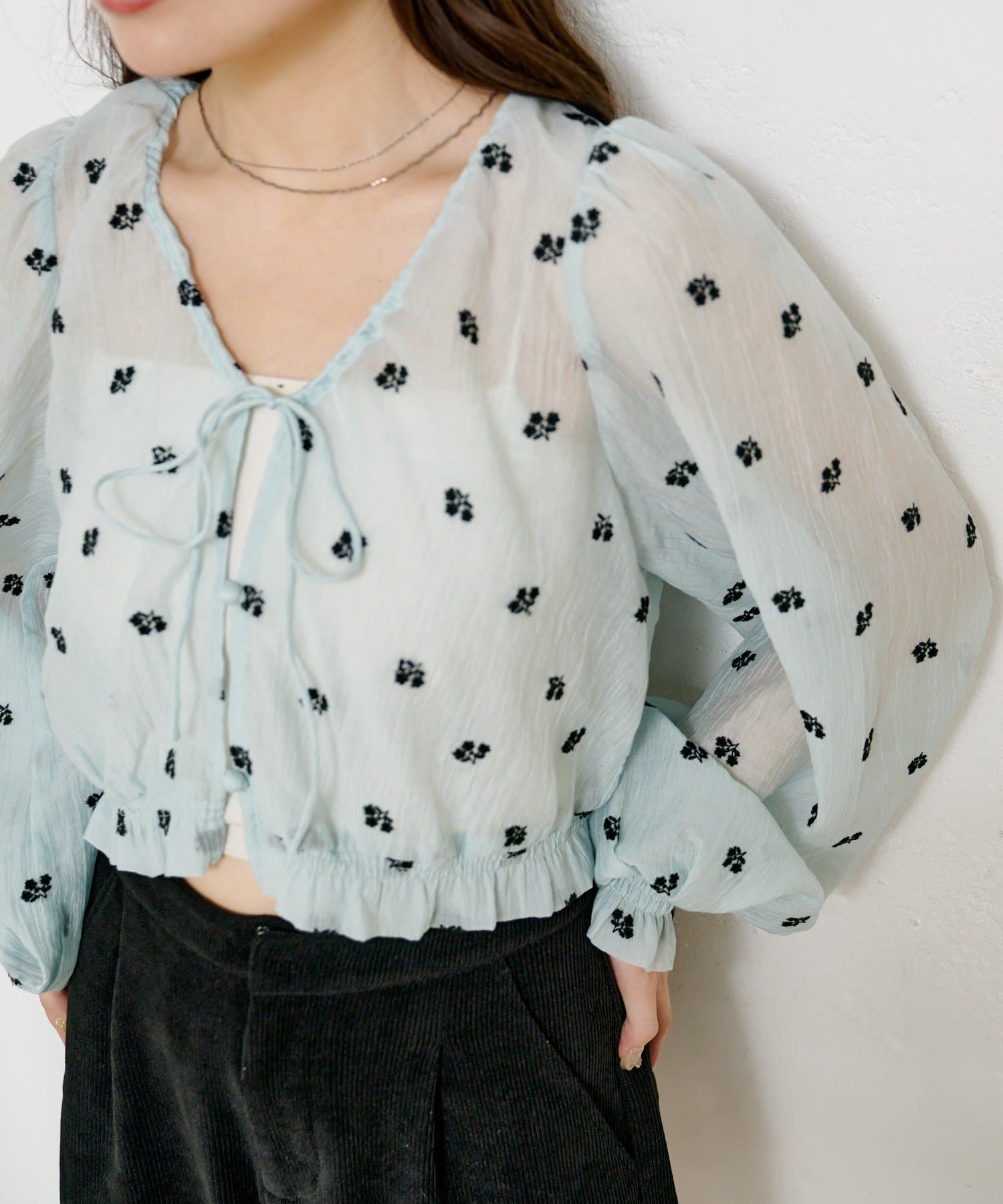 繊細なフラワーステッチが目を惹く、透明感たっぷりのフロントリボンブラウス。