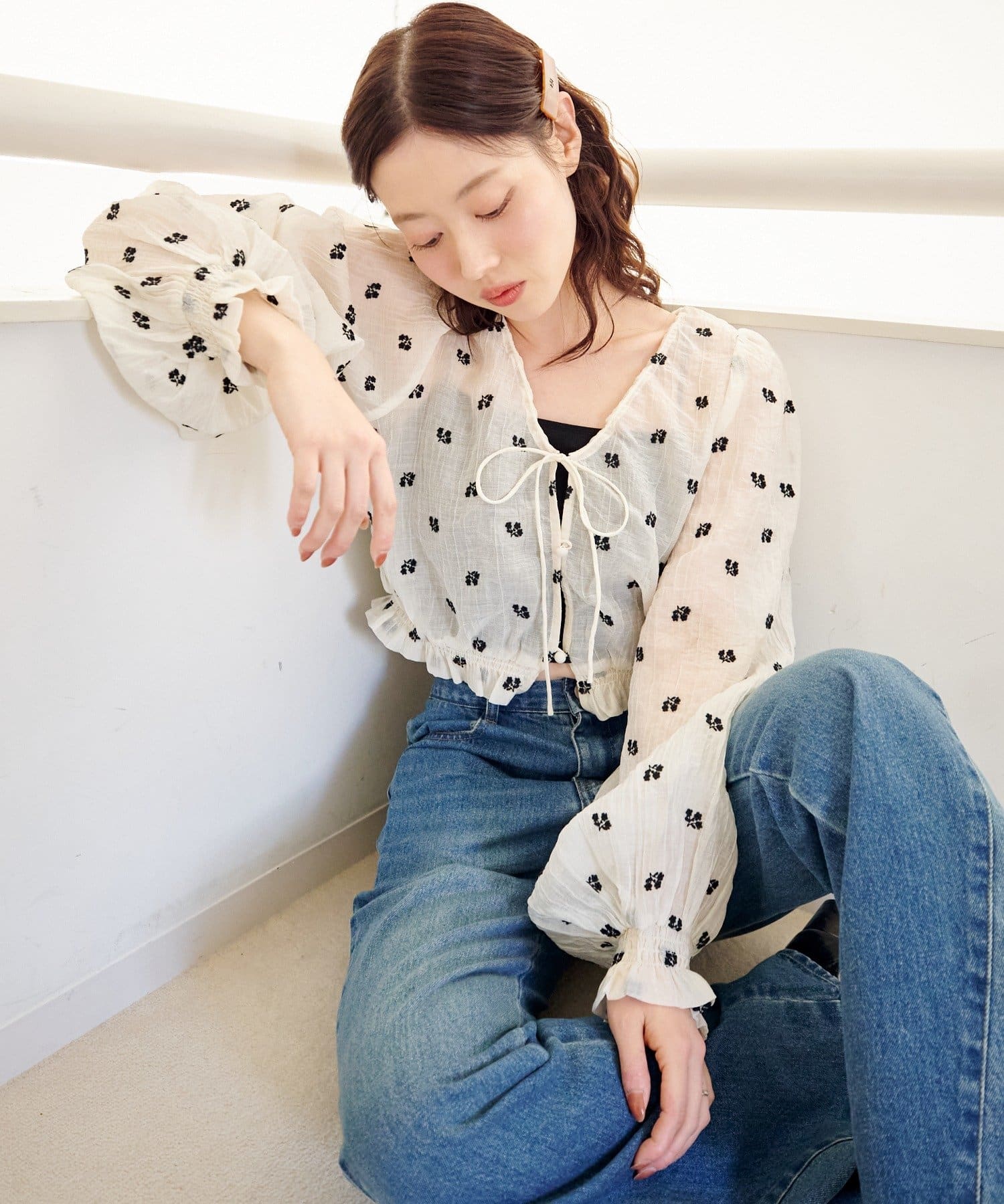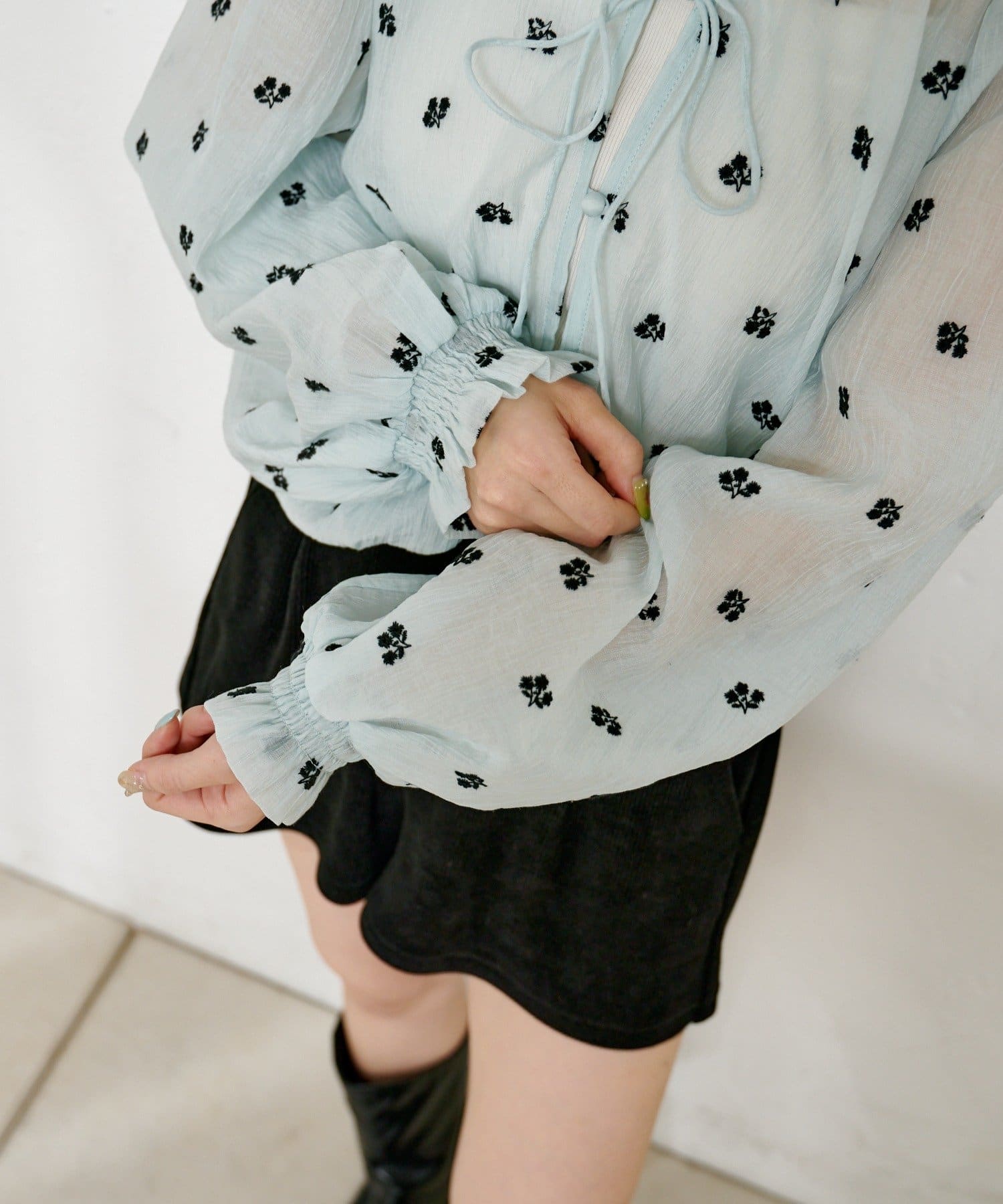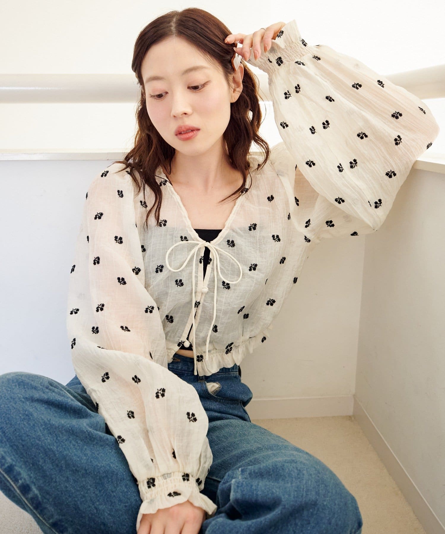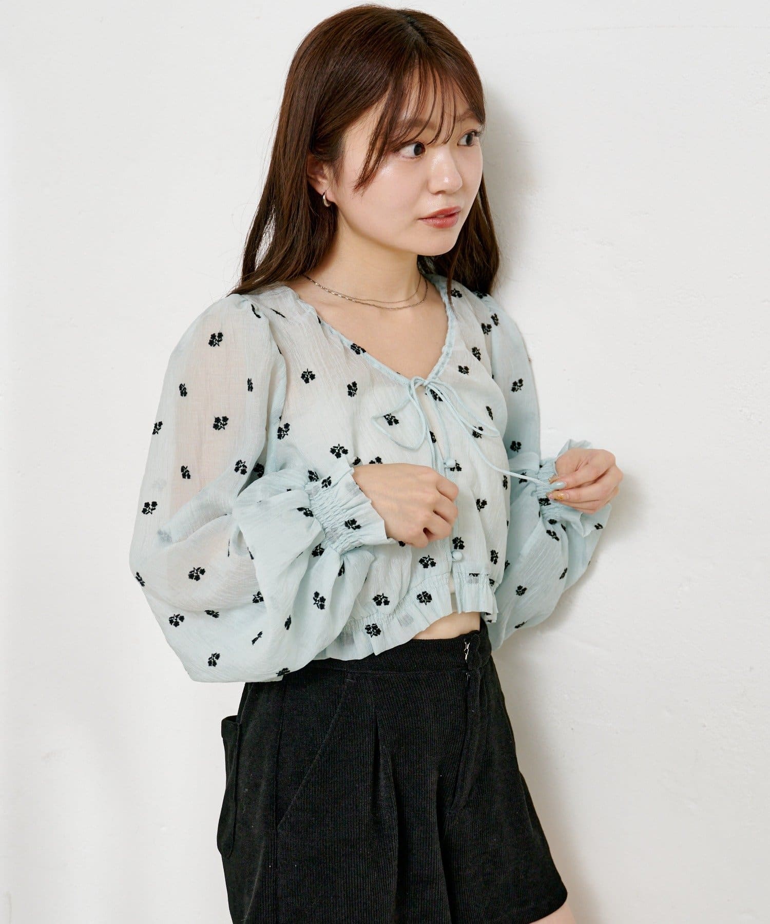 繊細なフラワーステッチが目を惹く、透明感たっぷりのフロントリボンブラウス。