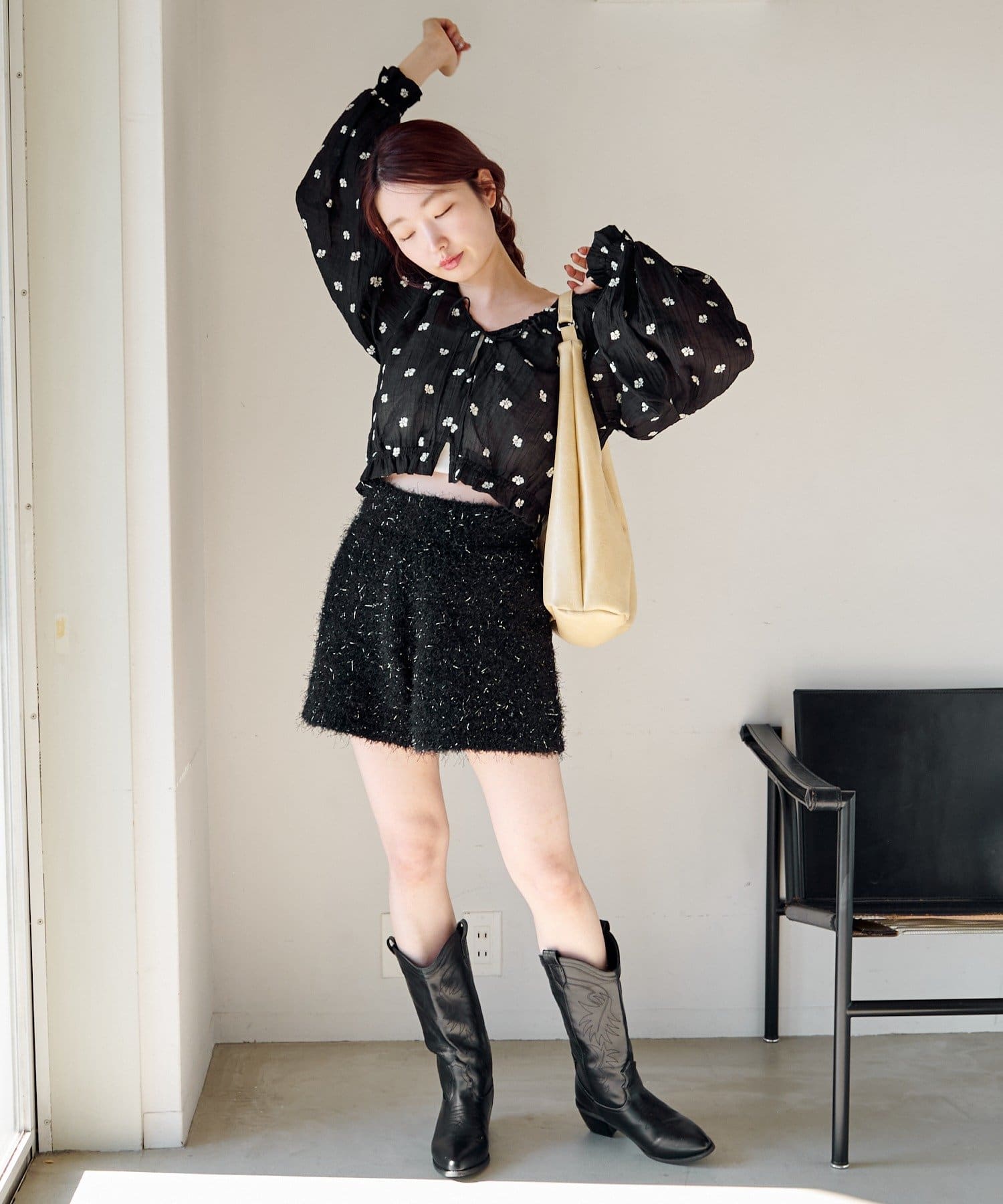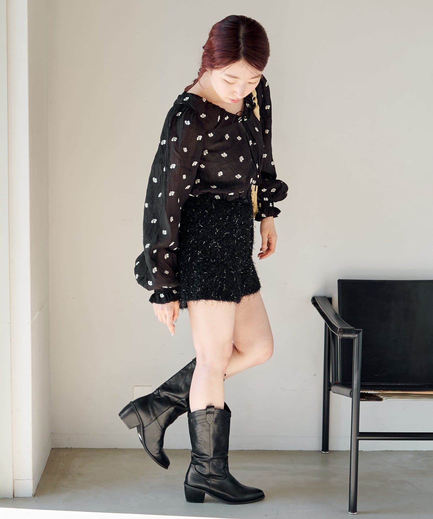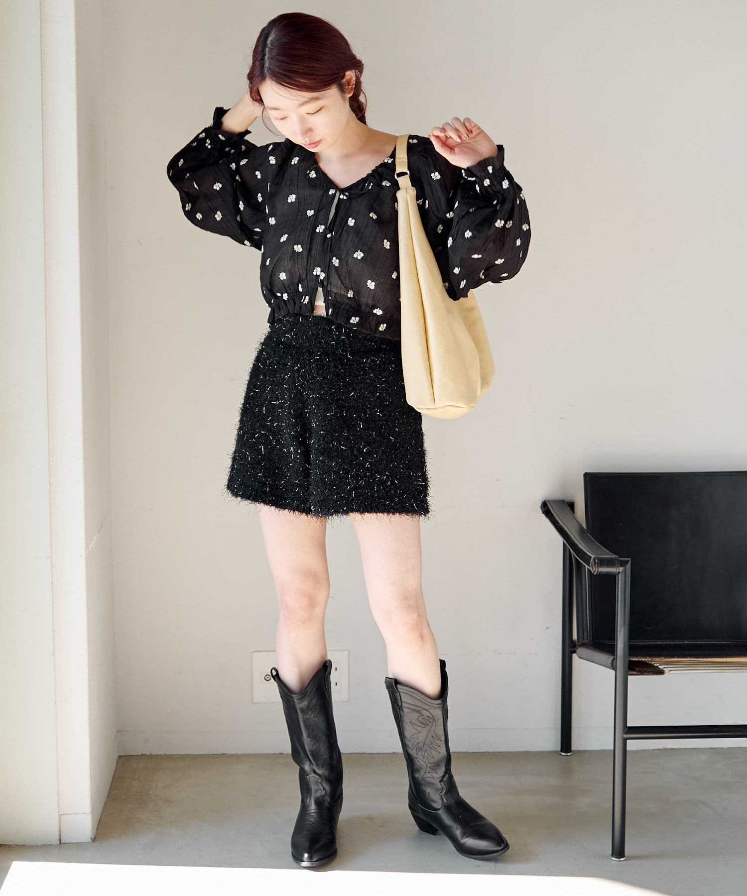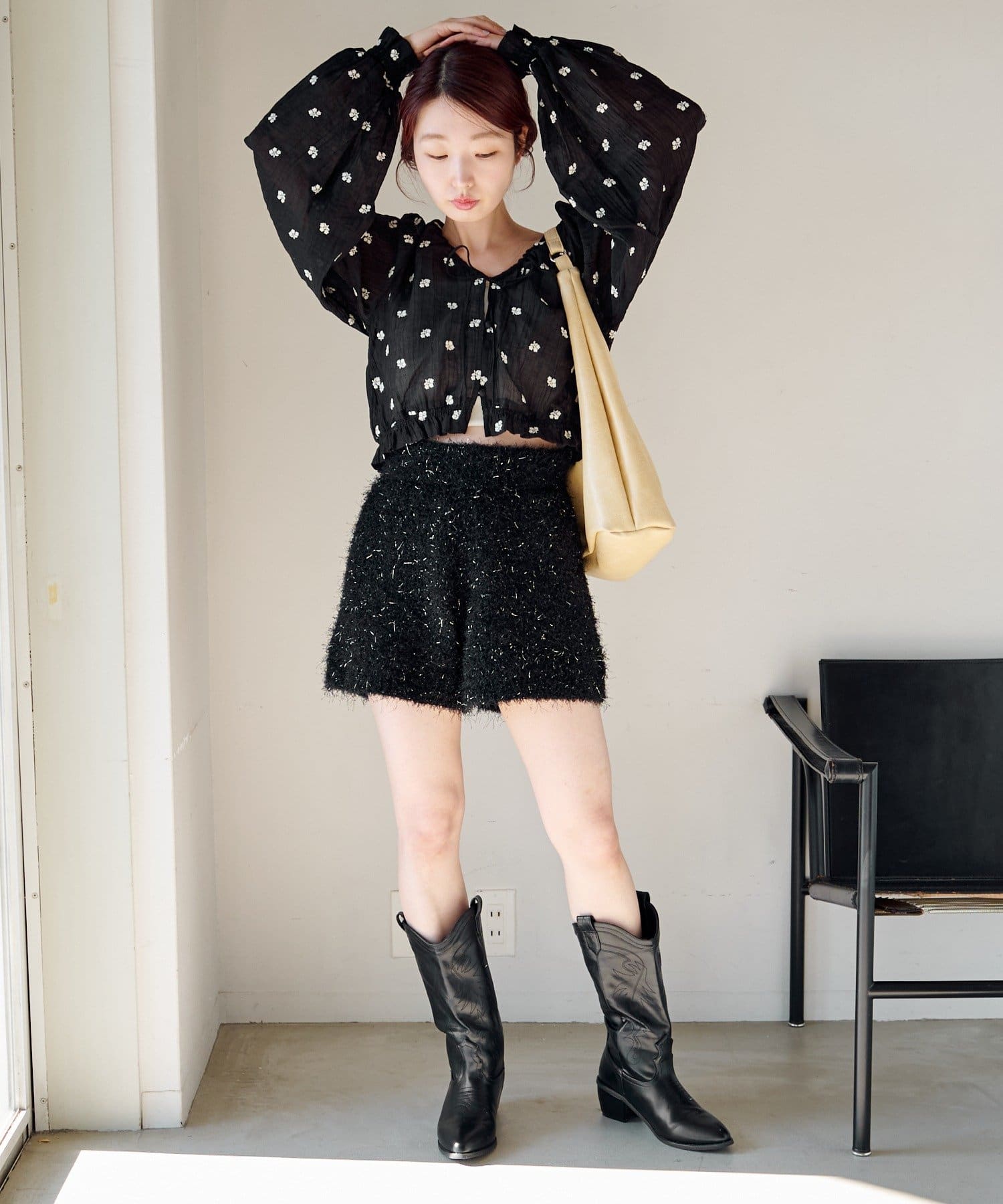 ショートパンツ×ブーツでガーリーに寄せたバランスコーデ。