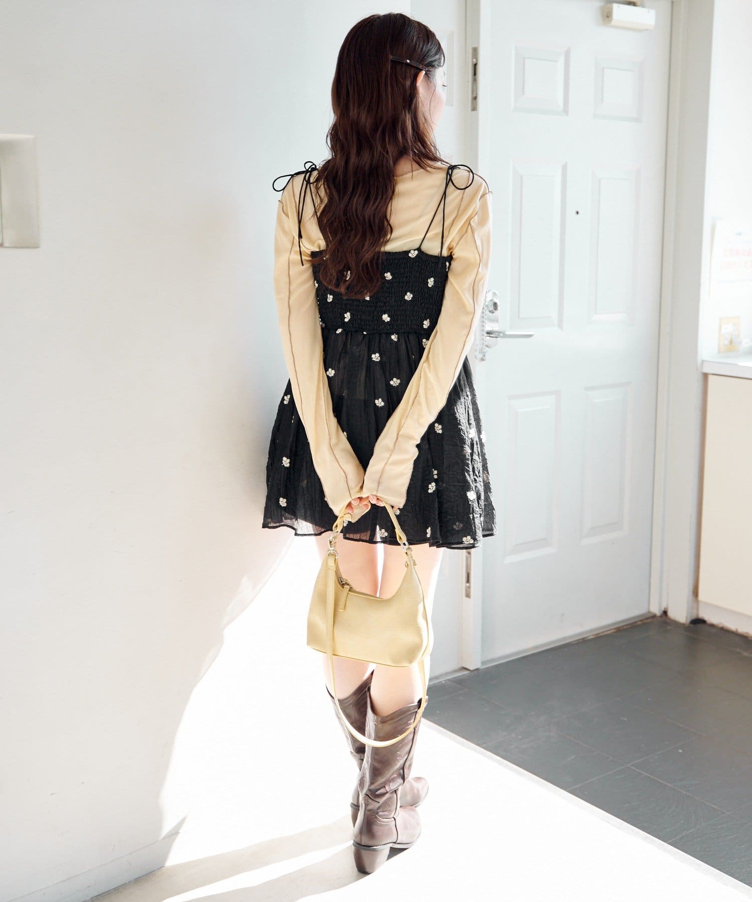 肩の華奢なストラップが抜け感をプラスし、春先の軽やかなコーデにぴったりの一枚です。