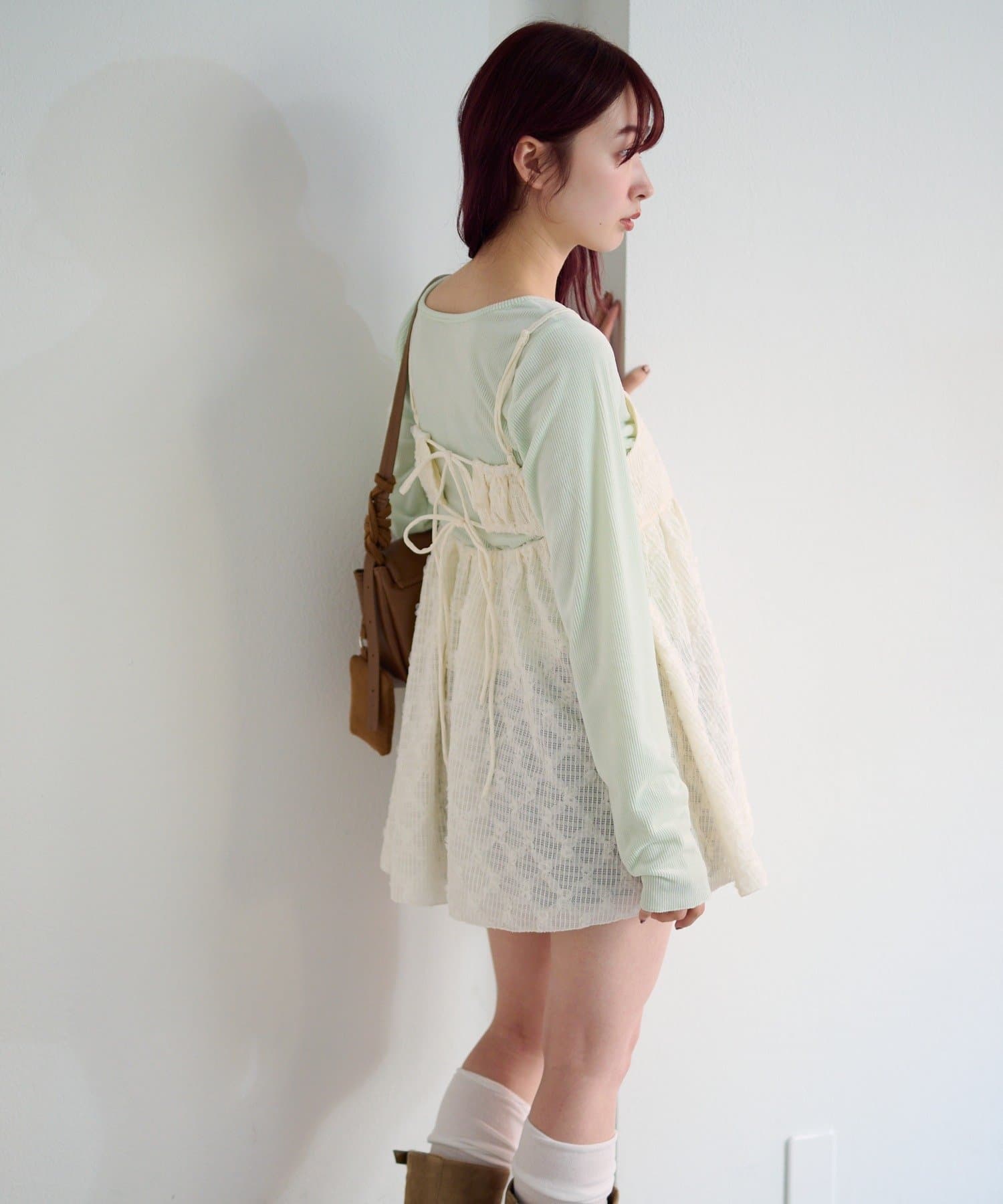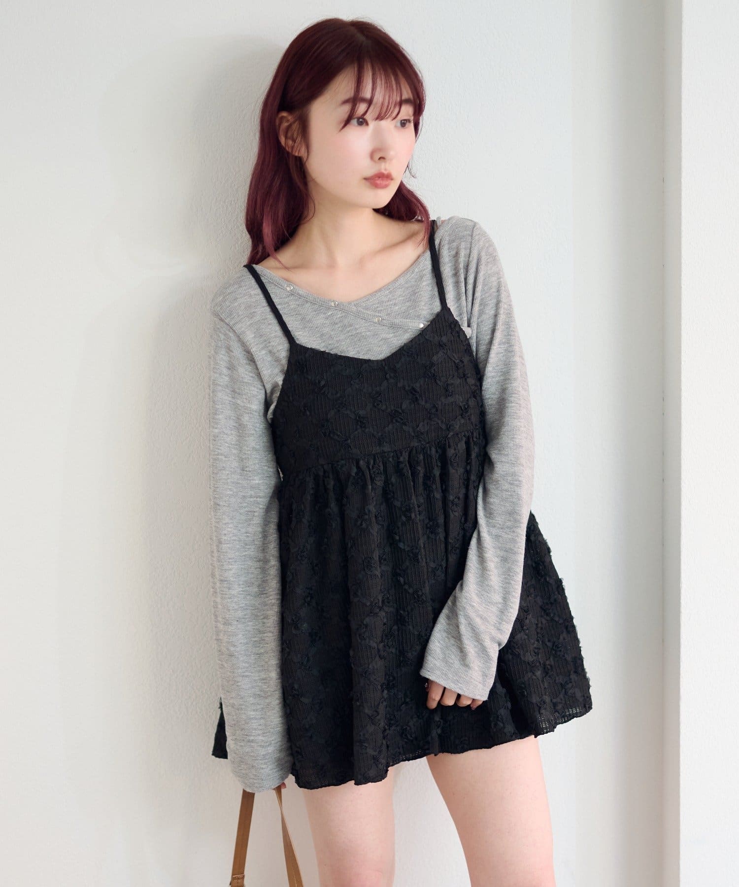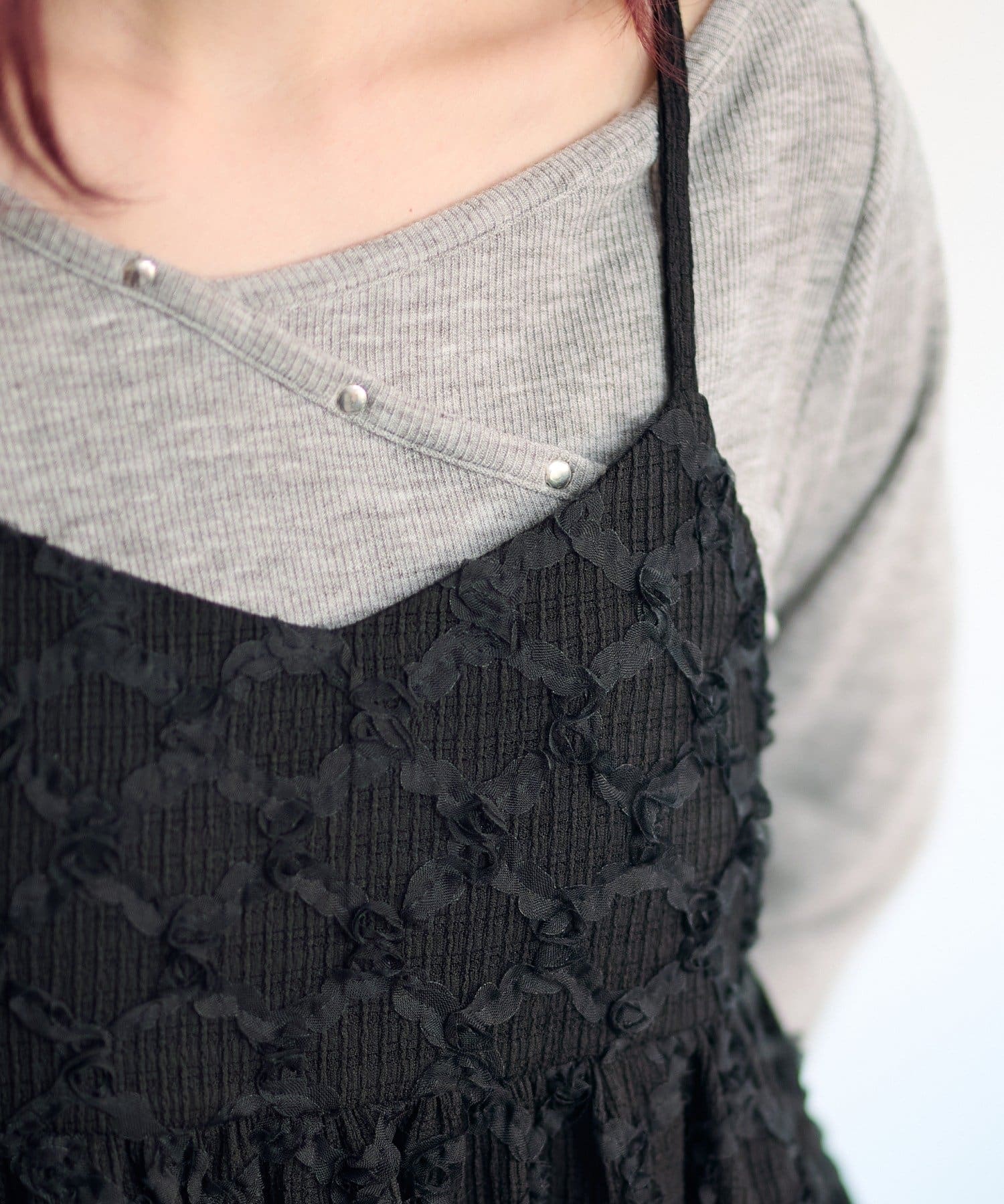 華奢なキャミストラップとやや短めの丈感が、甘くなりすぎず、レイヤードにも最適。