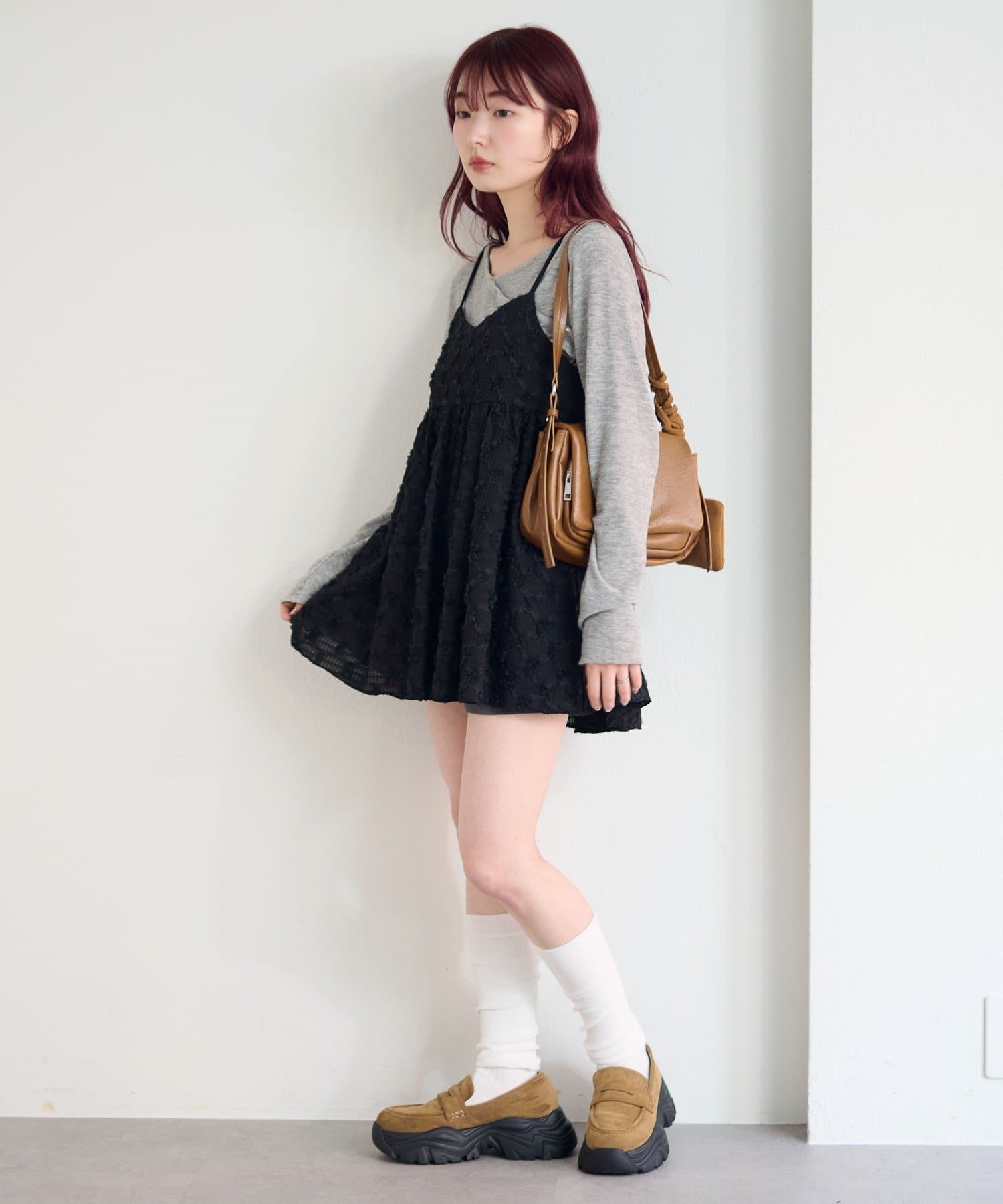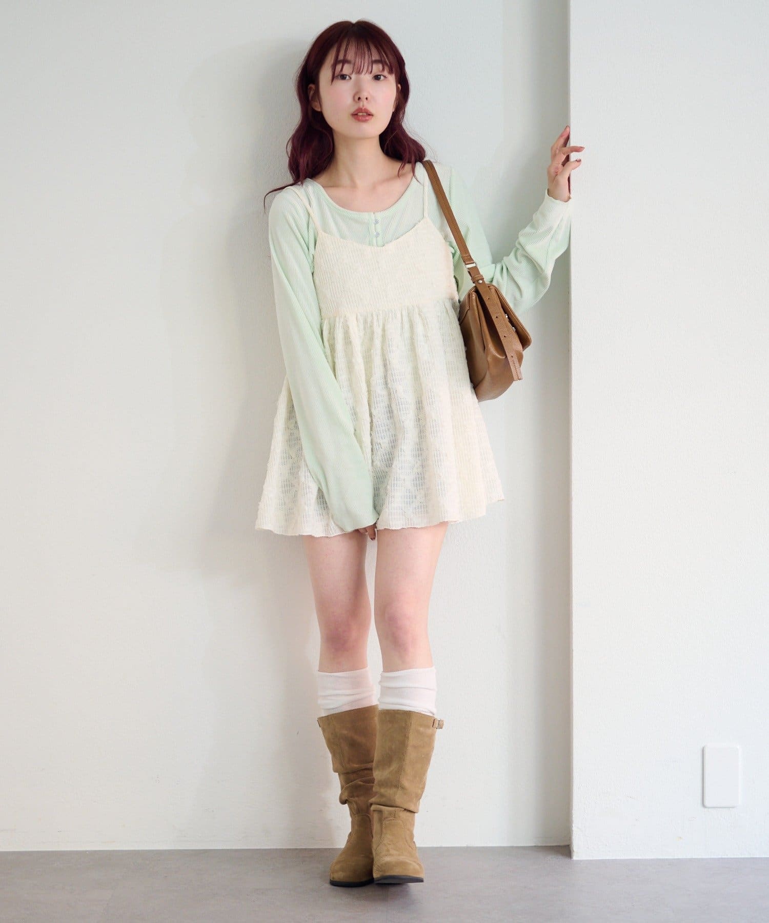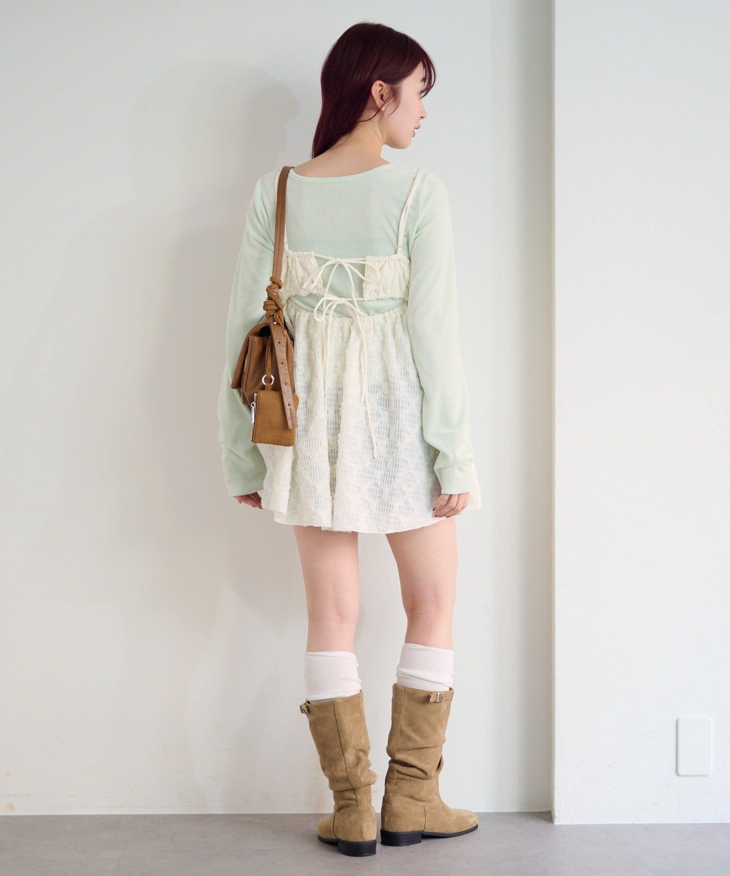 華奢なキャミストラップとやや短めの丈感が、甘くなりすぎず、レイヤードにも最適。