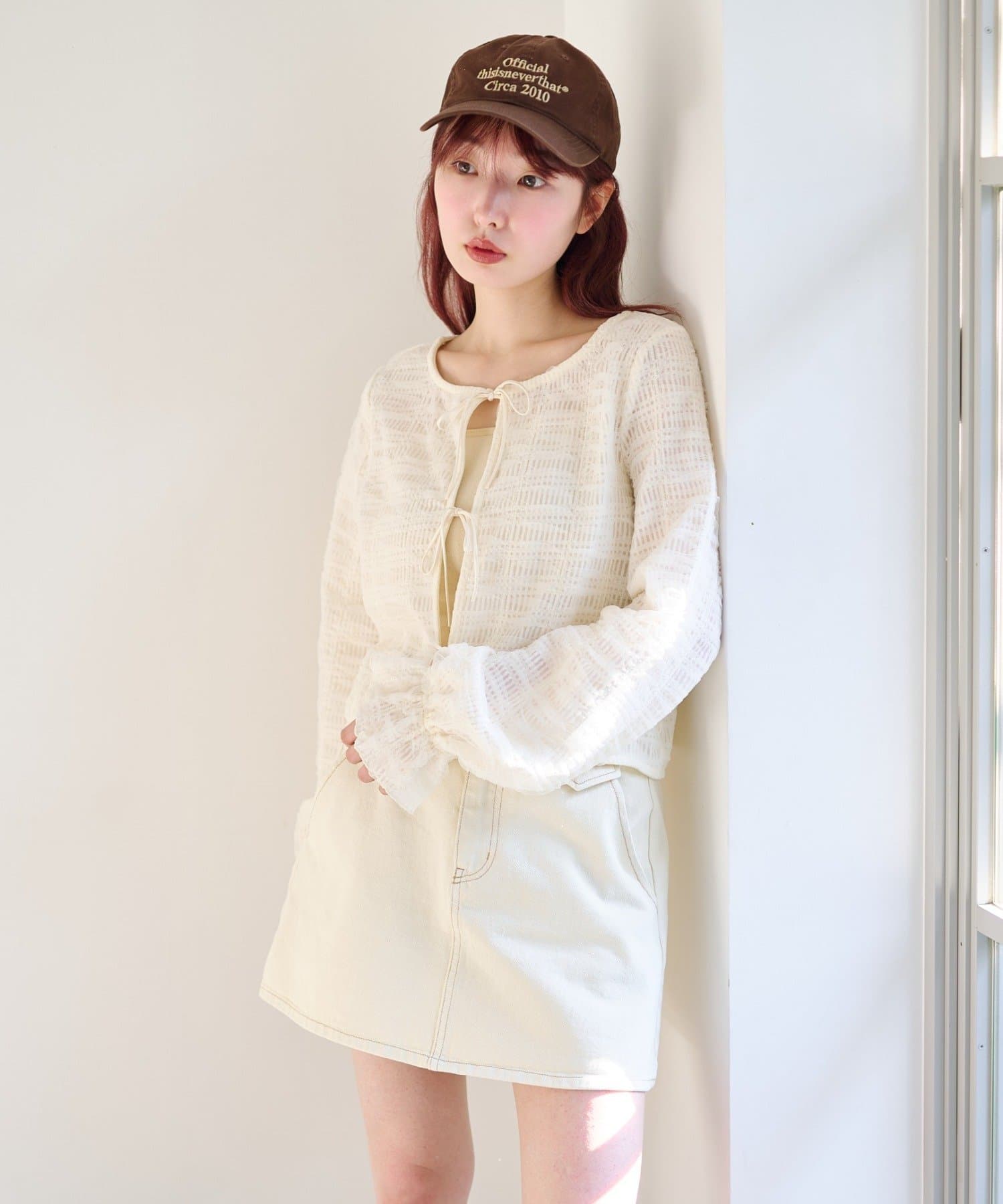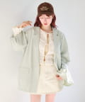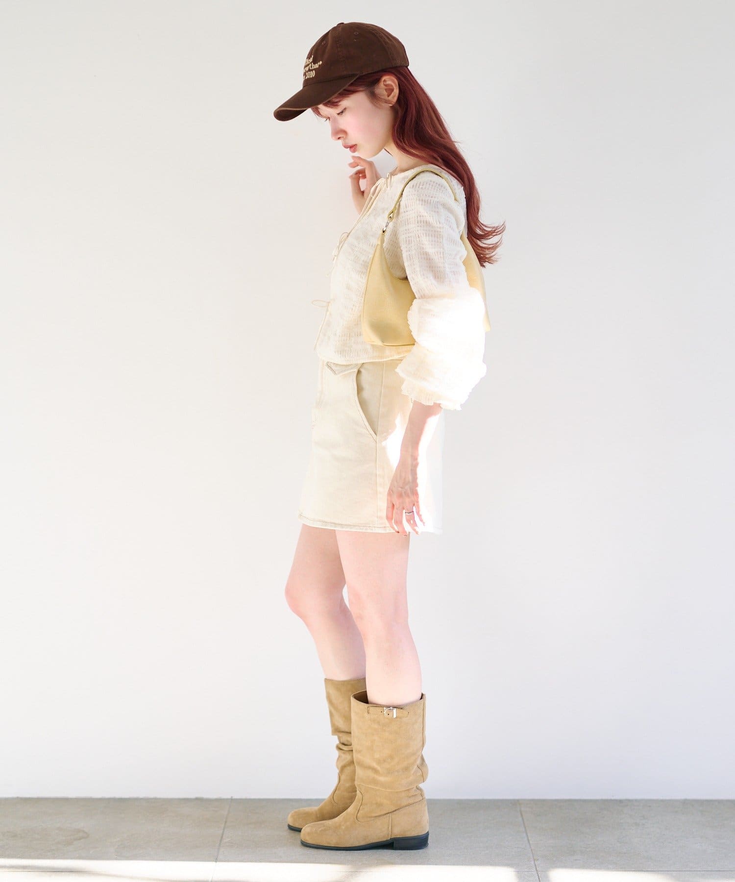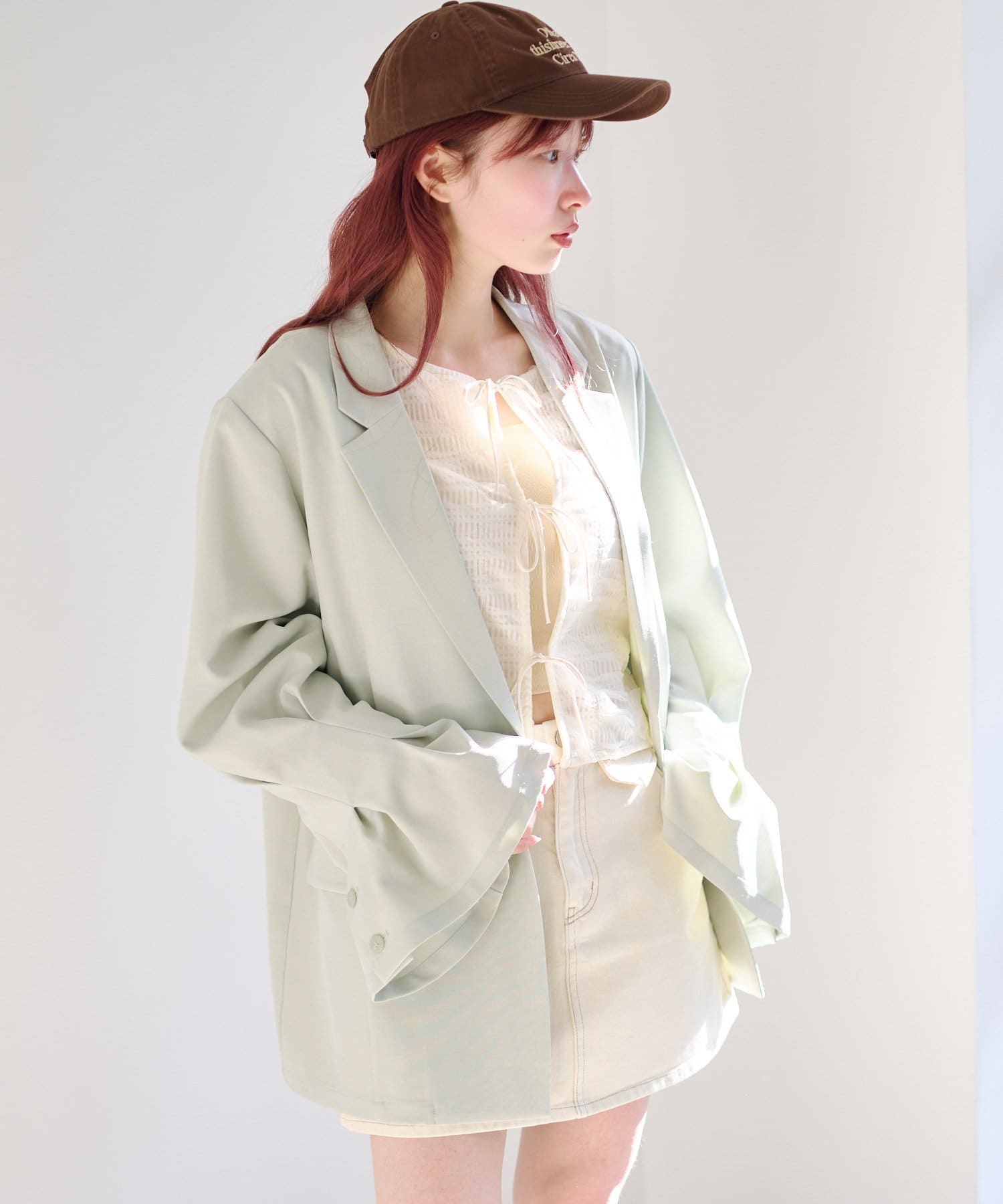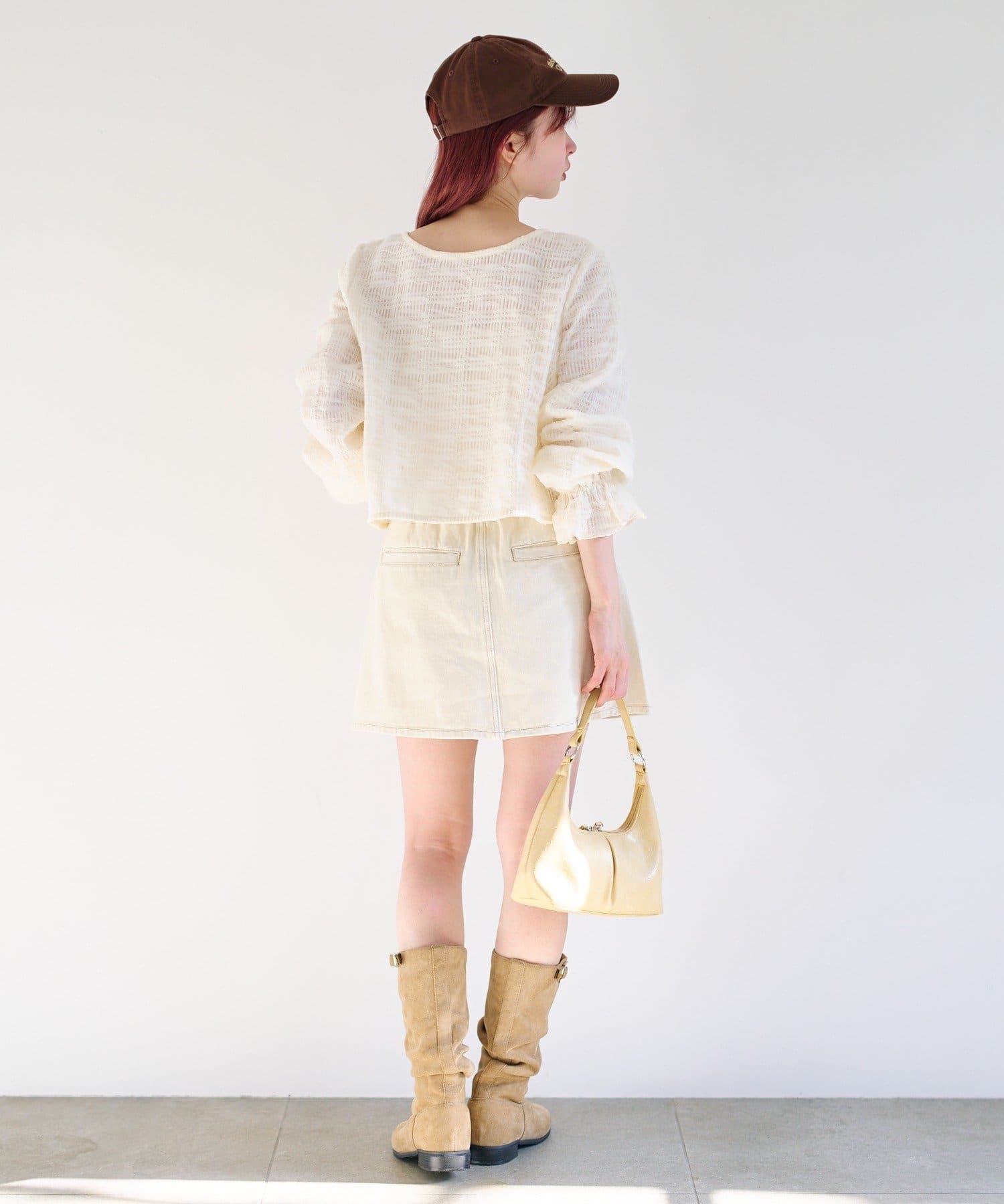 ミニスカートと合わせて甘さのある旬コーデに。