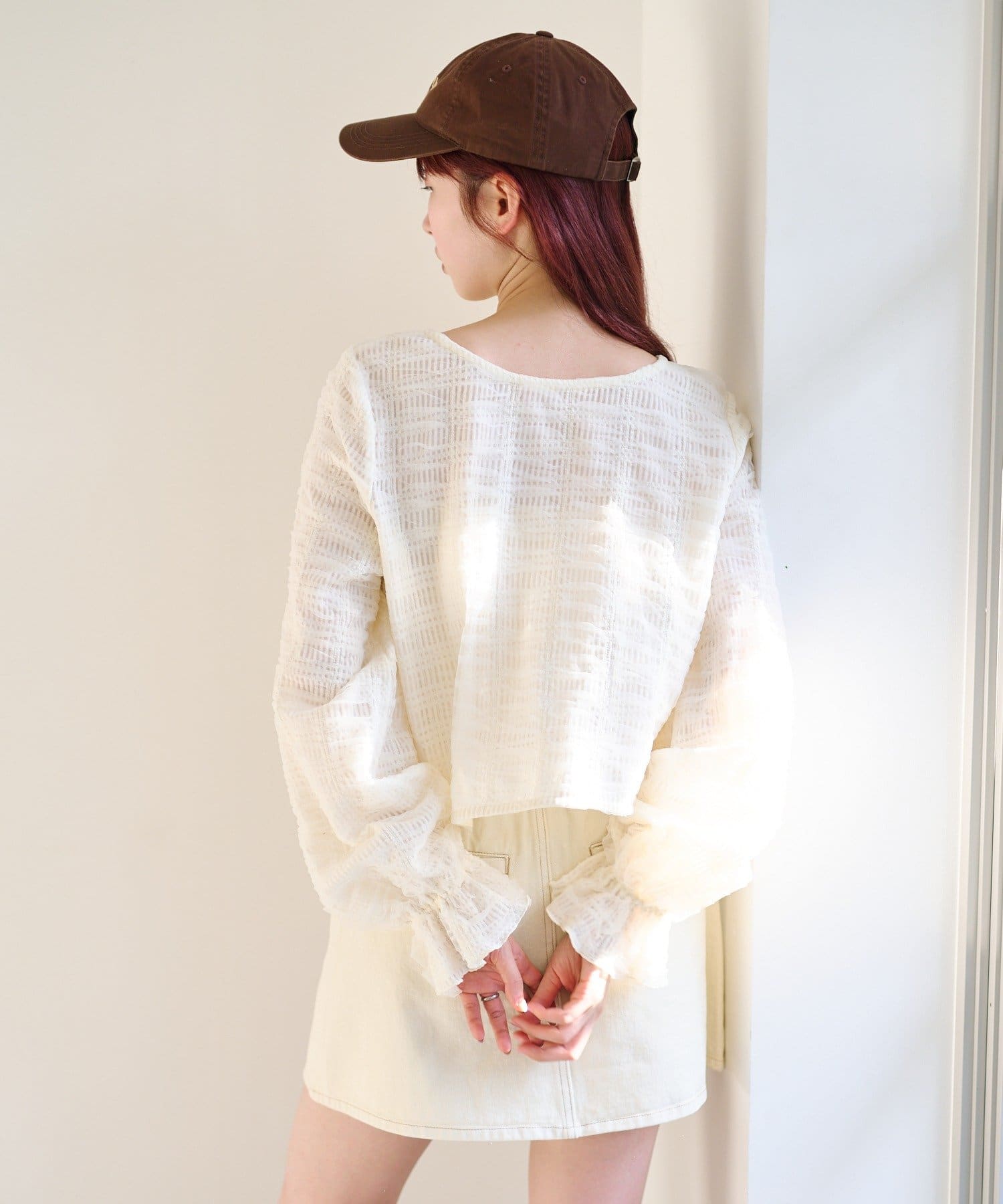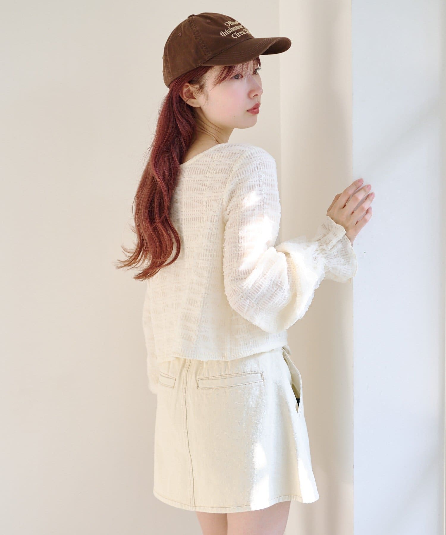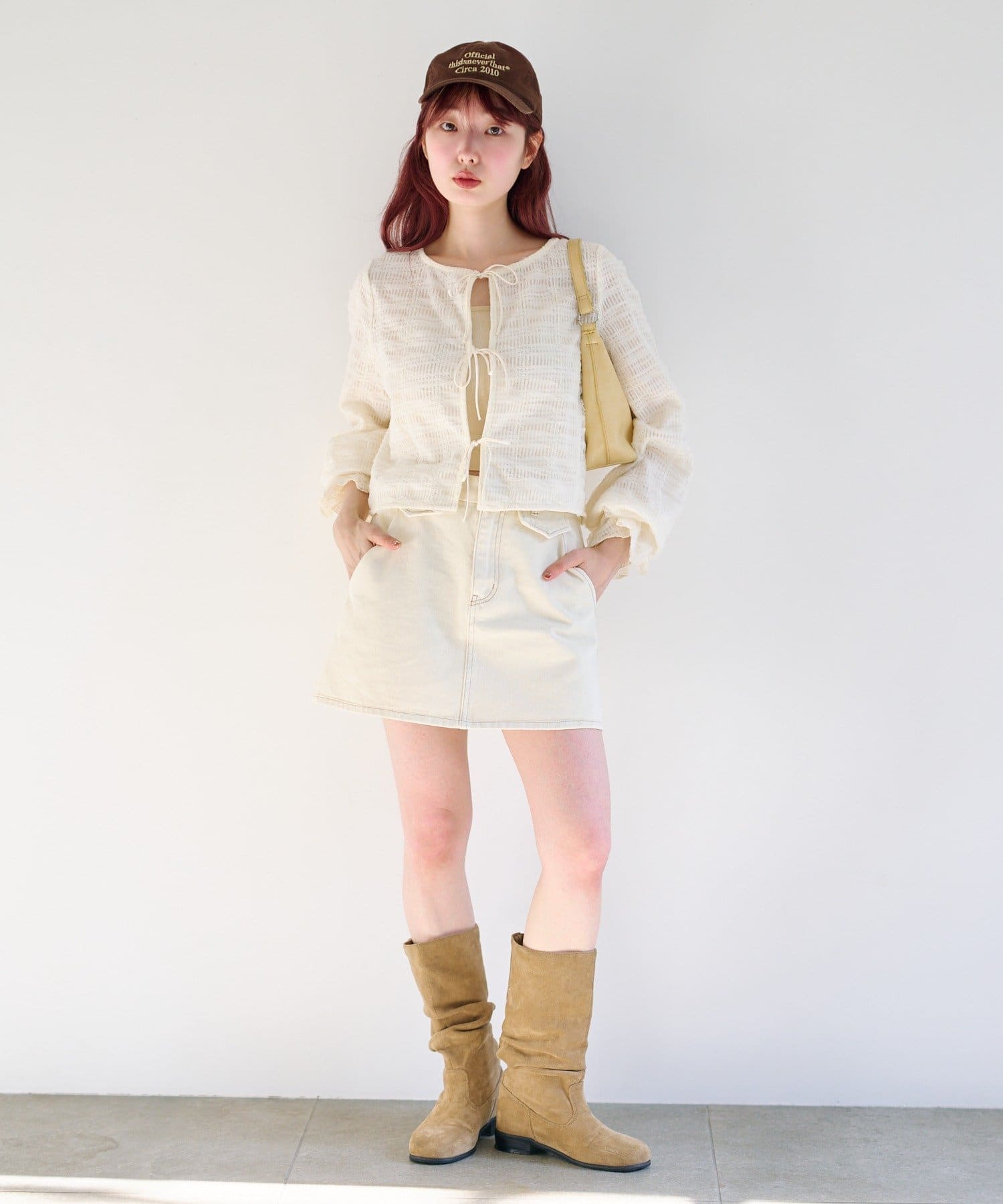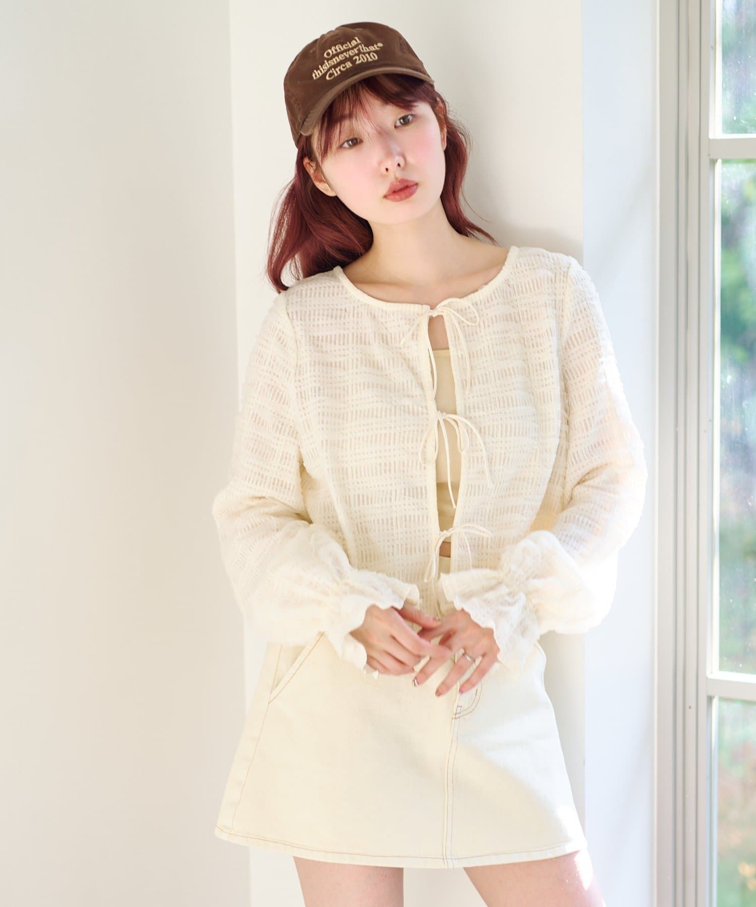 ミニスカートと合わせて甘さのある旬コーデに。