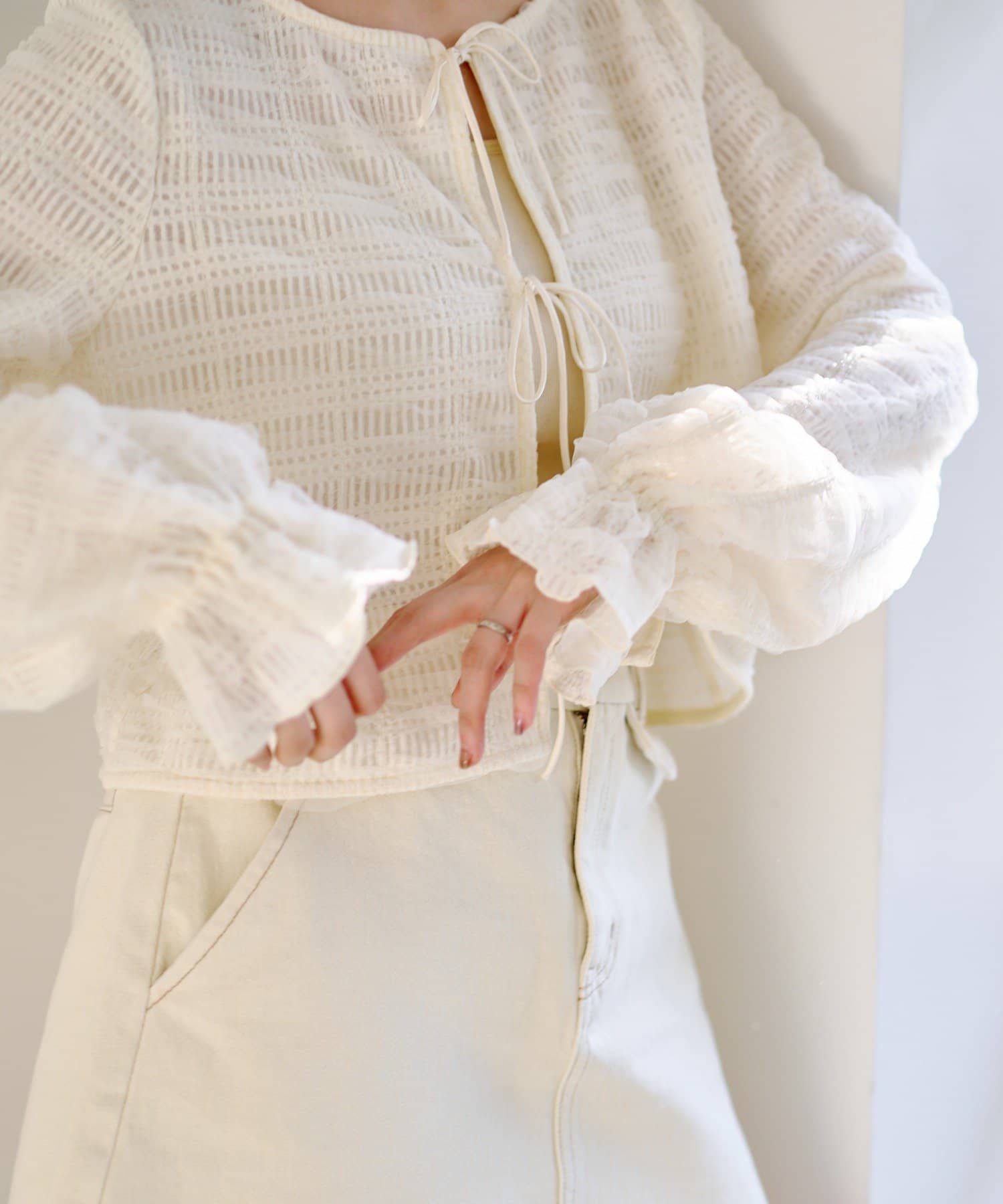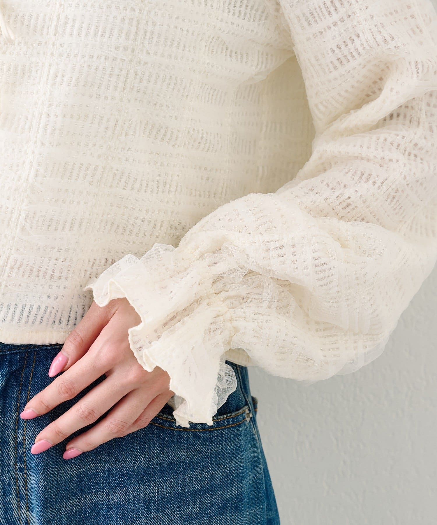 繊細なチュールが揺れるフェミニンなブラウスで女性らしさを演出します。
