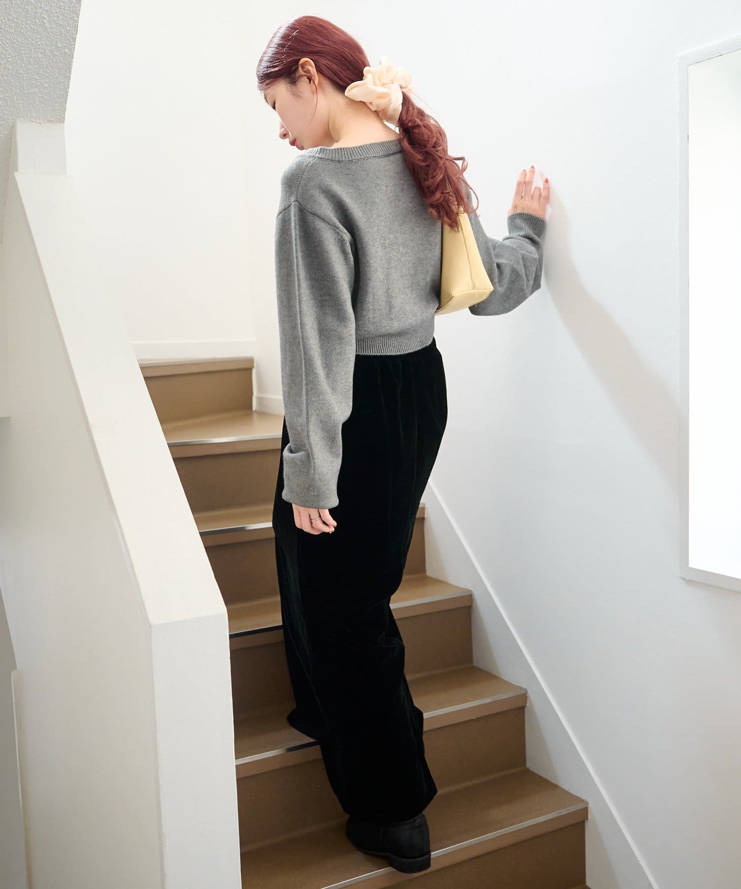 ハイウエストのスラックスやデニムと合わせて、甘さ控えめな大人カジュアルに。