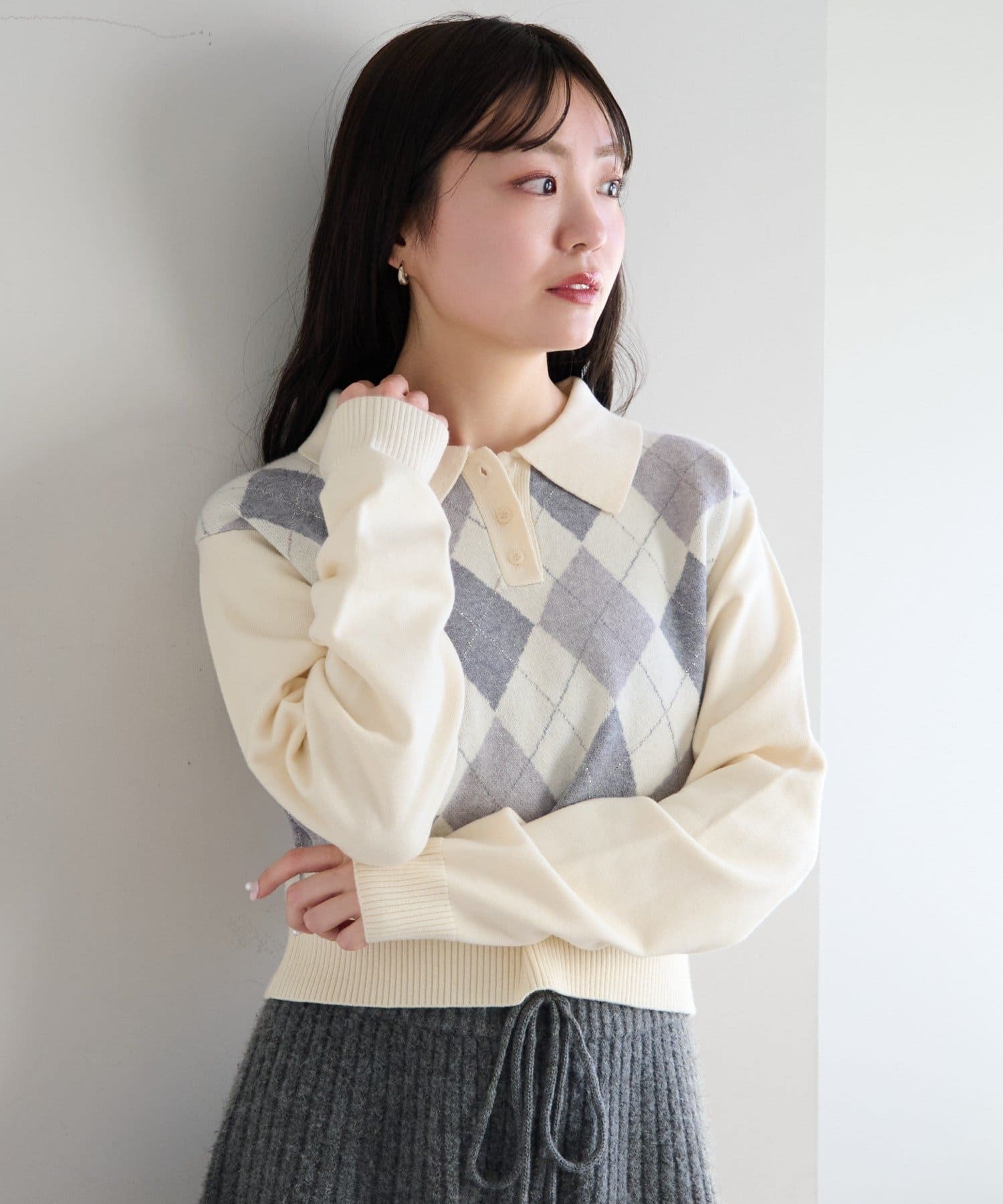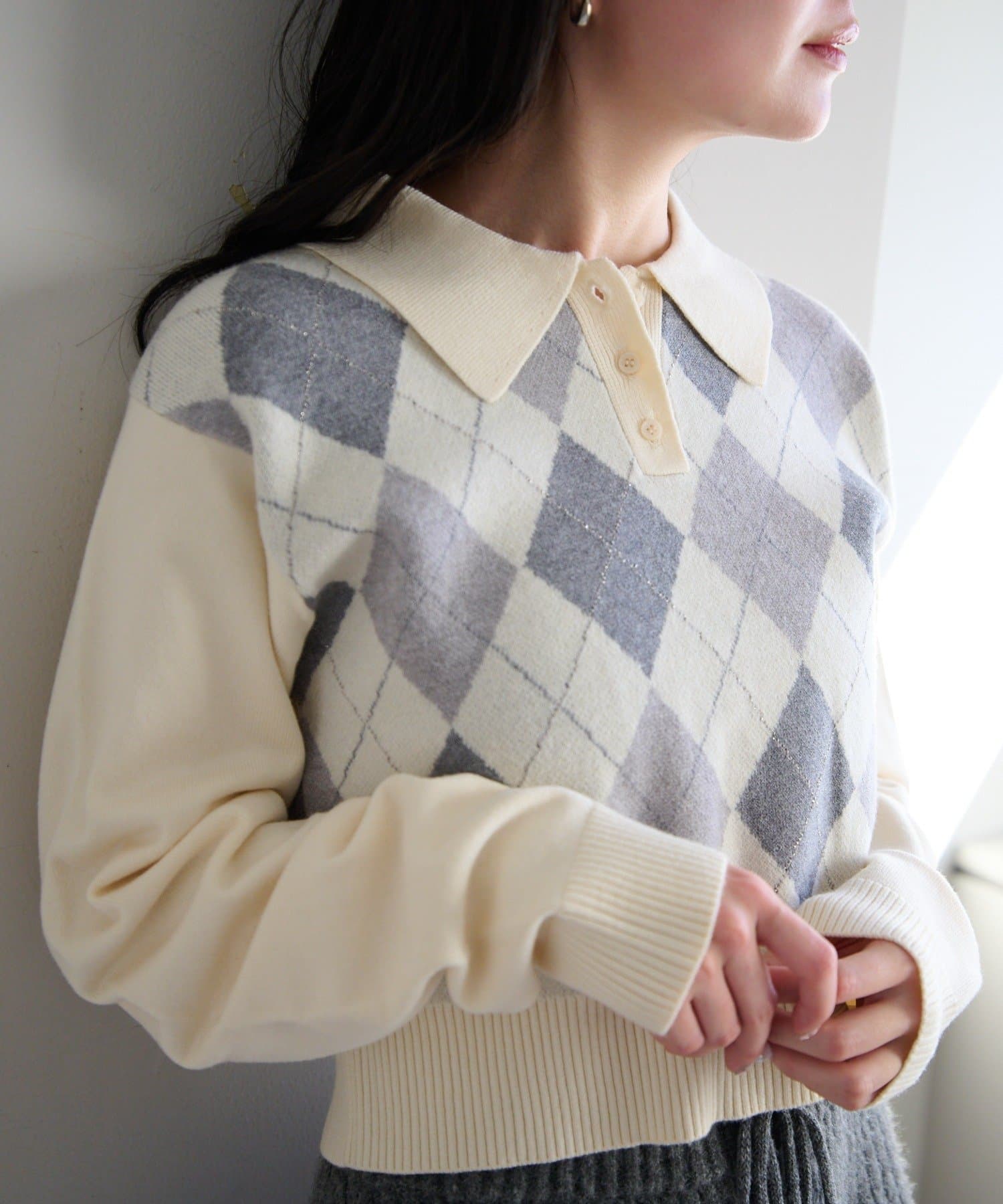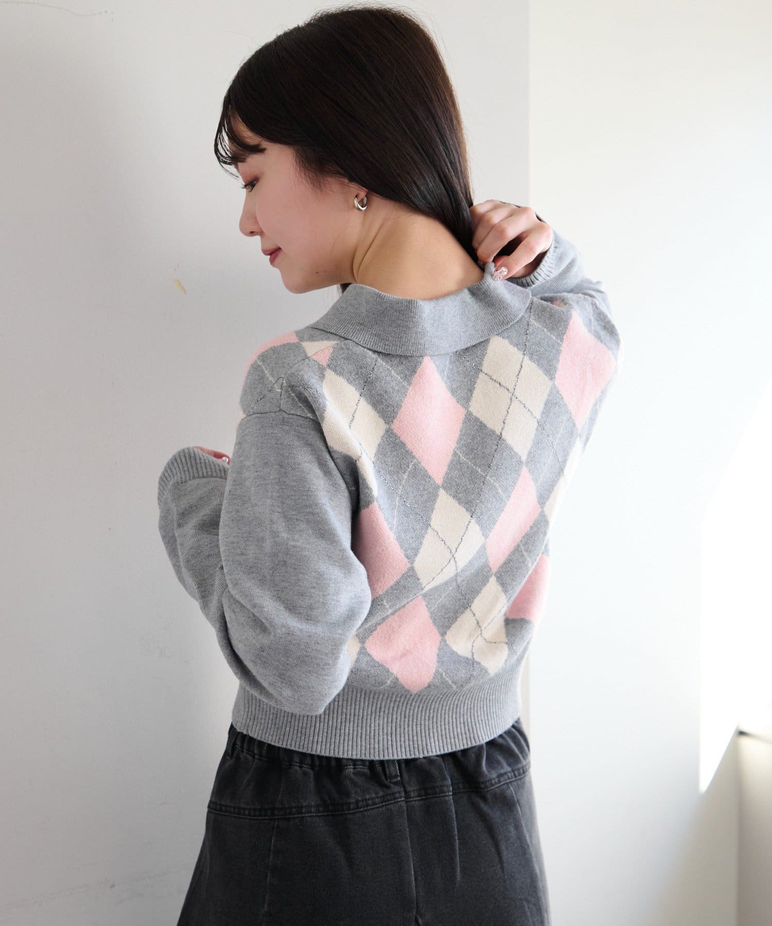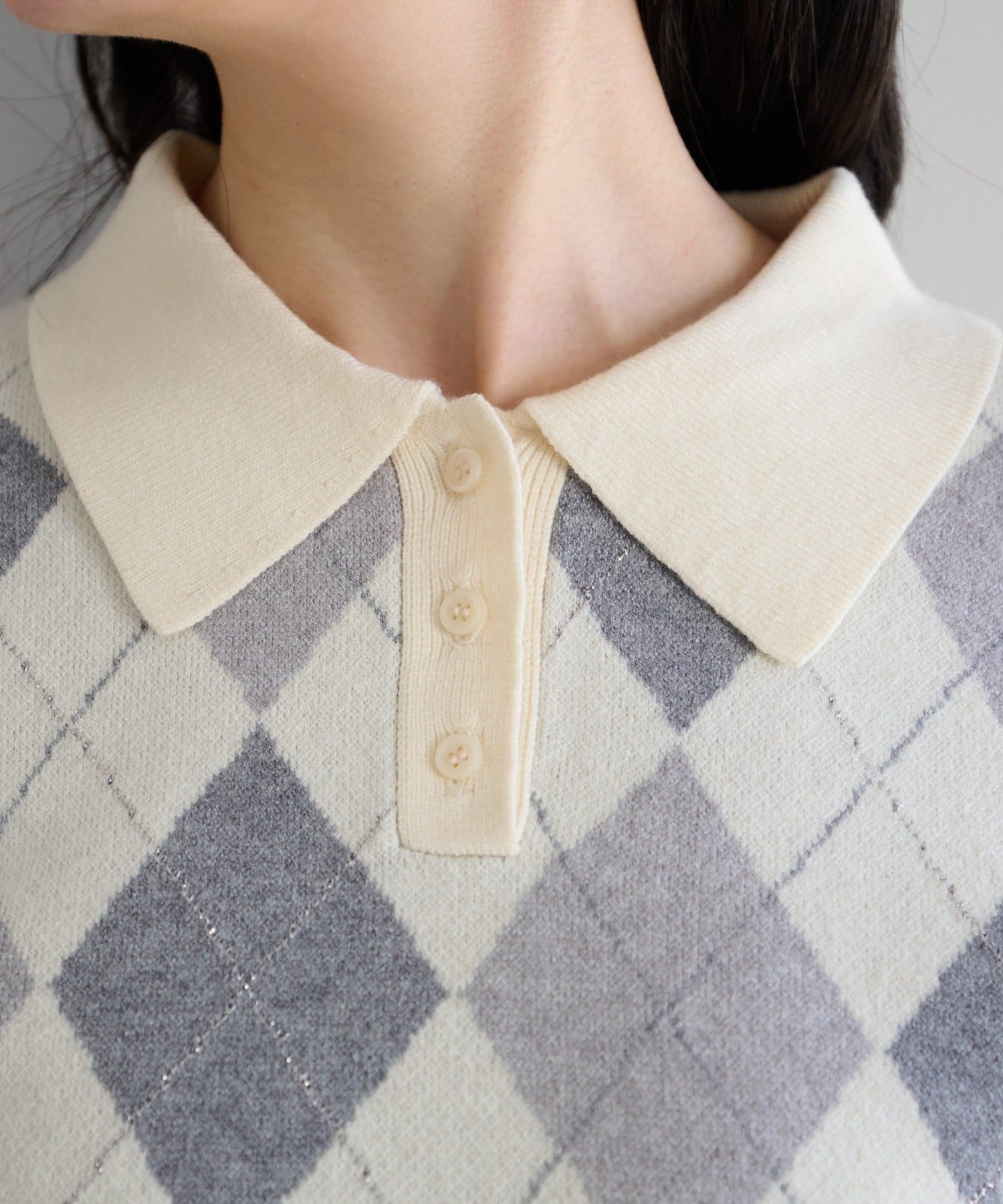 クラシカルなアーガイル柄が目を惹く、ポロデザインのニットトップス。