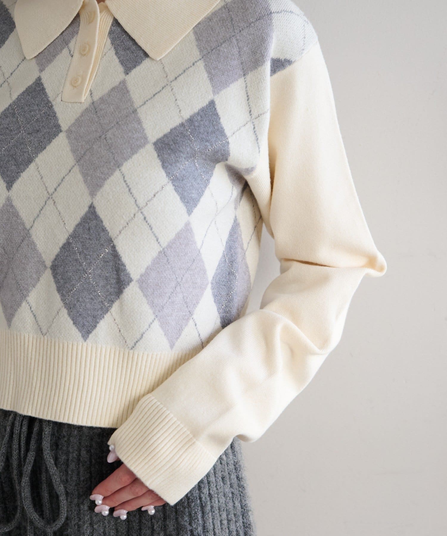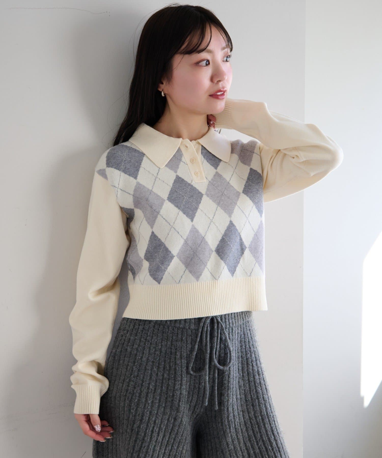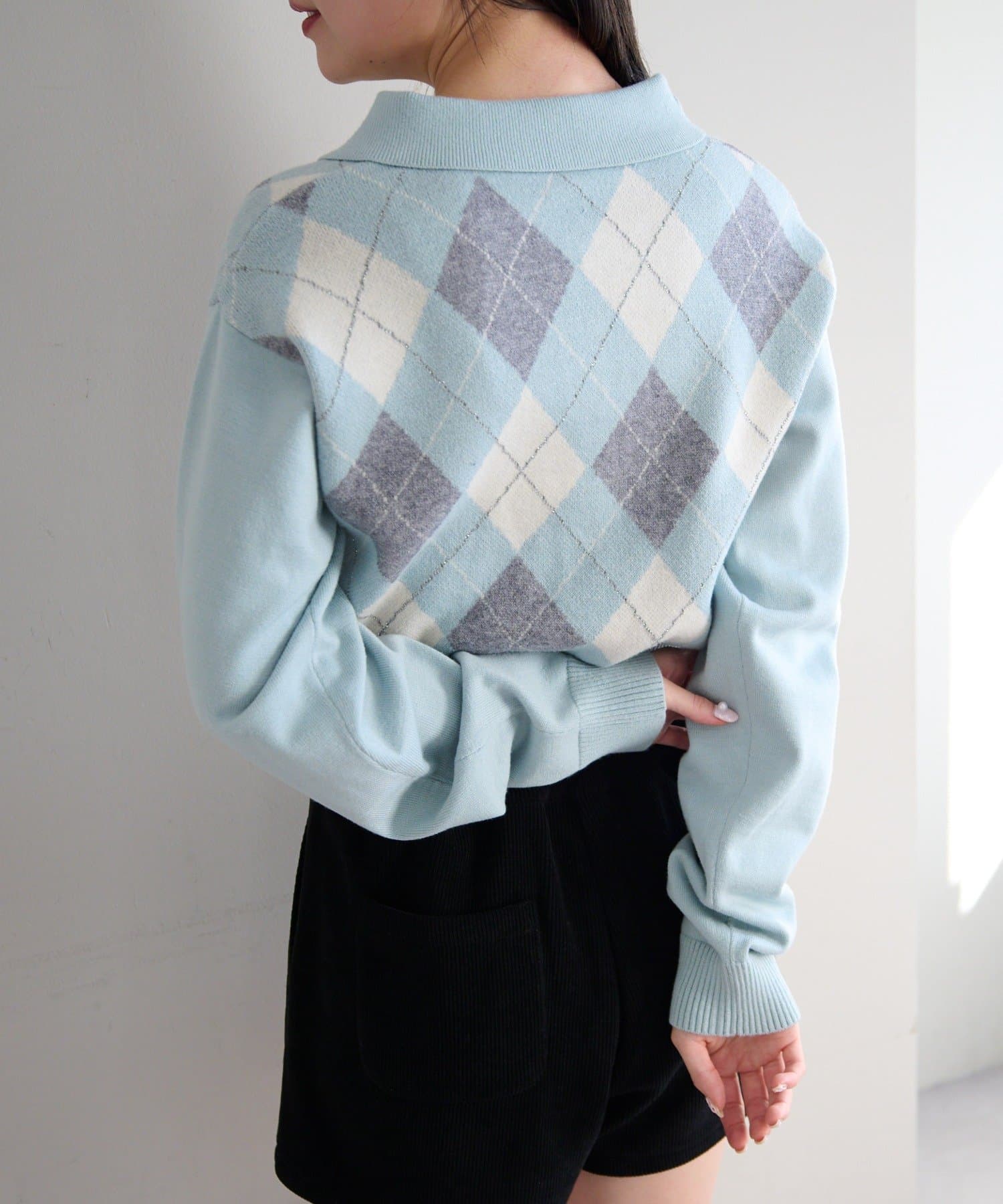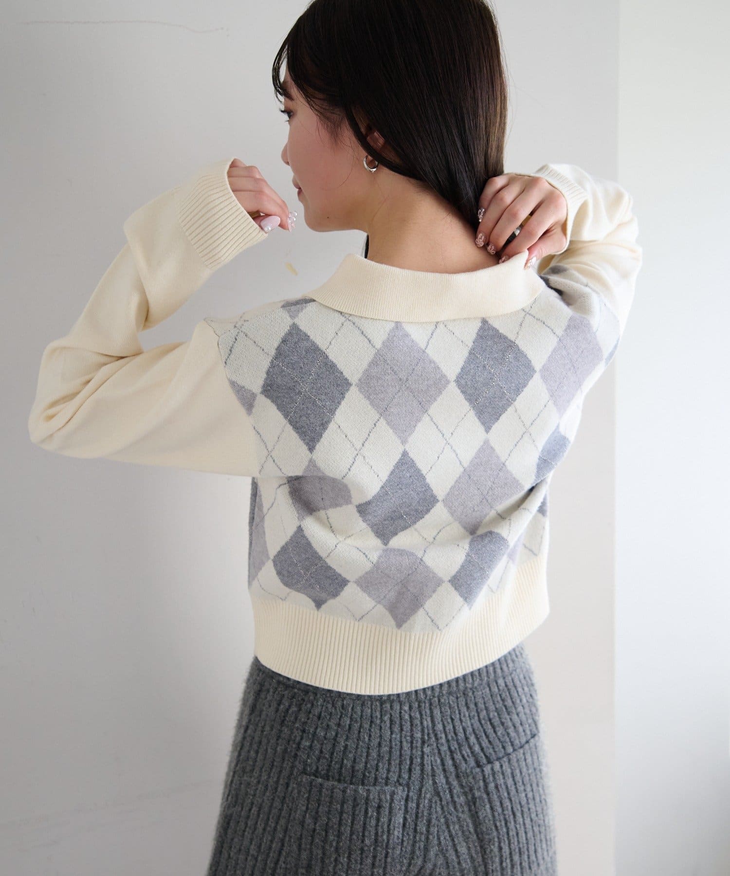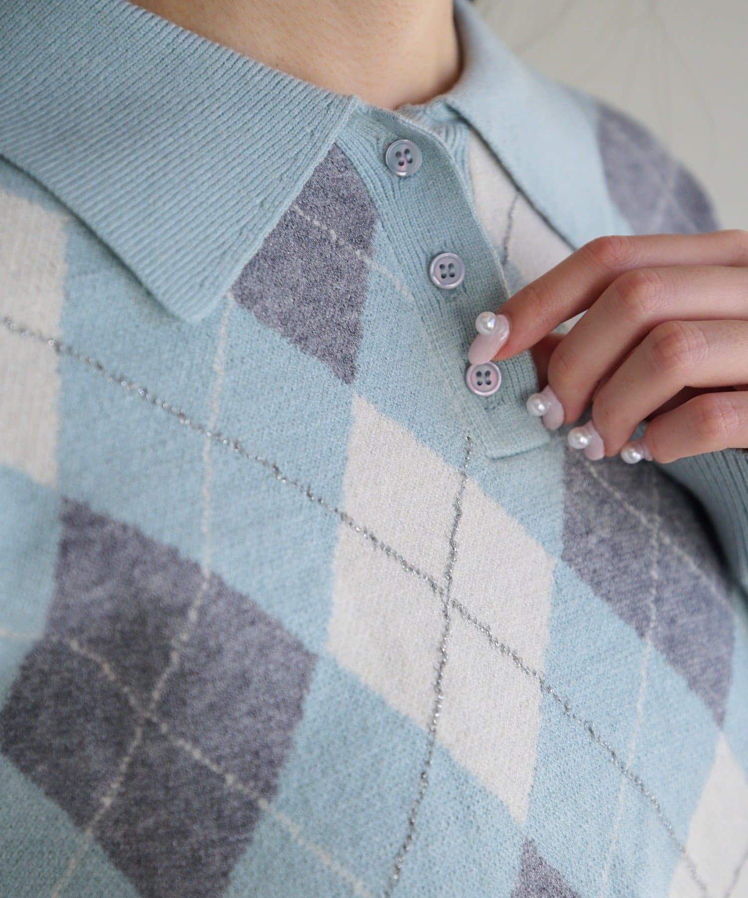クラシカルなアーガイル柄が目を惹く、ポロデザインのニットトップス。