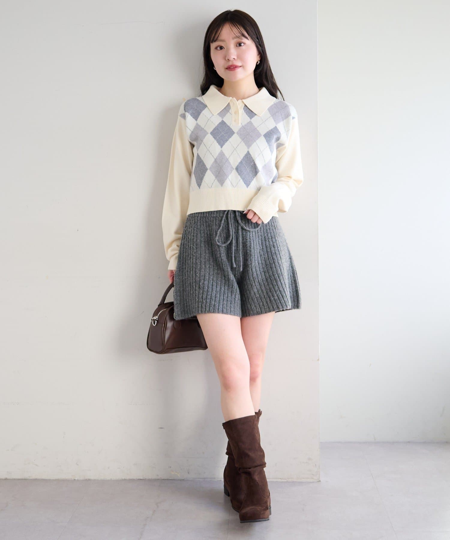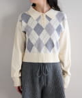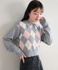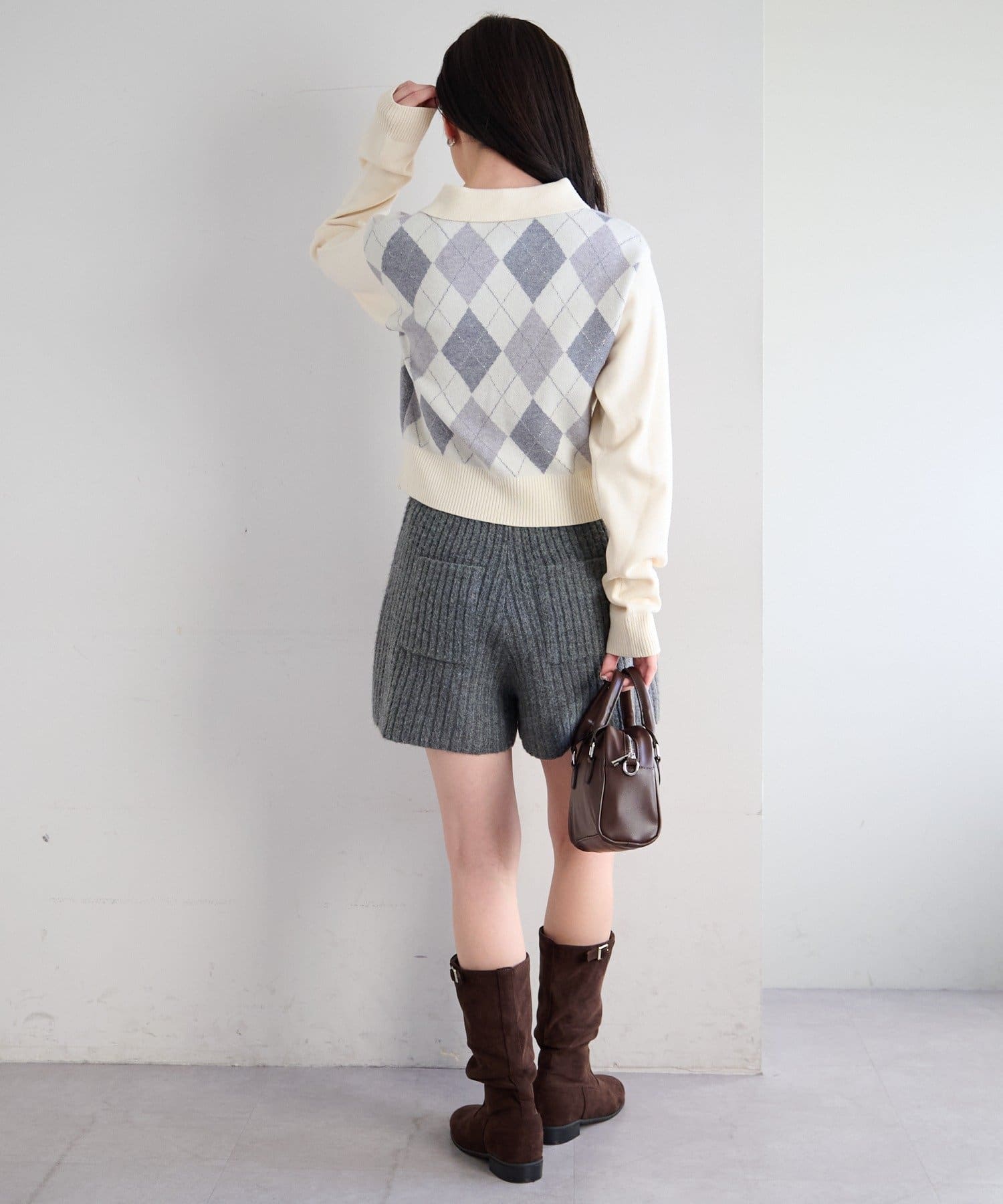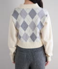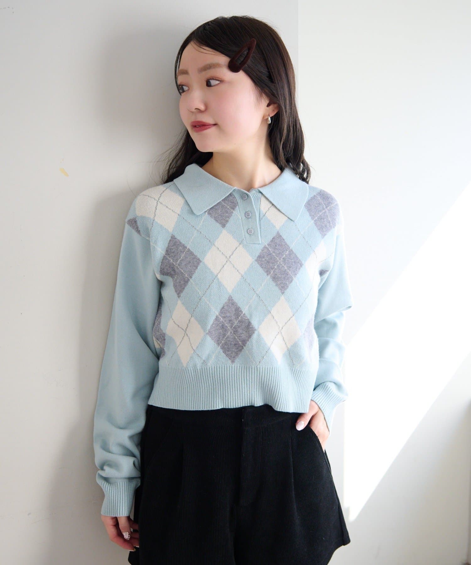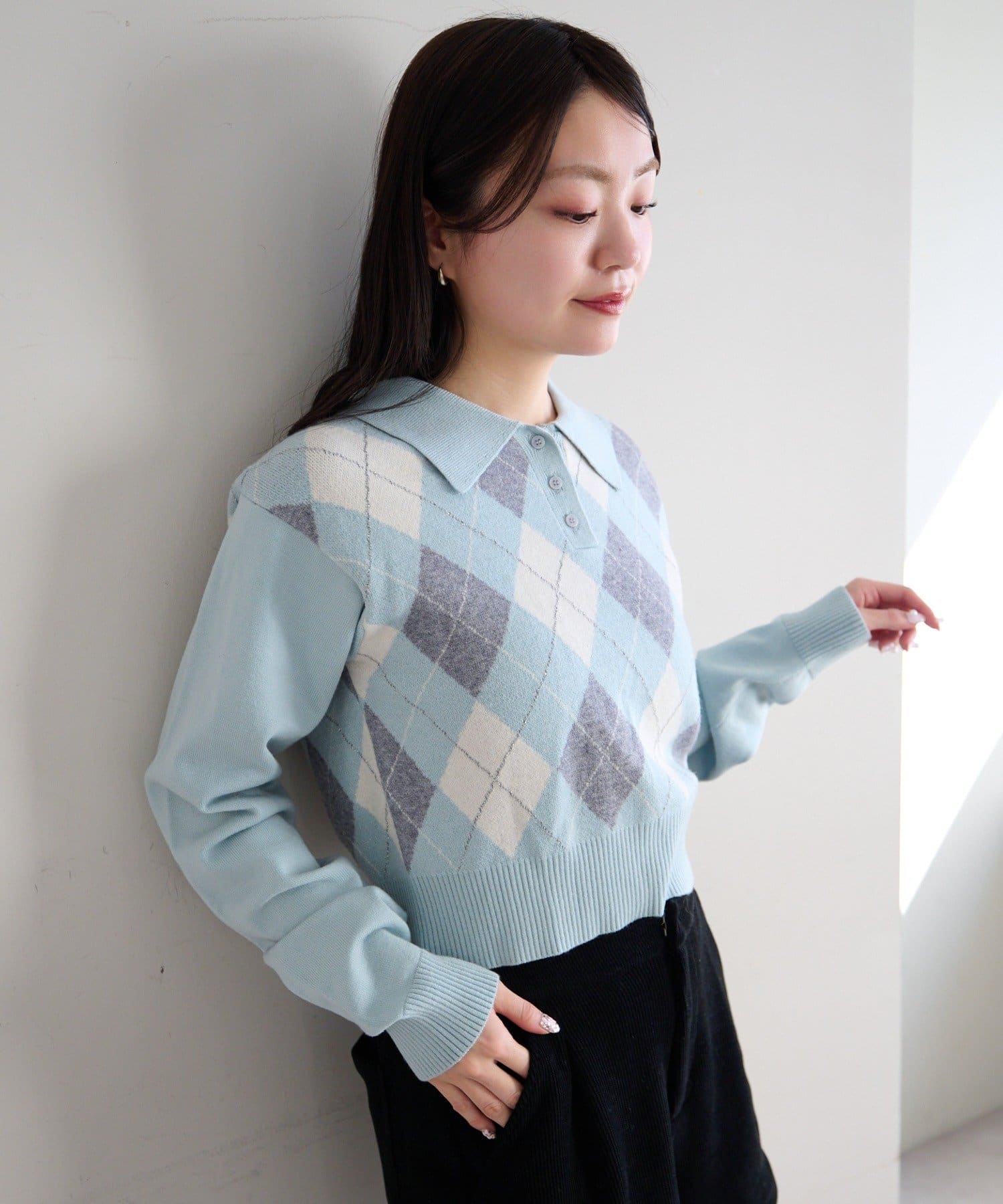 クラシカルなアーガイル柄が目を惹く、ポロデザインのニットトップス。