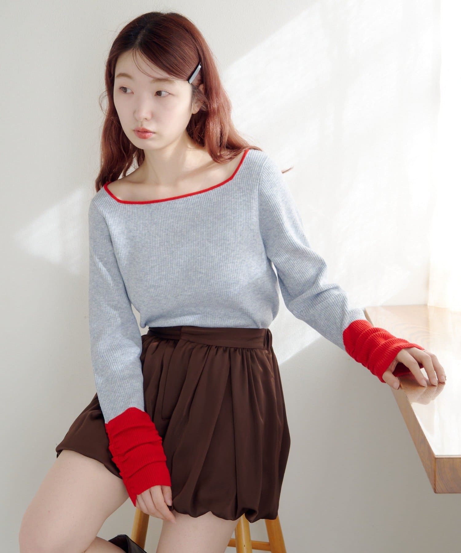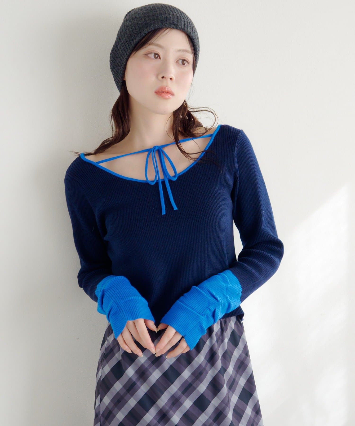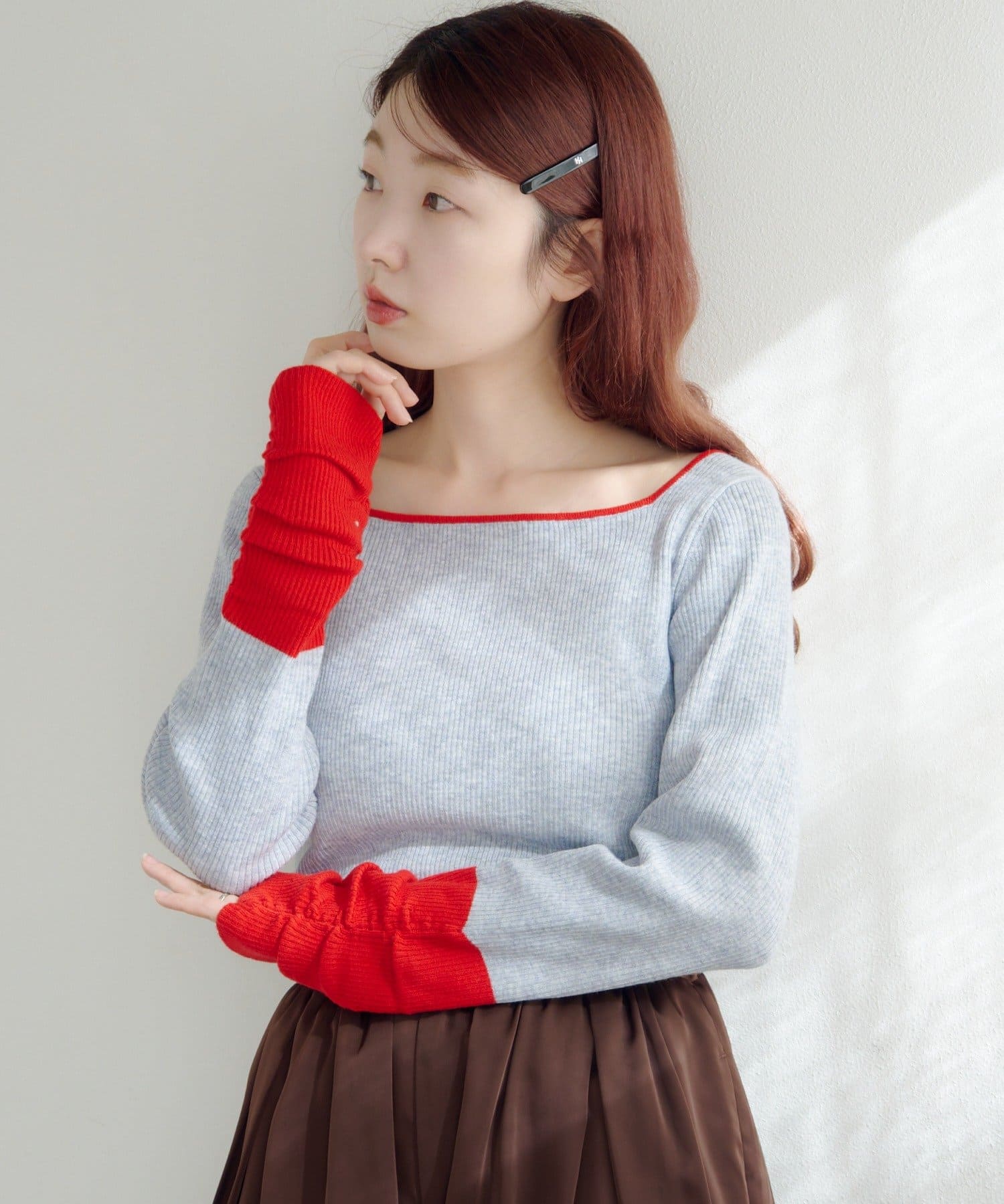 配色デザインが目を惹くバイカラースクエアニット。