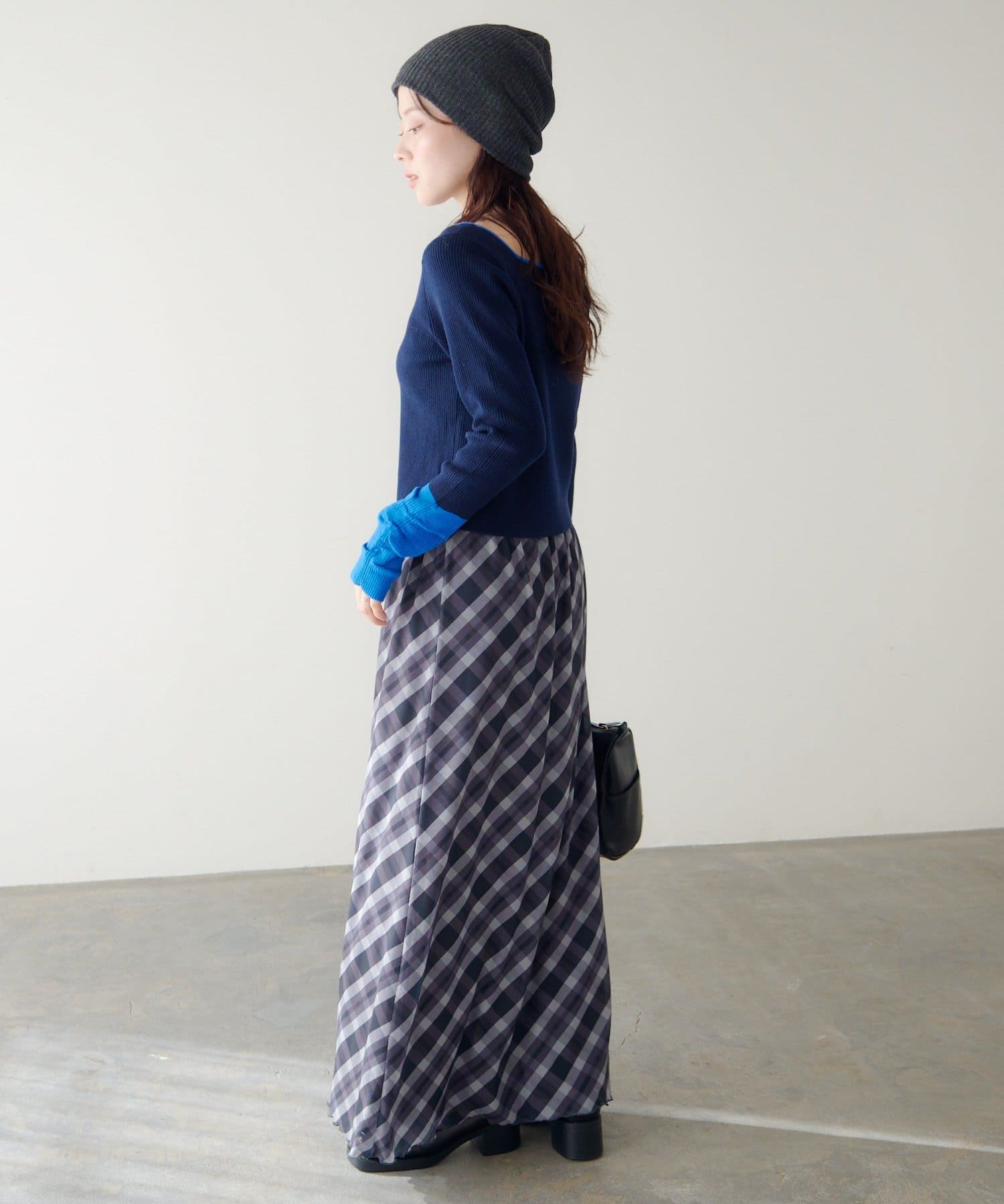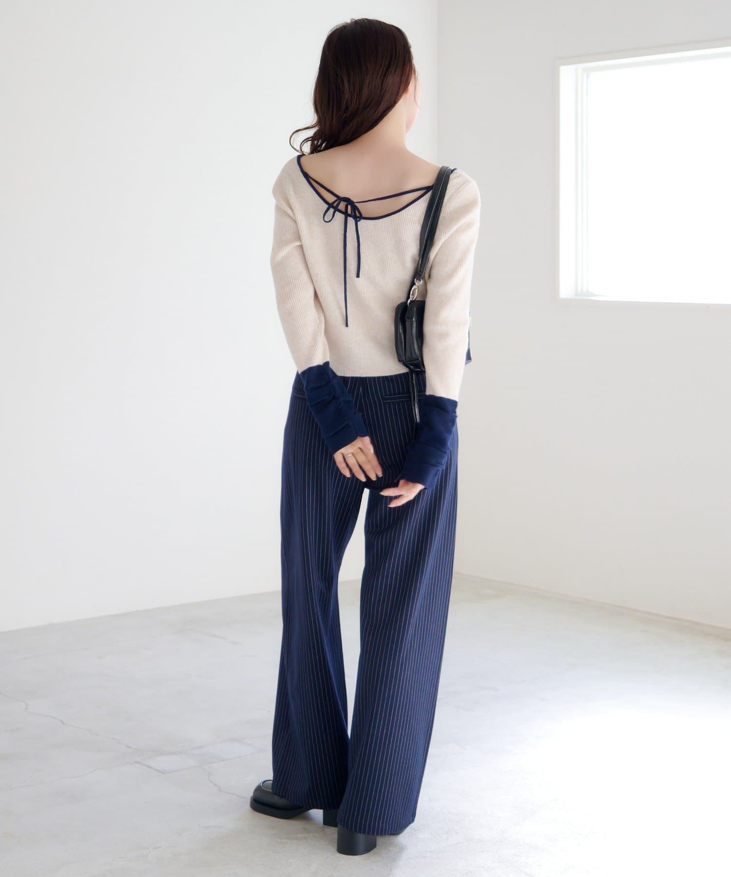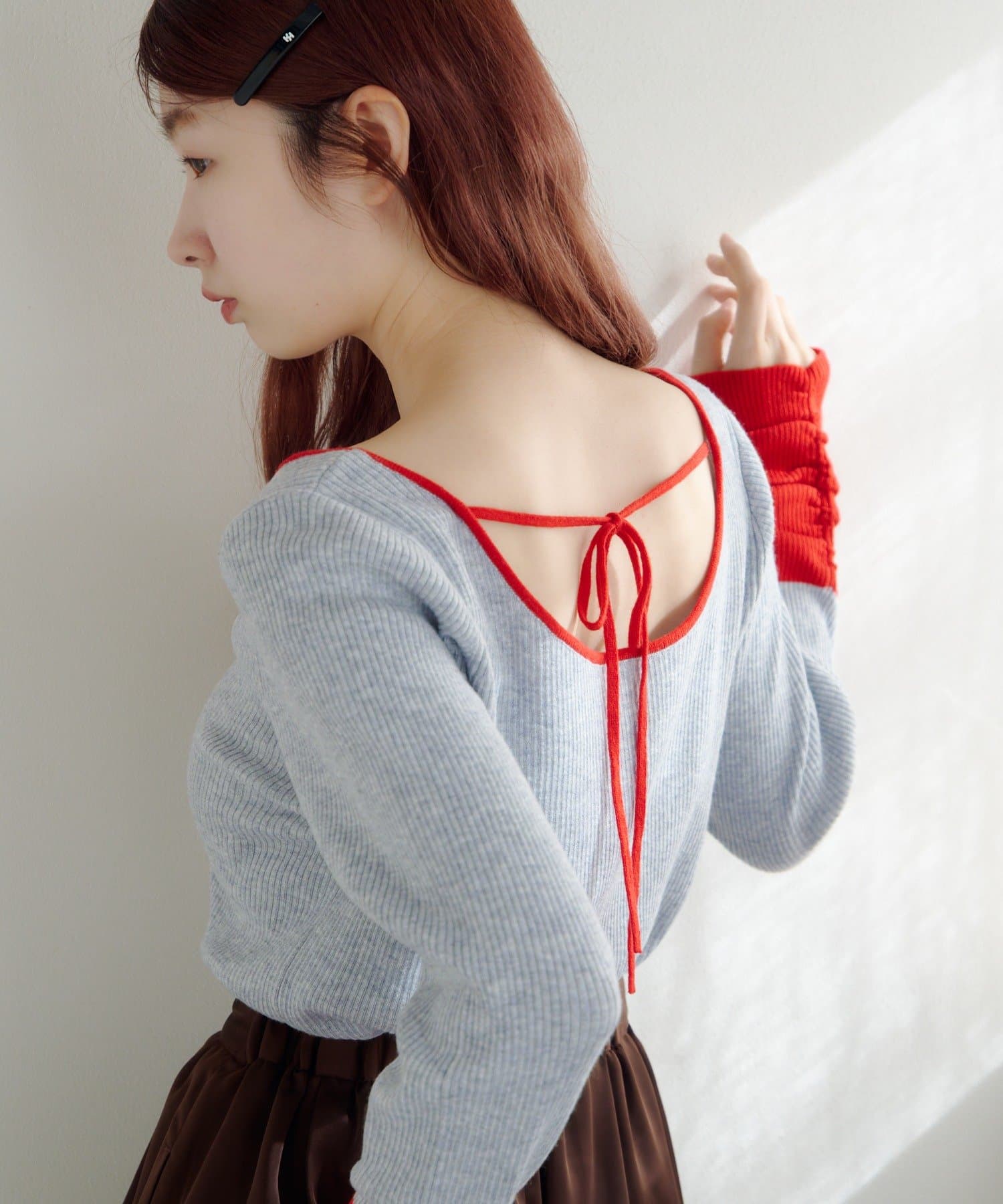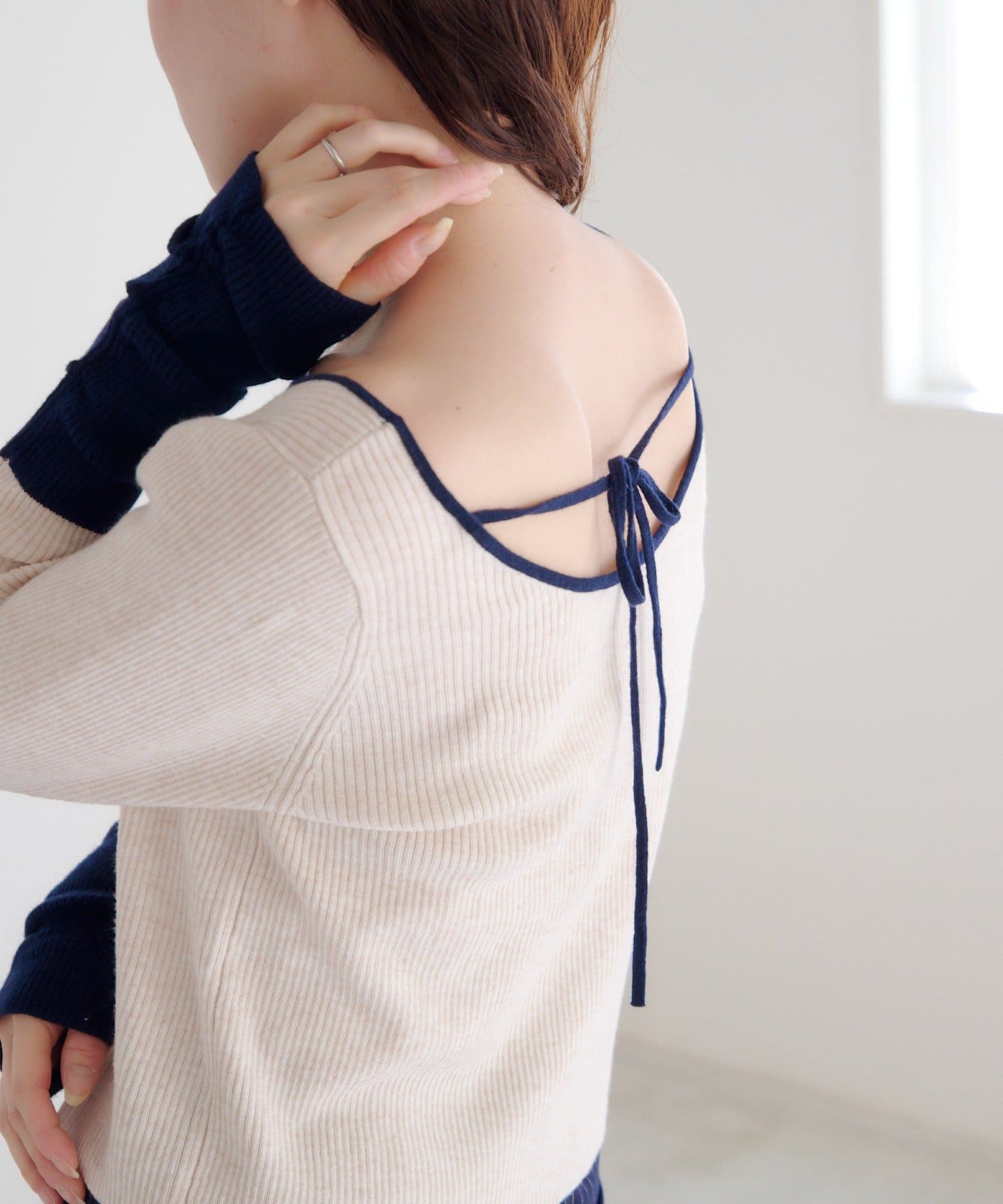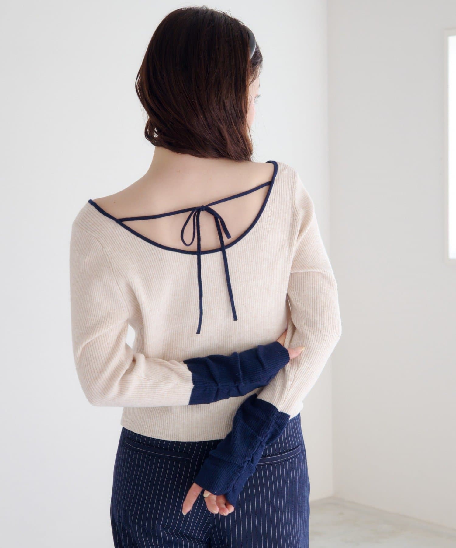 配色とバックリボンで、後ろ姿まで可愛いスクエアニット