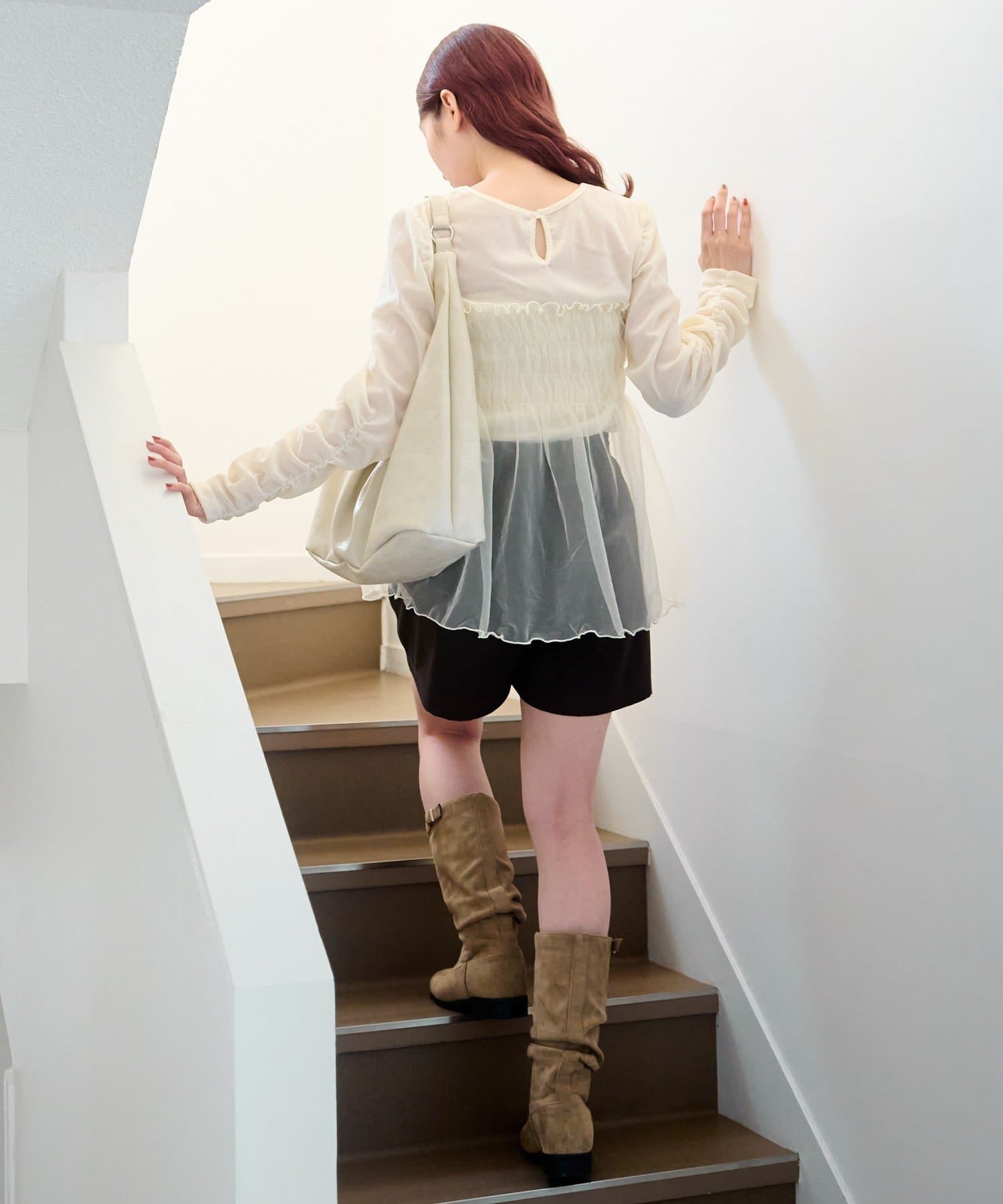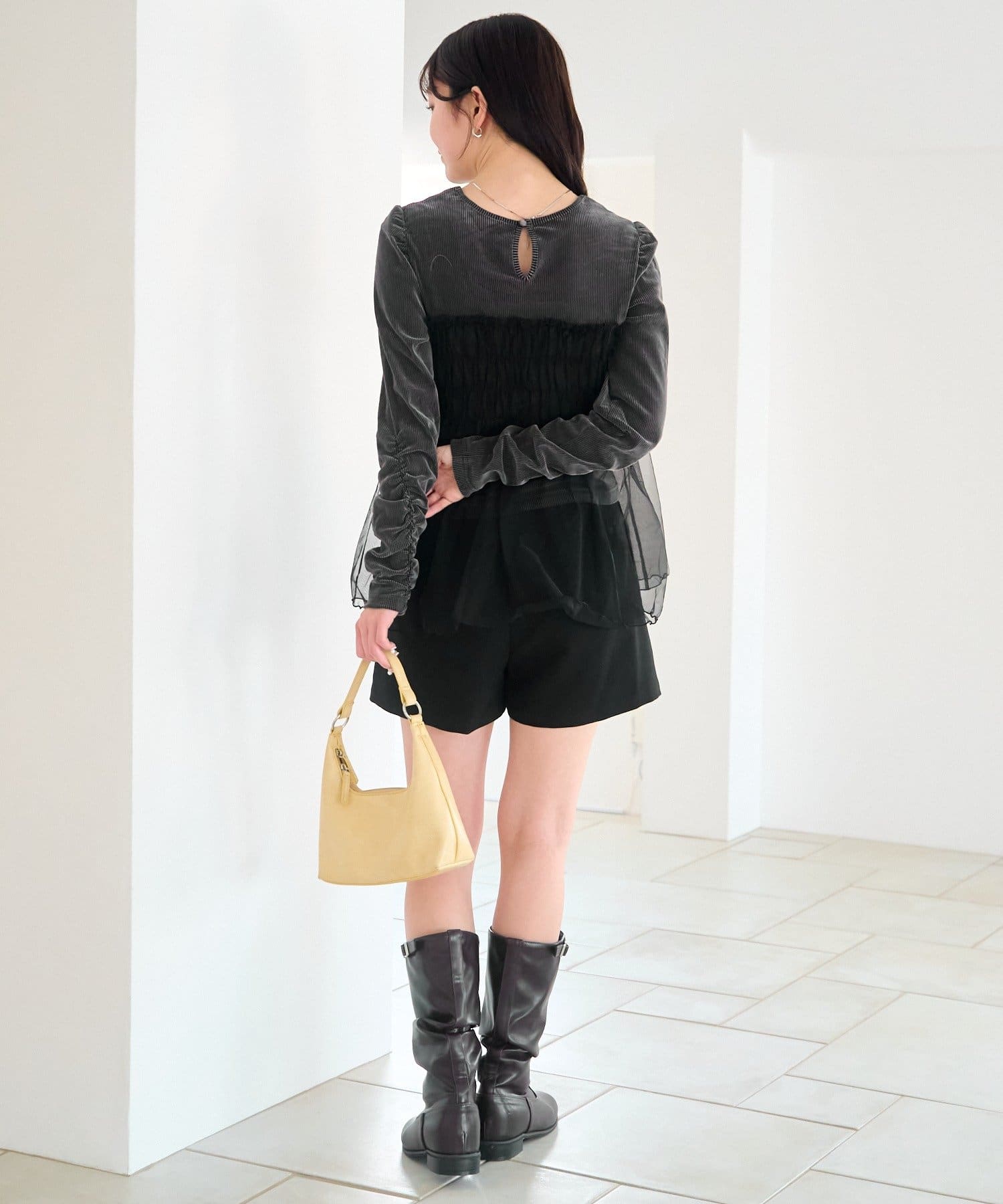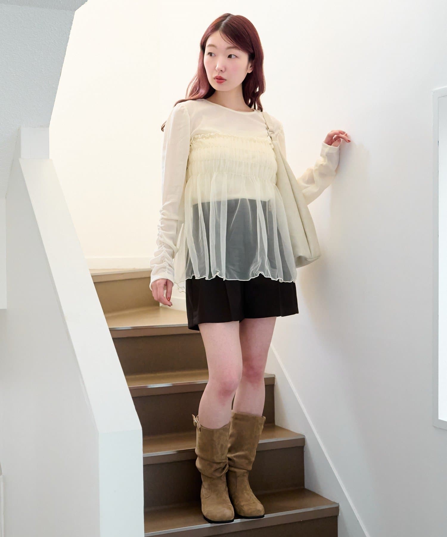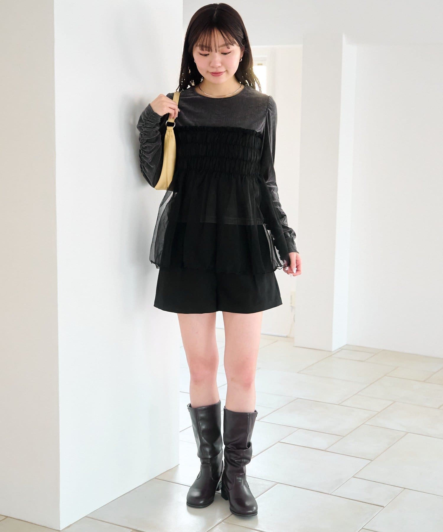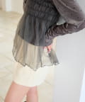 カットソーとチュールをドッキングした、一枚でレイヤードスタイルが完成するデザインプルオーバー。