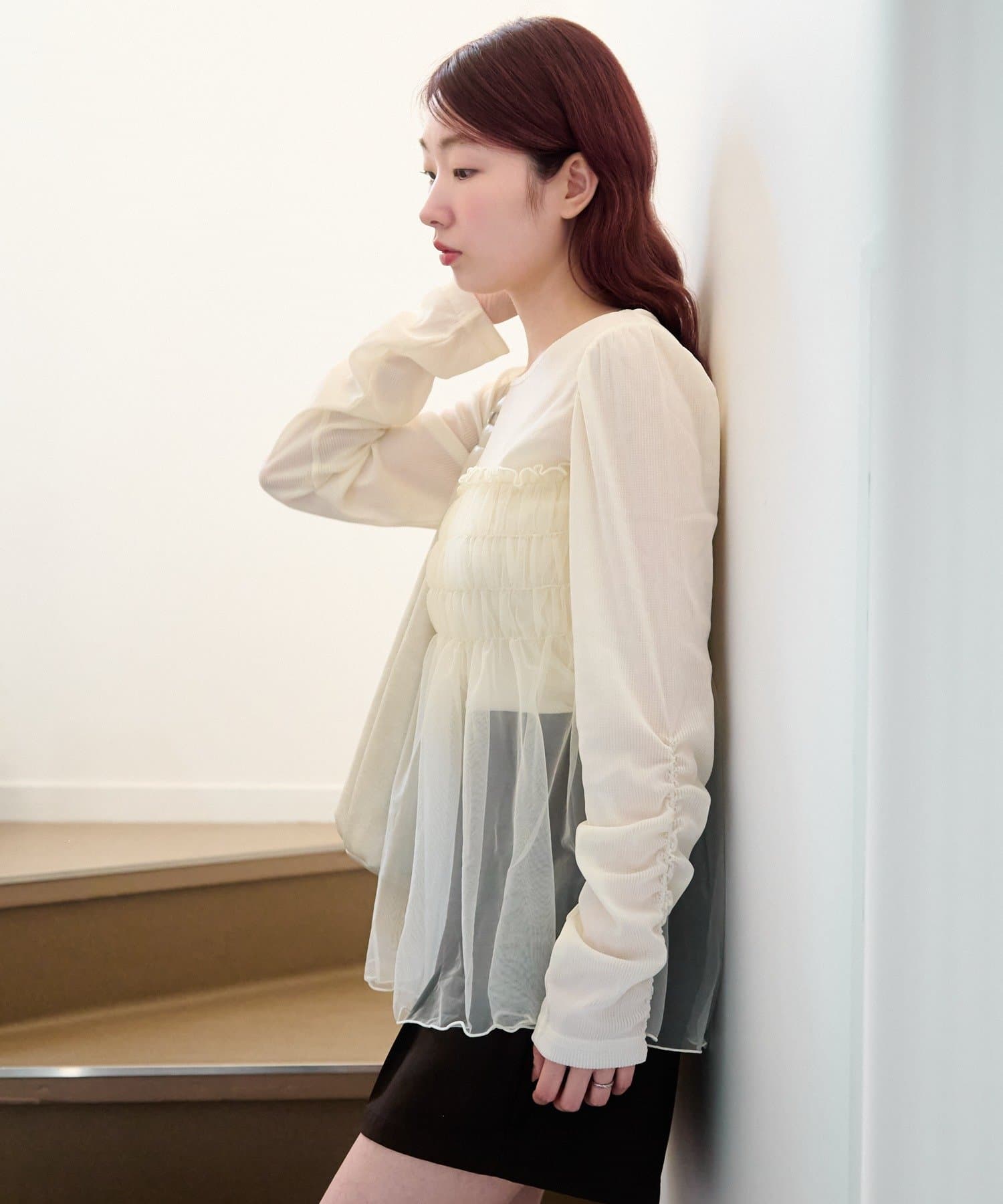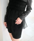身頃部分にはシャーリングを施したチュールを重ね、立体感のあるシルエットに。