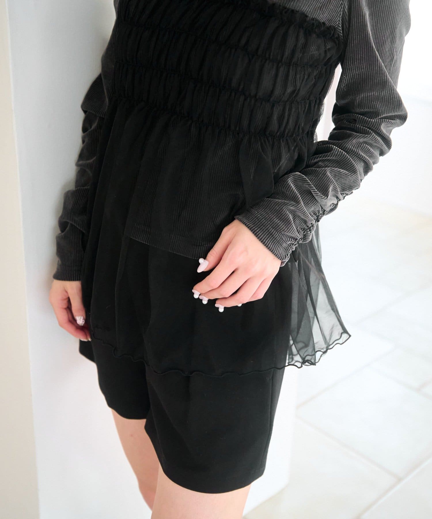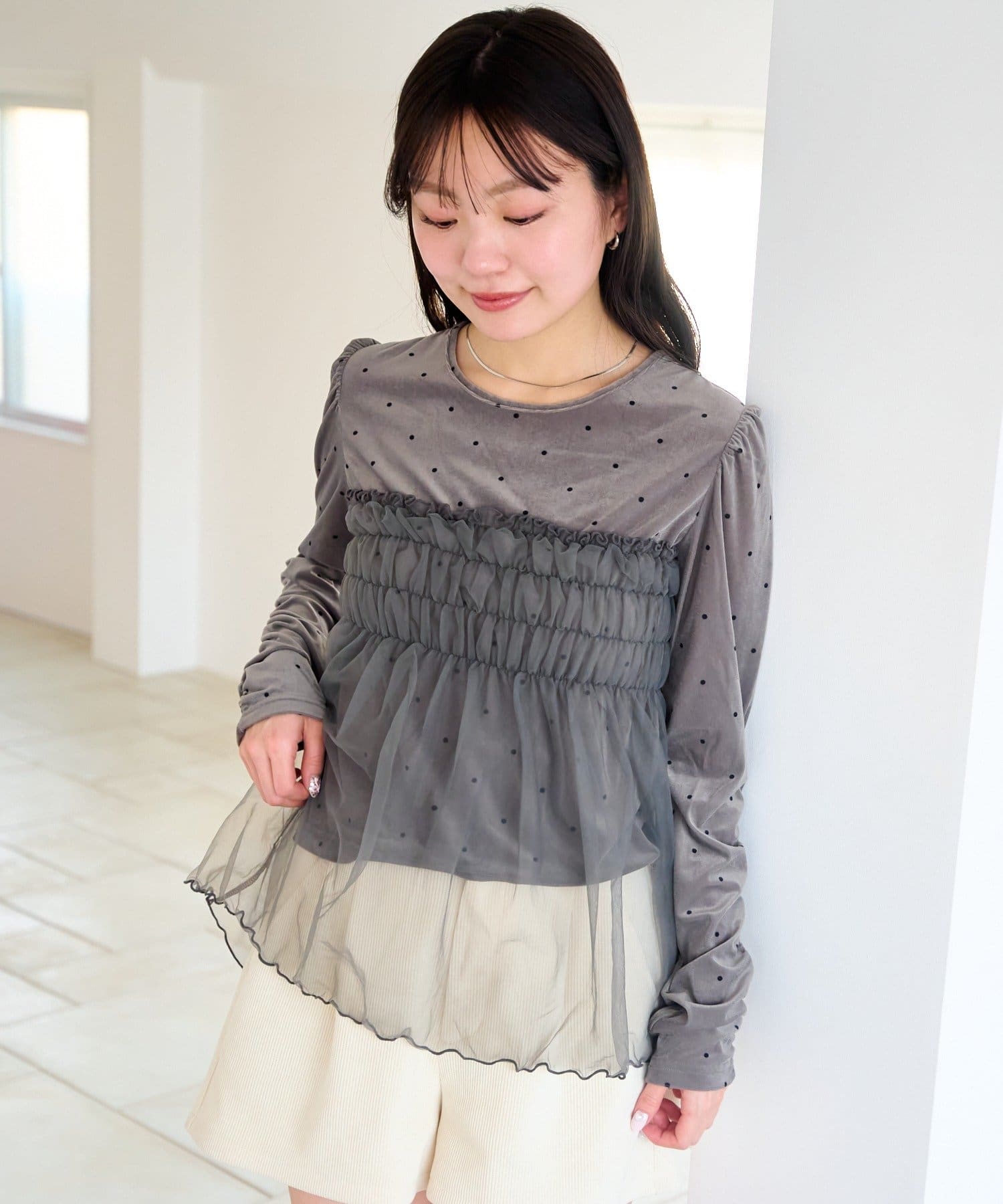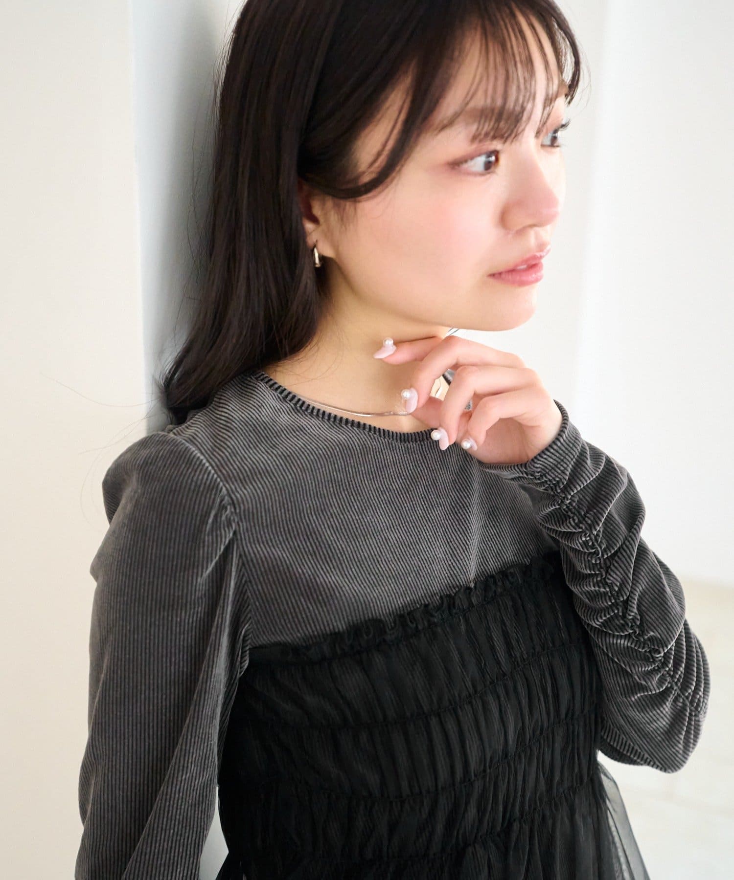 柔らかいカットソー素材に、軽やかなチュールを重ねた着心地◎。