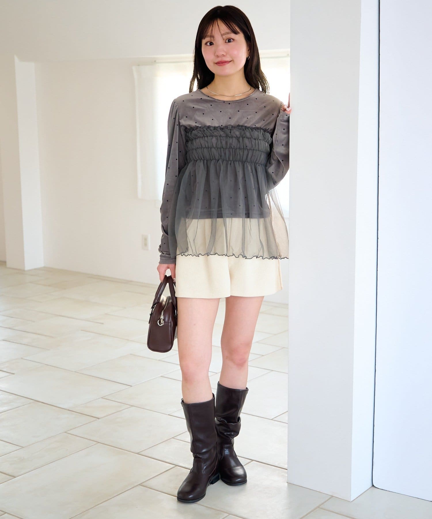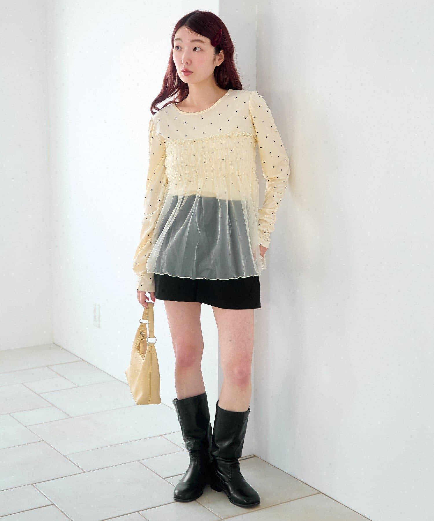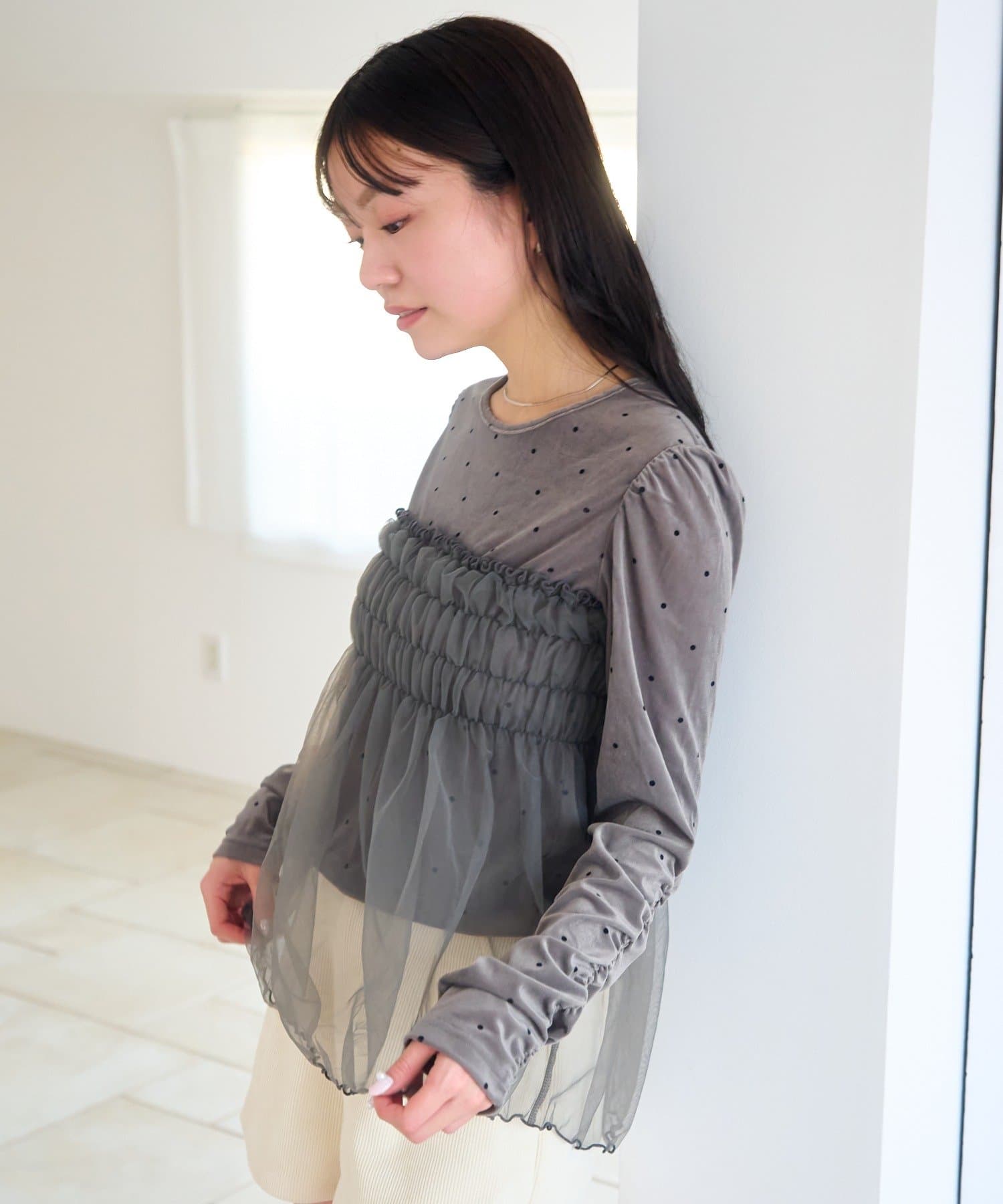 柔らかいカットソー素材に、軽やかなチュールを重ねた着心地◎。