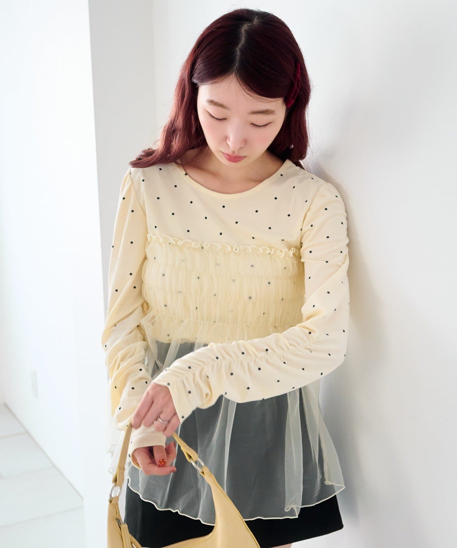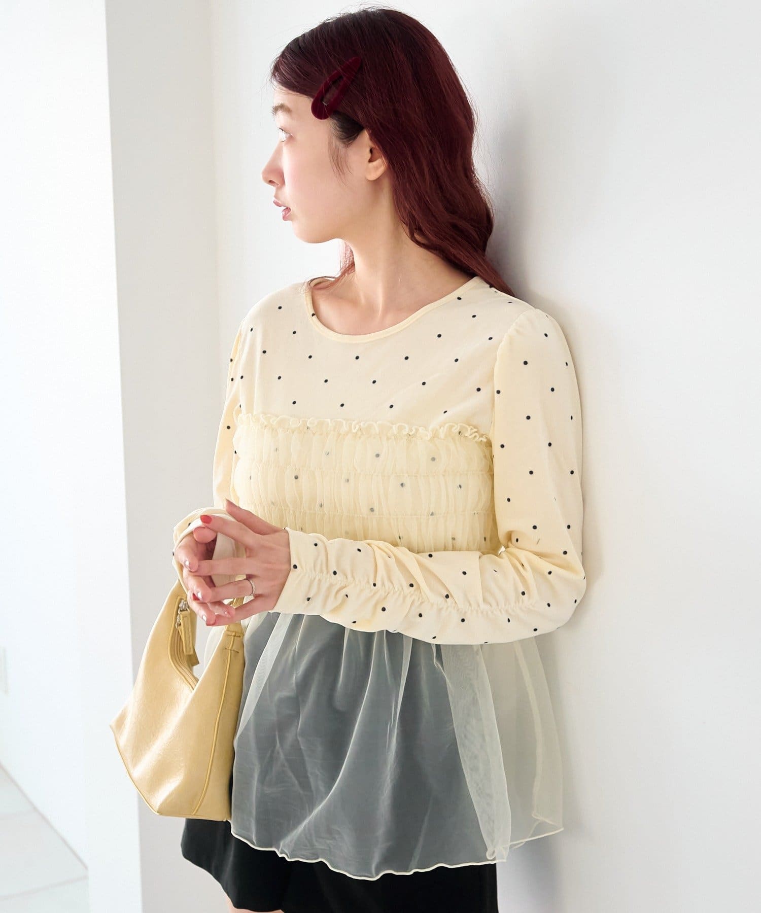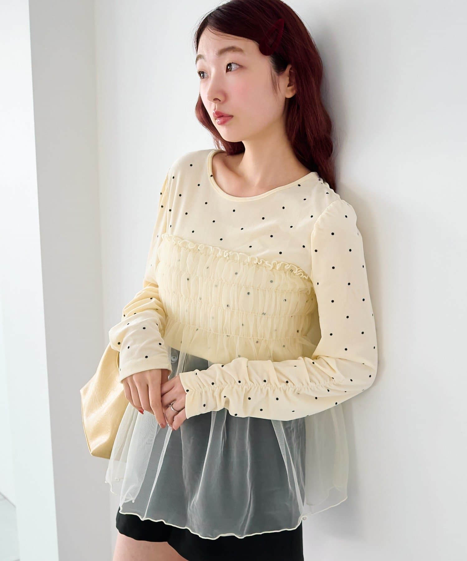 TOP > Kastane > レディース > トップス > Tシャツ/カットソー > 【1.1(木)12:00発売/WEB先行/ドット&ストライプ】 バリエーションチュールドッキングプルオーバー
