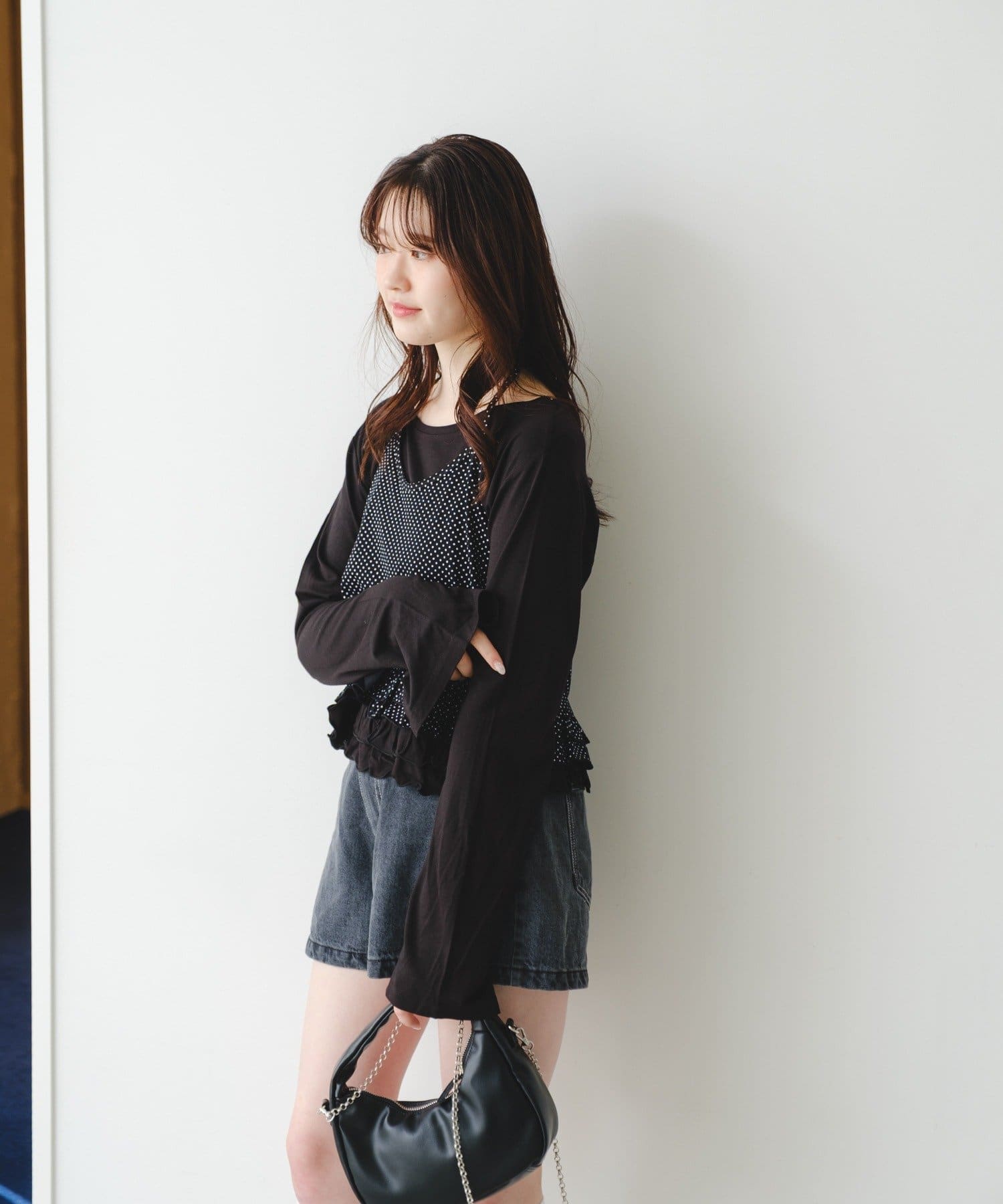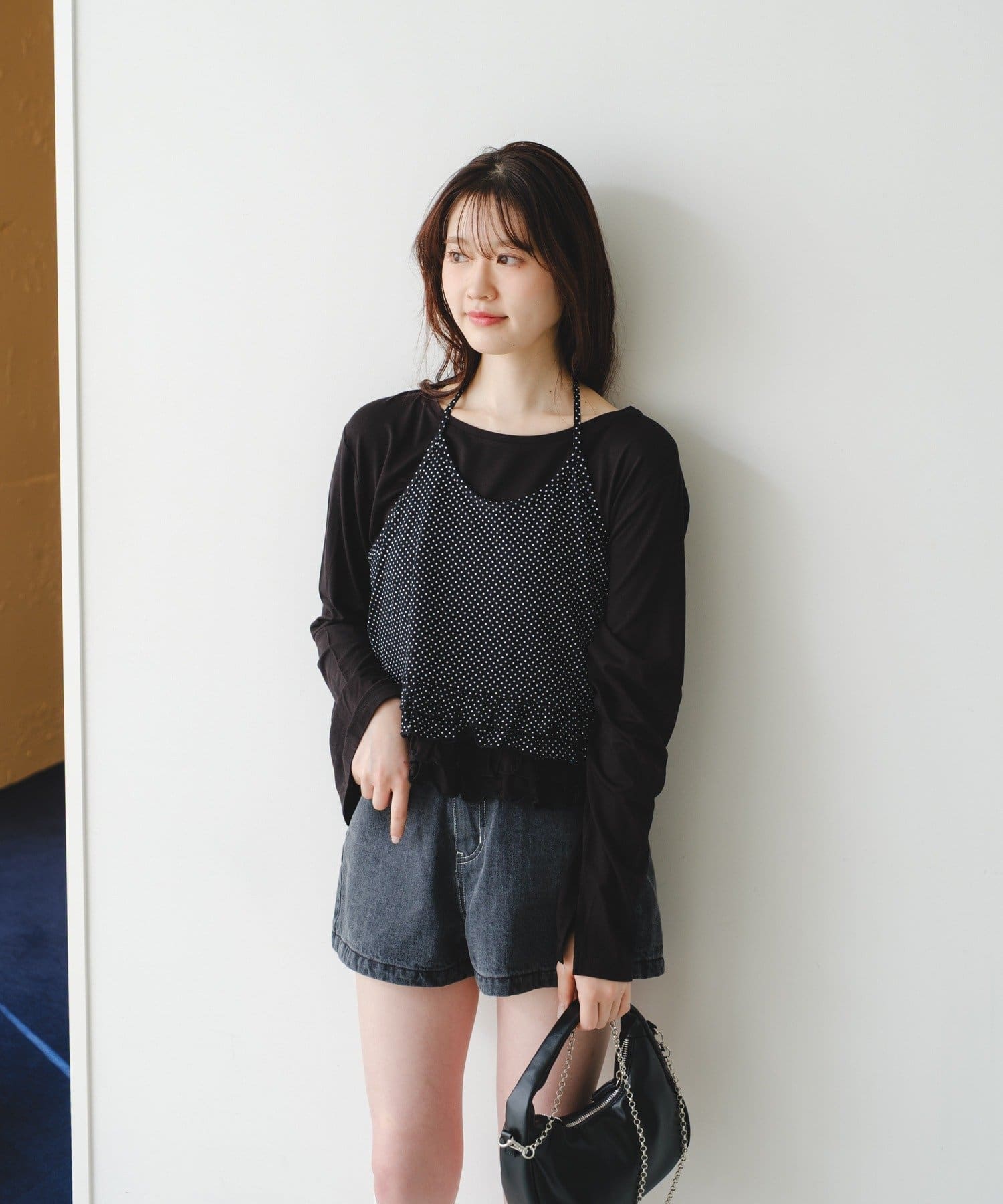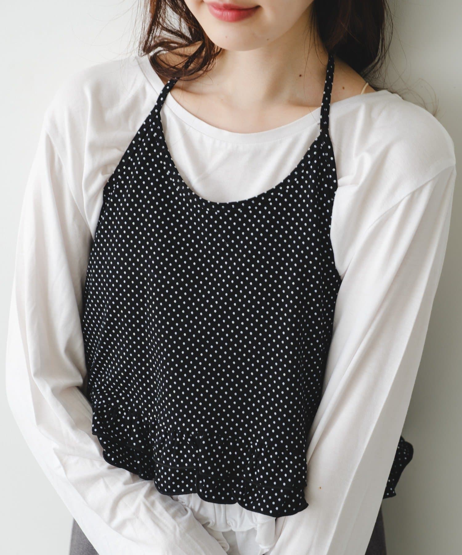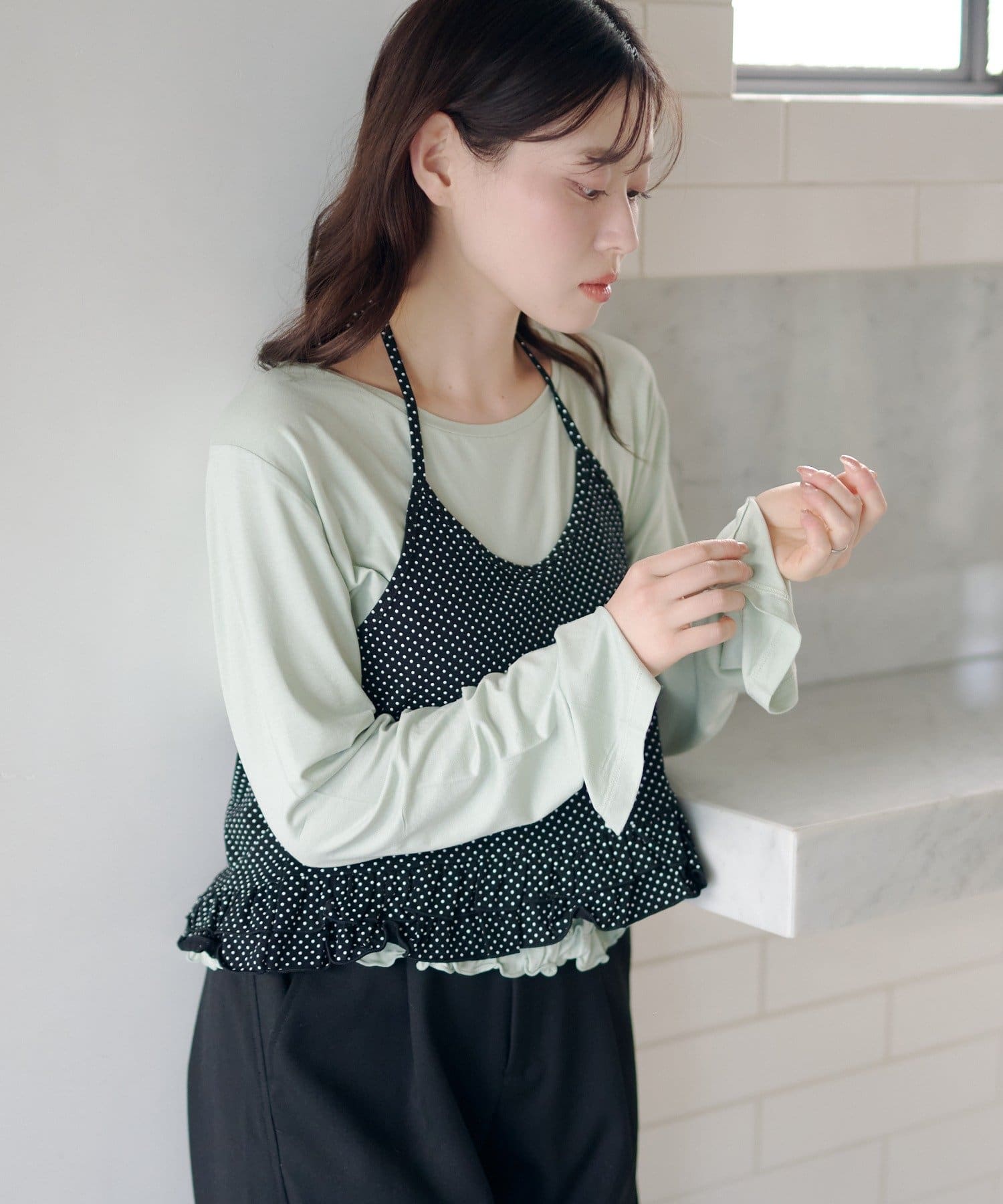 ドット柄のキャミソールとロンTがセットになった着映えアイテム。