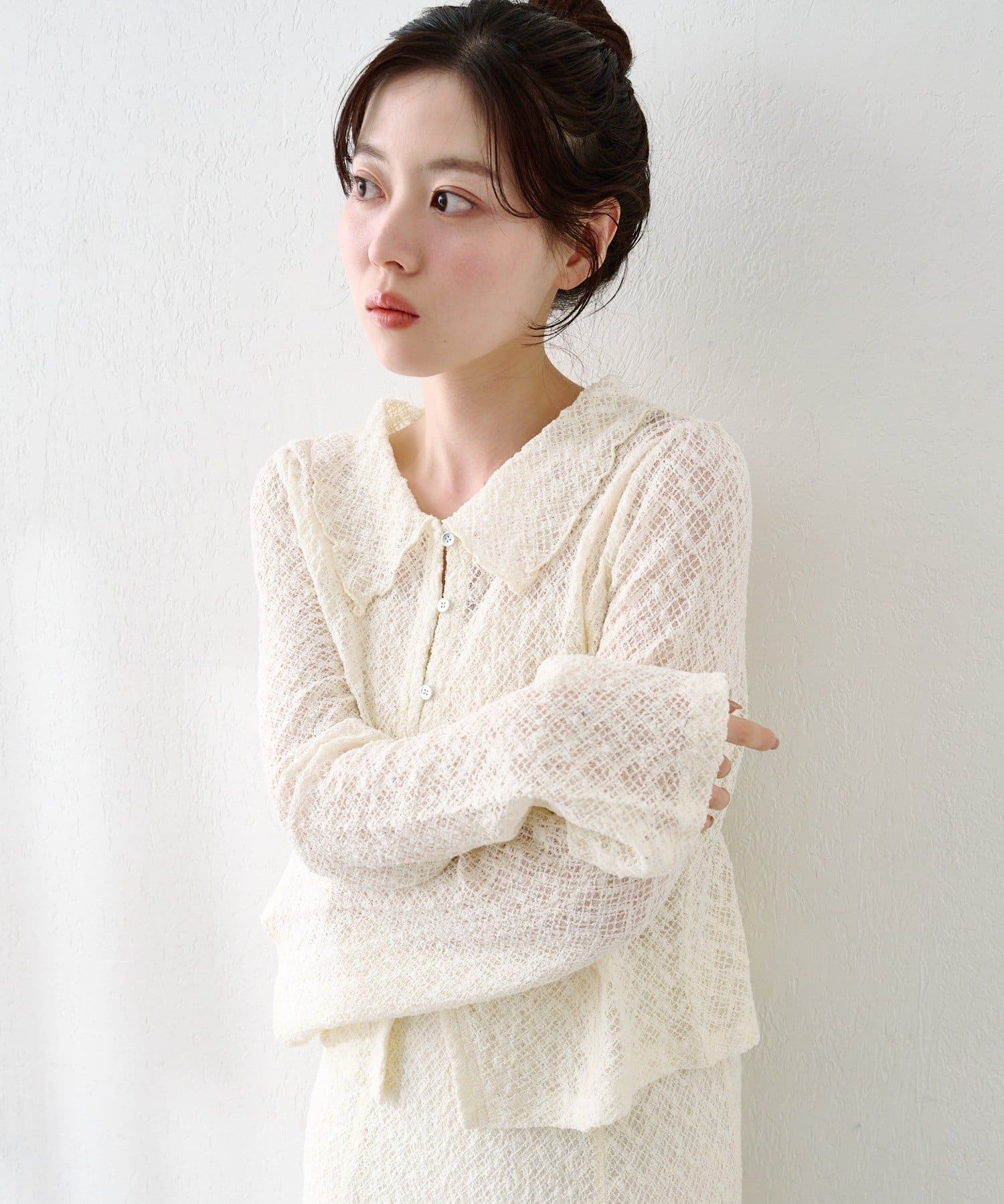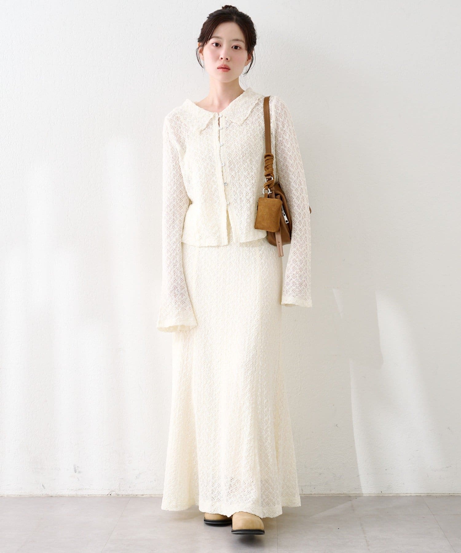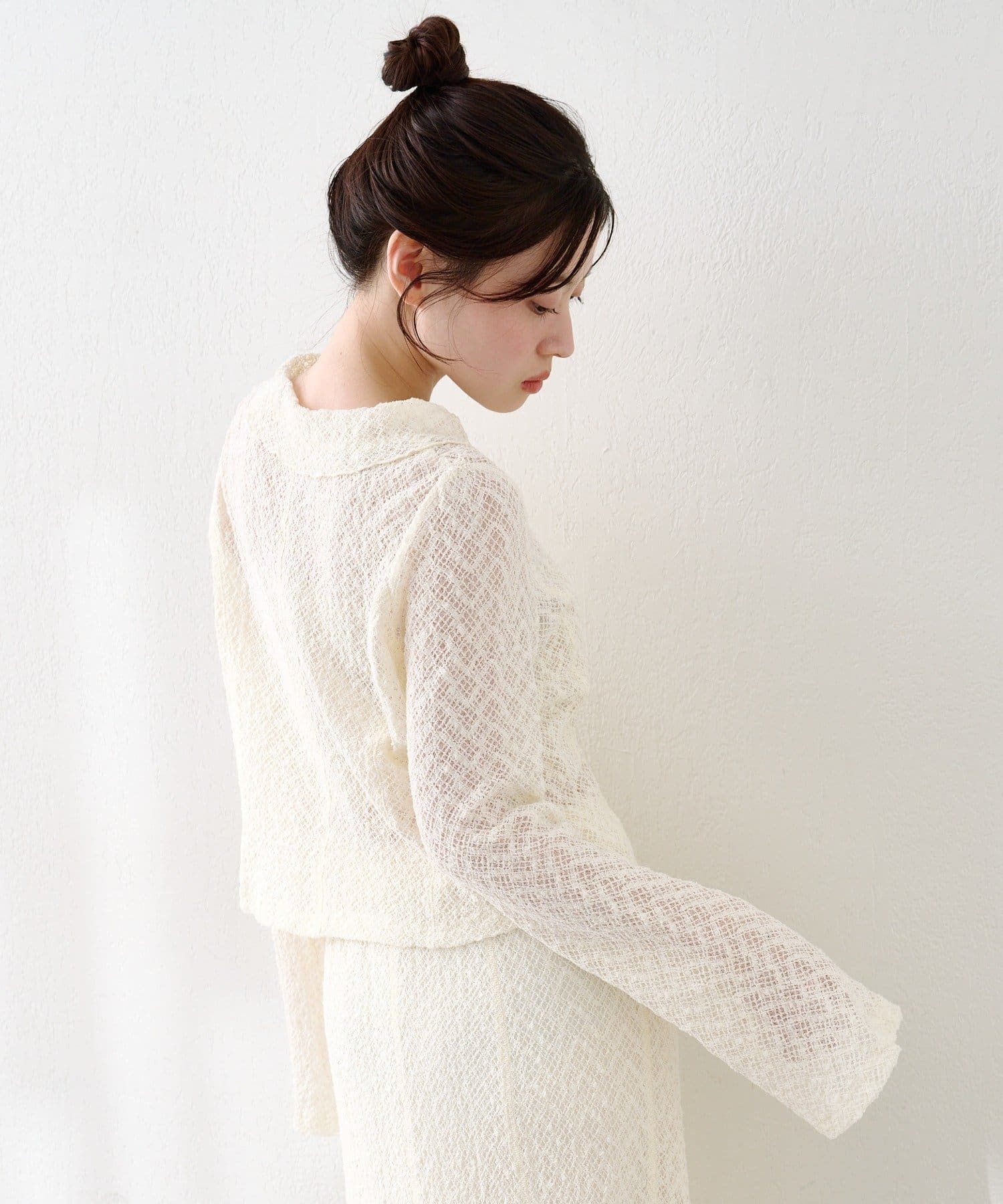 同素材スカートと合わせて上品なセットアップに。ヒールや小ぶりバッグを合わせればオケージョンにも◎。