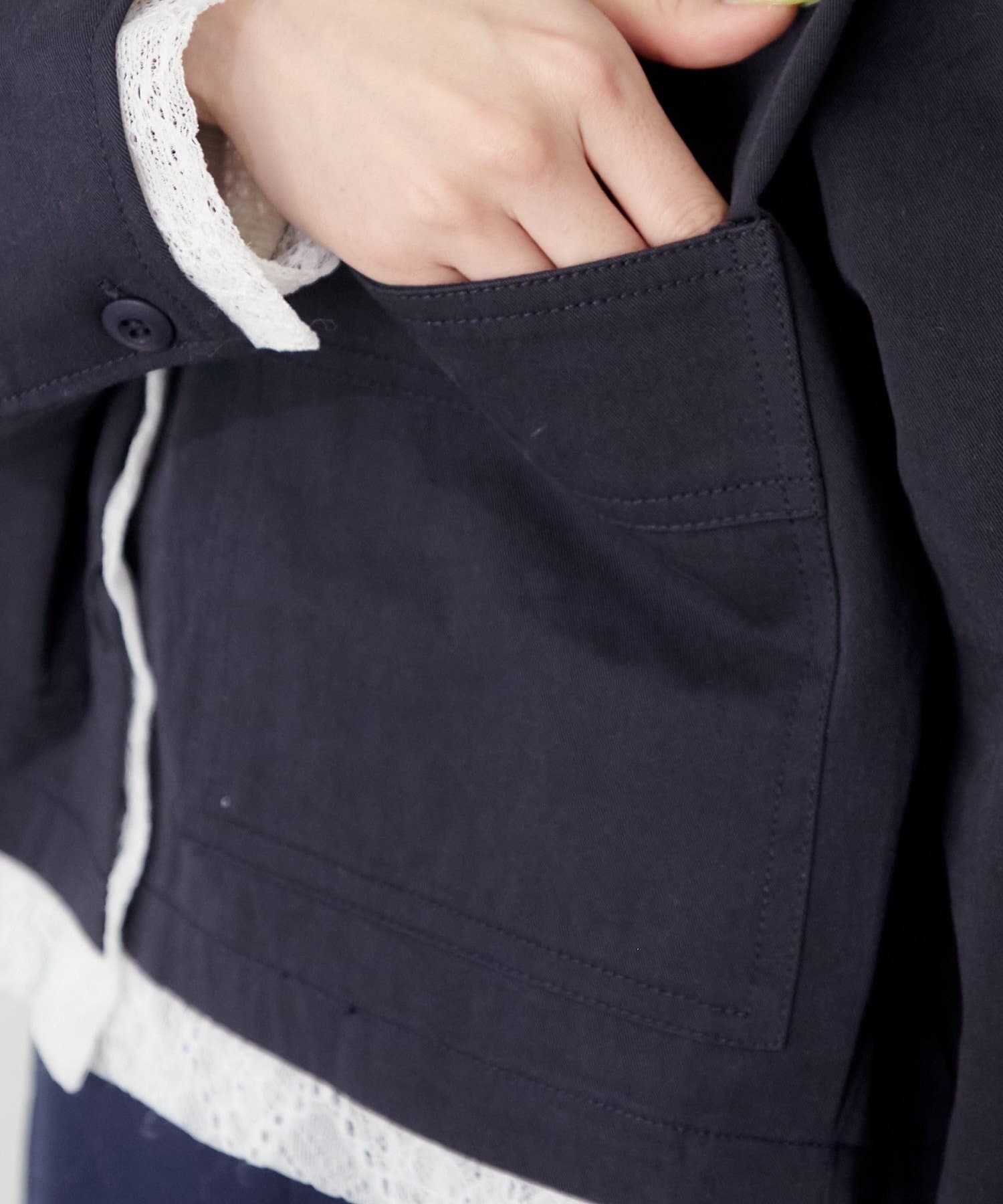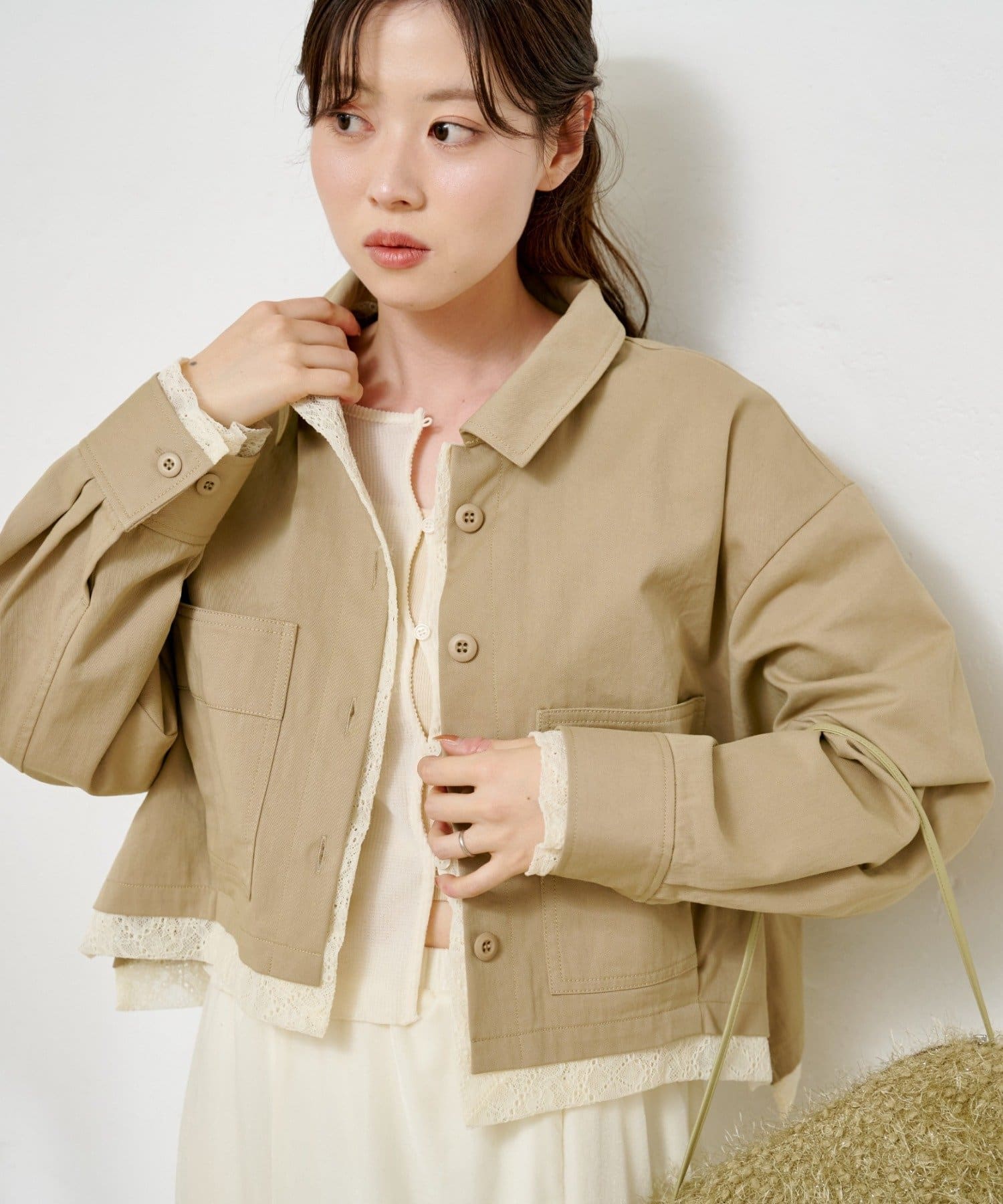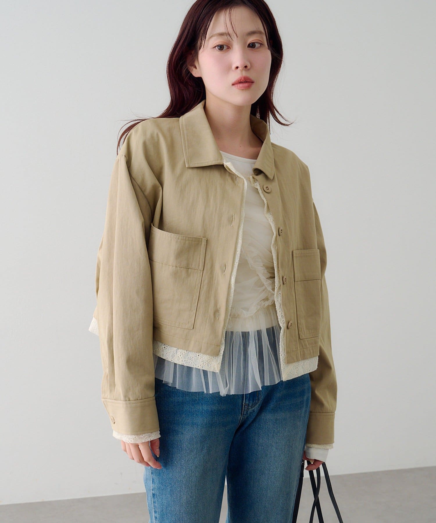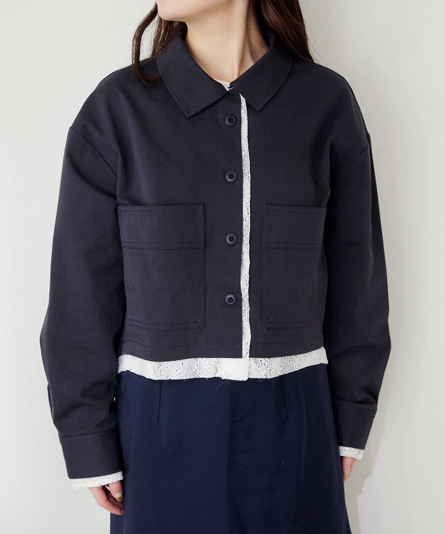 ショート丈のシャツジャケットに、ストライプとレースの異素材をレイヤードしたデザイン性のある一枚。
