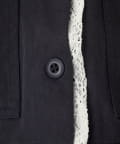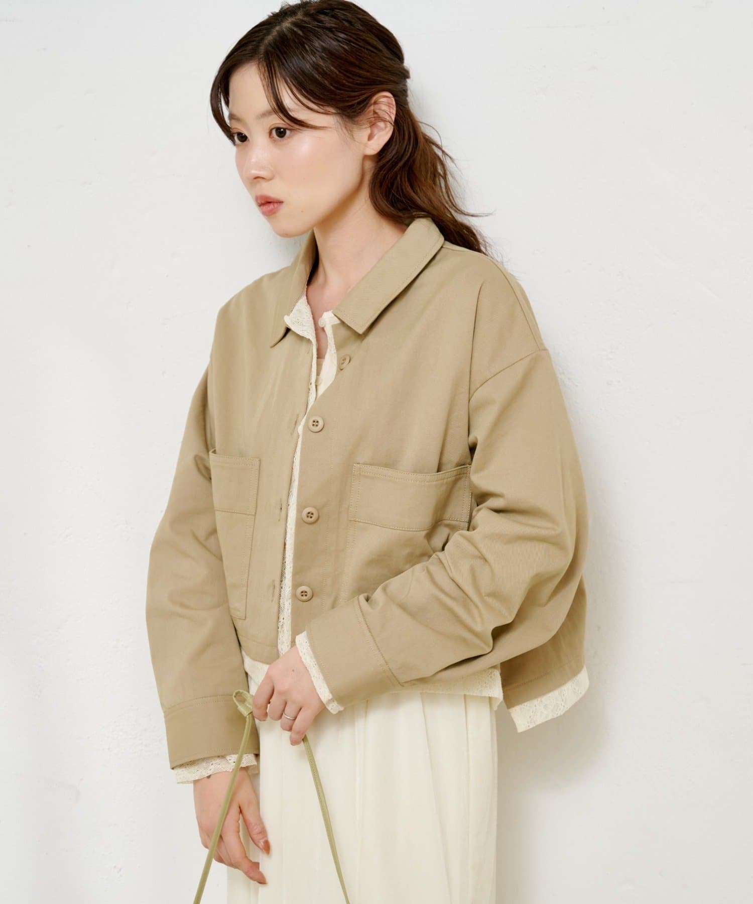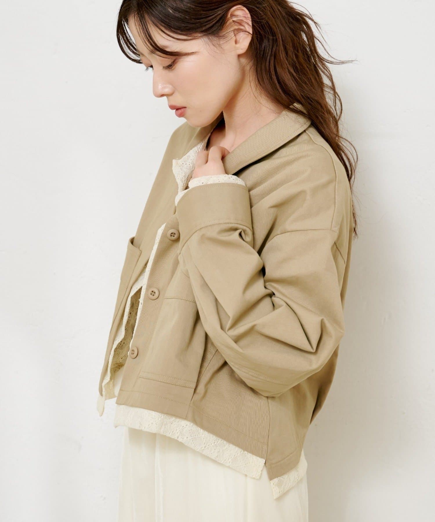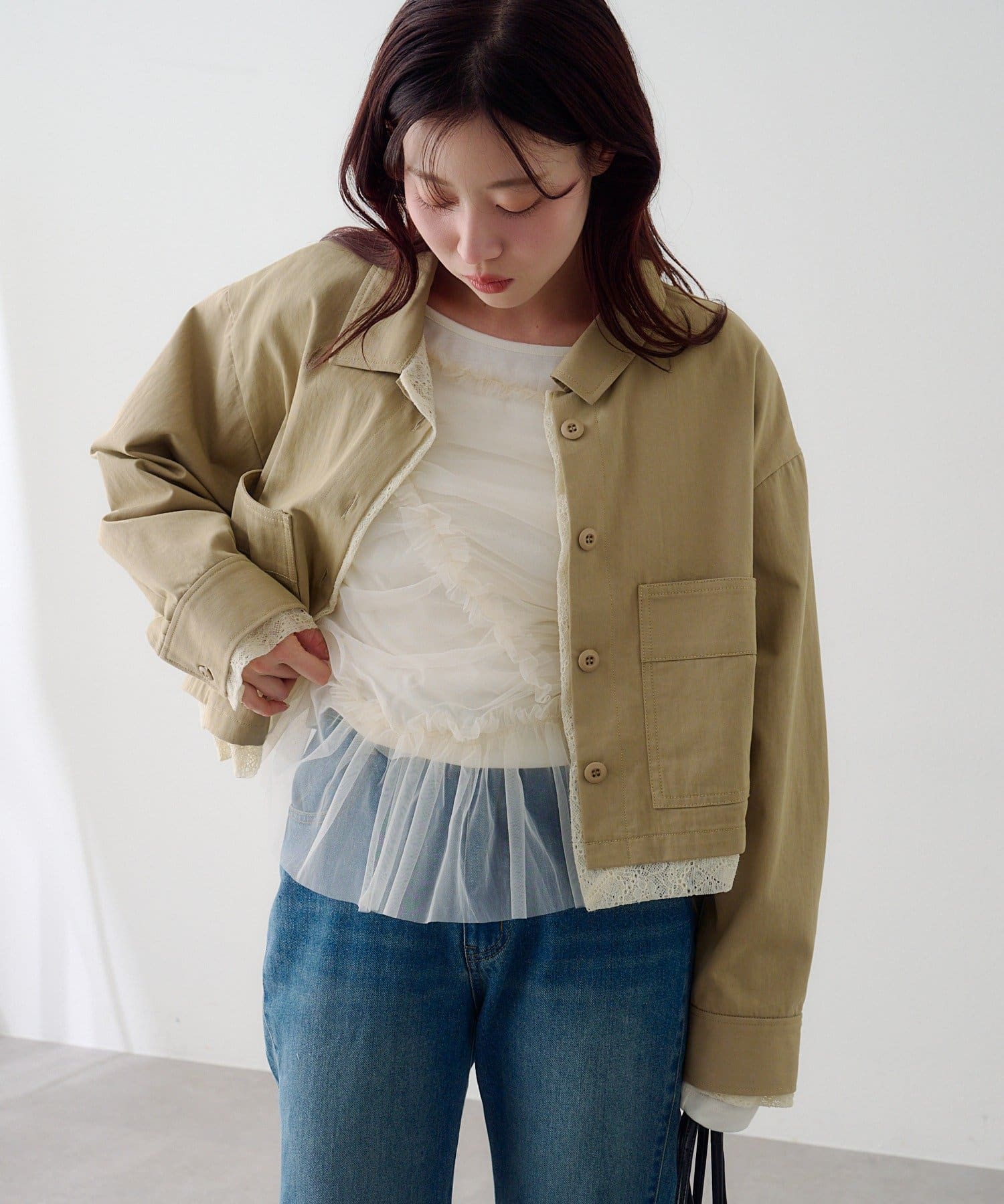 ショート丈のシャツジャケットに、ストライプとレースの異素材をレイヤードしたデザイン性のある一枚。